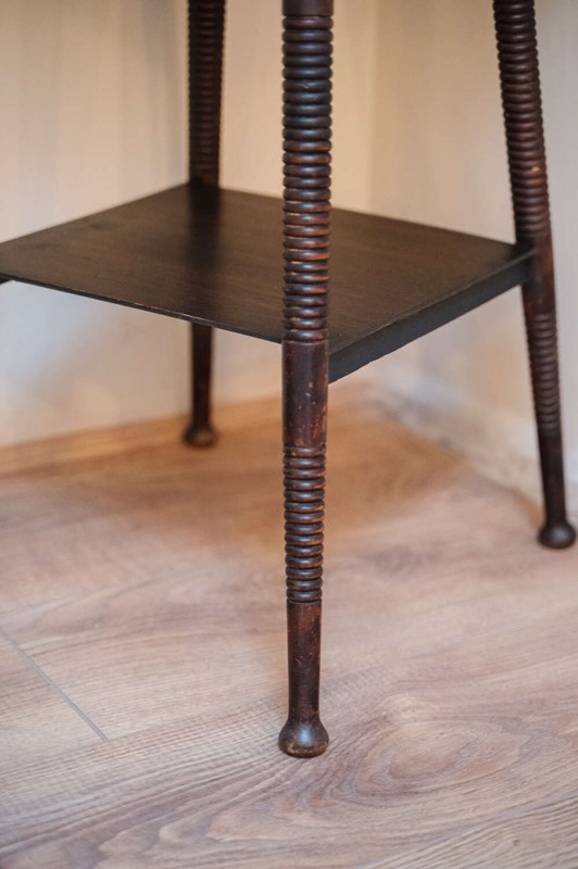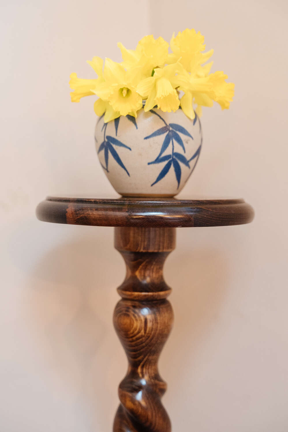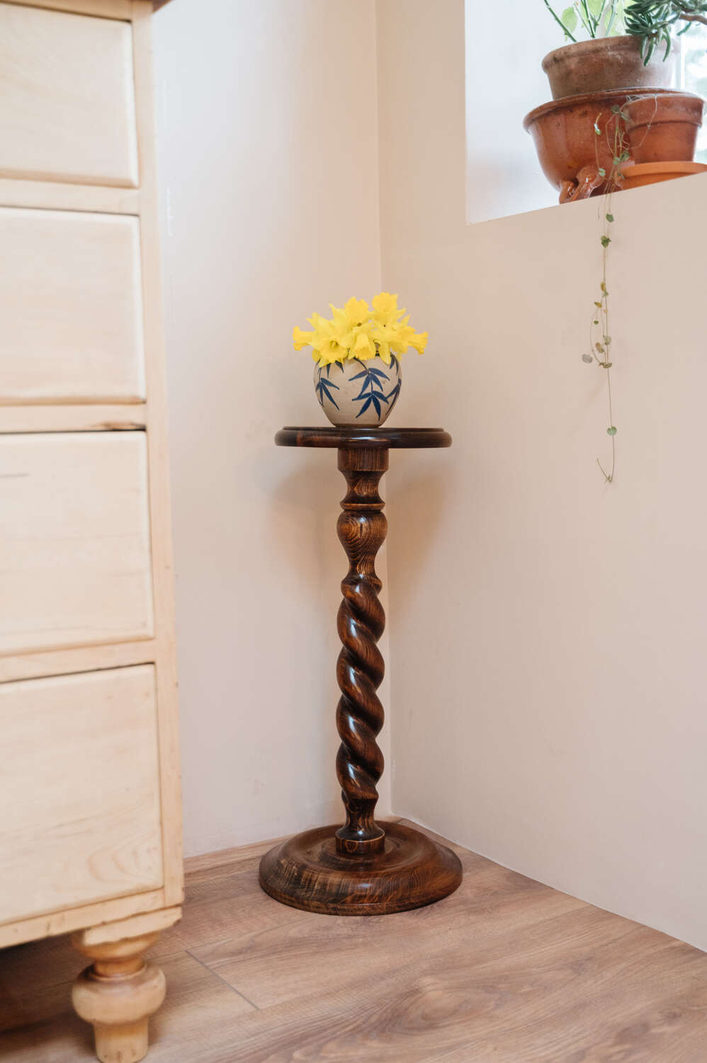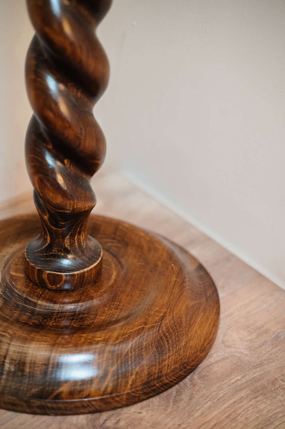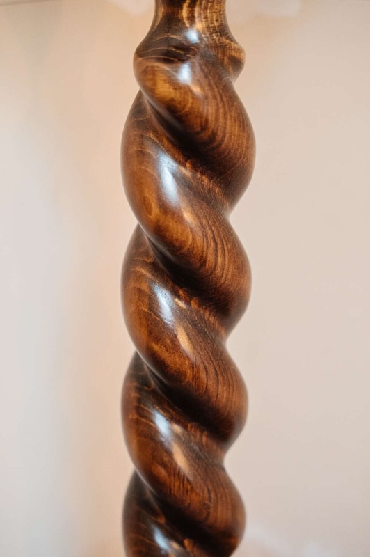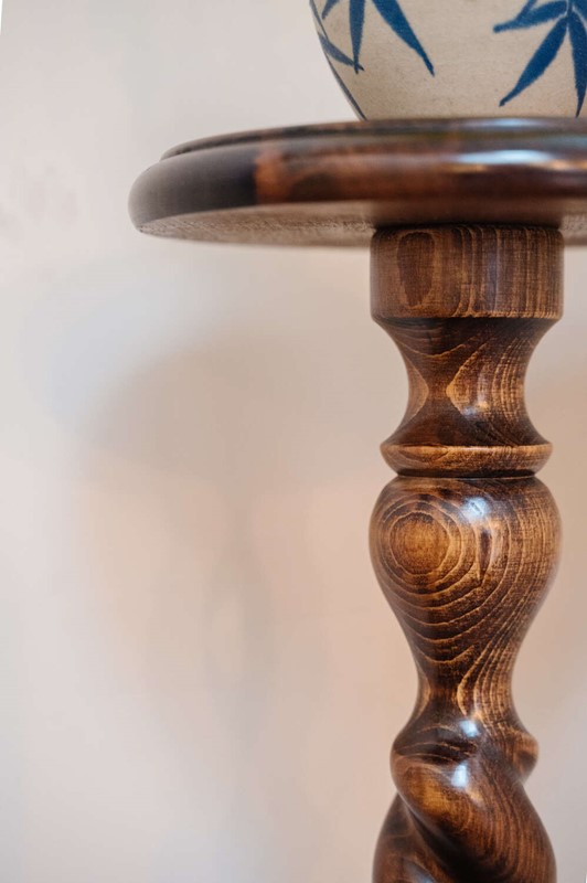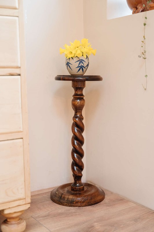 A classic wooden pedestal plant stand with a beautifully turned barley twist column and simple circular top. The slender proportions give it elegance, while the carved detailing adds depth and texture. Ideal for elevating a trailing plant, sculpture or lamp, bringing height and interest to a corner without overwhelming the space. The timber has a warm, time-softened tone that sits comfortably within traditional and country interiors. There is slight unevenness to the base in keeping with age, though it has been carefully levelled and stands sturdy and ready for use. A characterful piece with practical charm.Measurements: 64cm Tall x 24cm Wide top x cm 29cm wide bottom