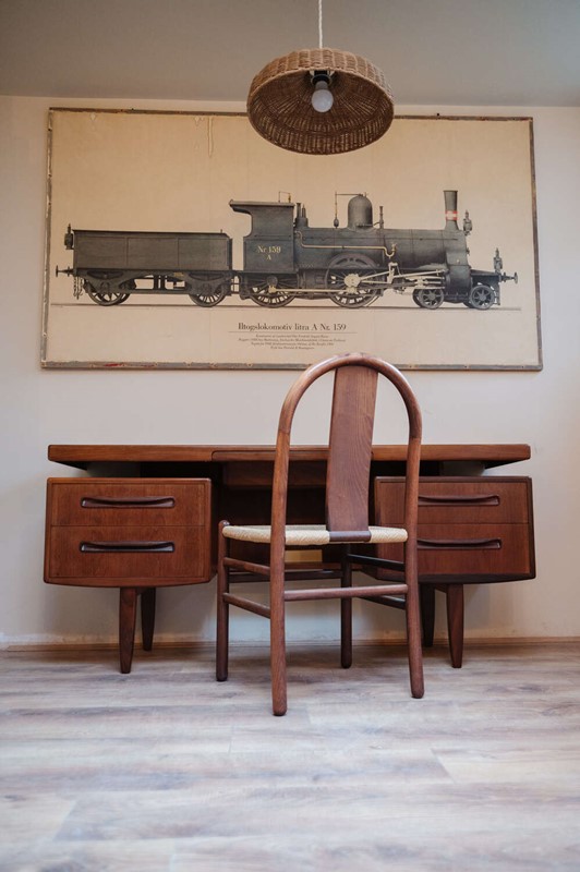 A classic G Plan Fresco desk in warm teak, featuring the signature floating top and clean mid-century lines the range is known for. Elegant yet practical, it works beautifully as either a desk or dressing table.The teak has a good overall finish with gentle surface markings in keeping with age, one small hole that has been filled, visible in the photographs. The drawers run smoothly and the structure is solid and reassuring. A previous owner has discreetly cut a small hole to the underside to allow for a plug socket; this remains hidden in use and does not affect functionality.A well-proportioned and timeless piece — understated, useful, and easy to place within both mid-century and modern country interiors.Measurements: 70.5cm Tall (65cm leg gap) x 152.5cm Wide (51cm leg gap) x 46cm Deep