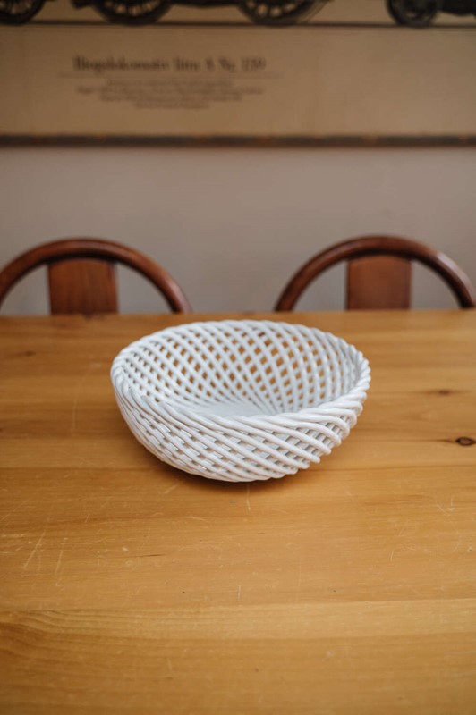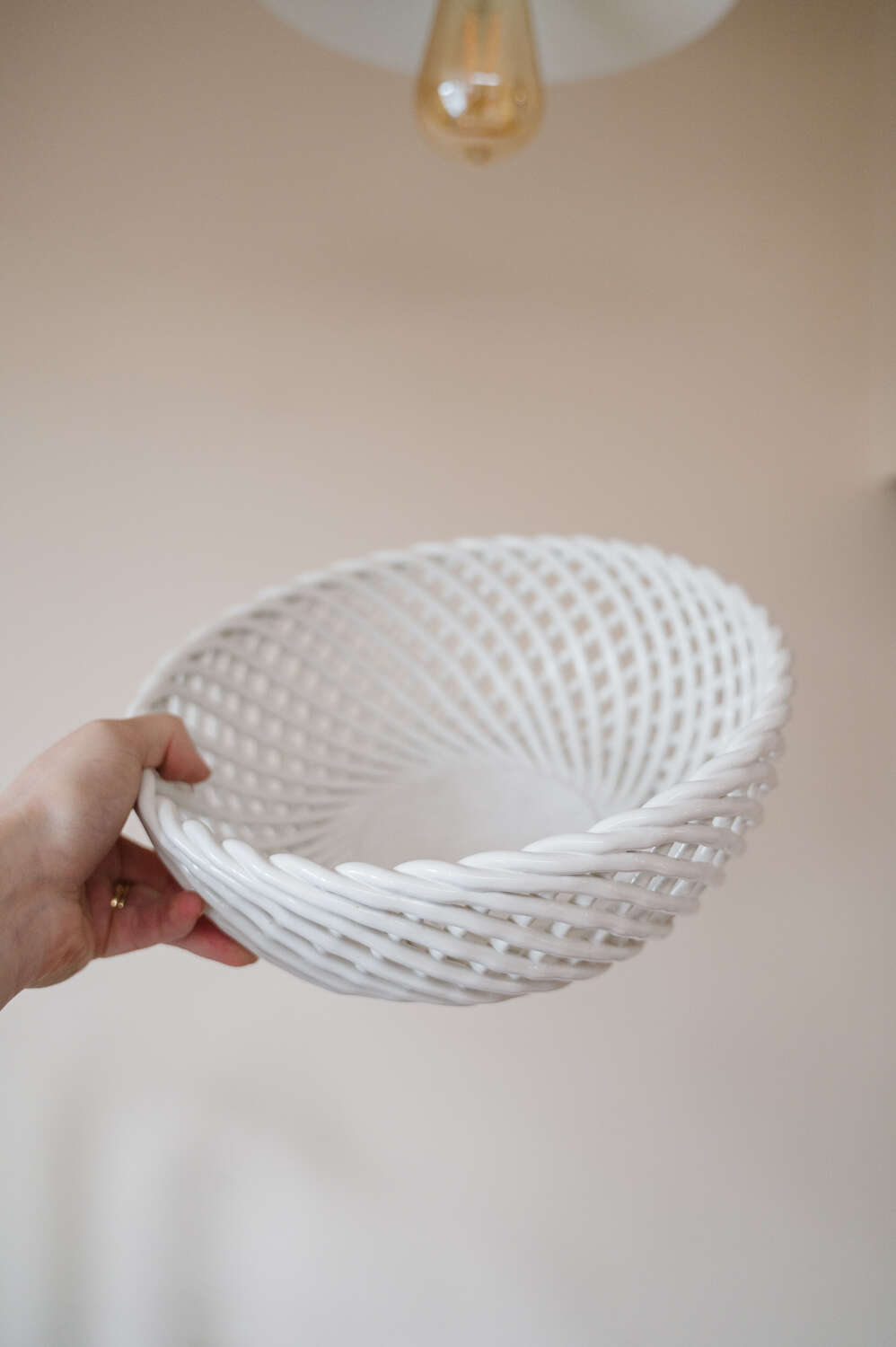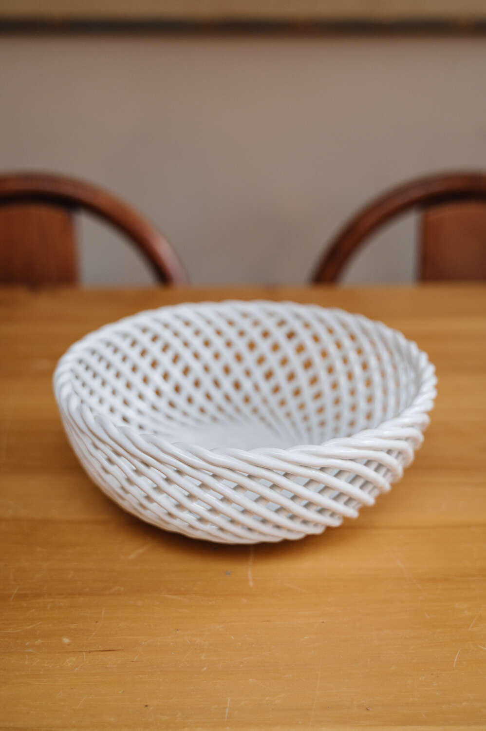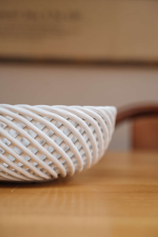 A beautifully made Italian porcelain fruit bowl with an open lattice weave design and softly rounded form. The pierced pattern gives it lightness and texture, allowing it to feel decorative even when empty. Marked to the underside with an ‘ATN’ sticker, the bowl has a clean, sculptural quality typical of mid to late 20th-century Italian tableware. Its gentle cream tone makes it easy to place — lovely centred on a kitchen table, styled on open shelving, or used simply for fruit as intended. In good vintage condition with light surface character in keeping with age. A practical piece with a quietly decorative edge.Measurements: 10cm Tall x 26cm Wide x 26cm Deep