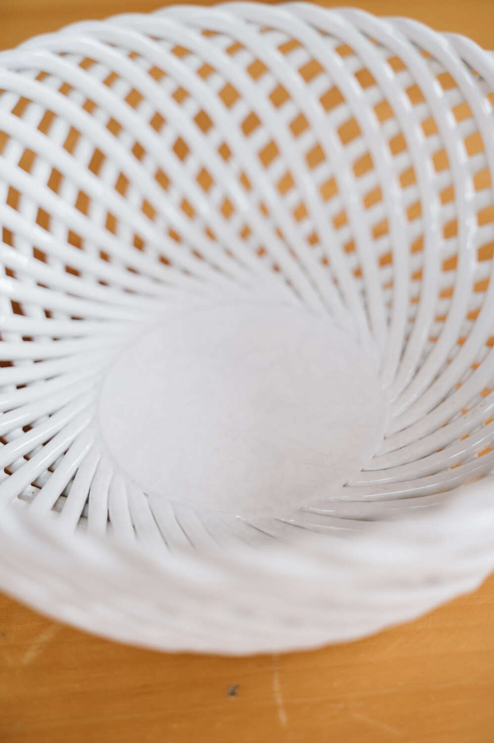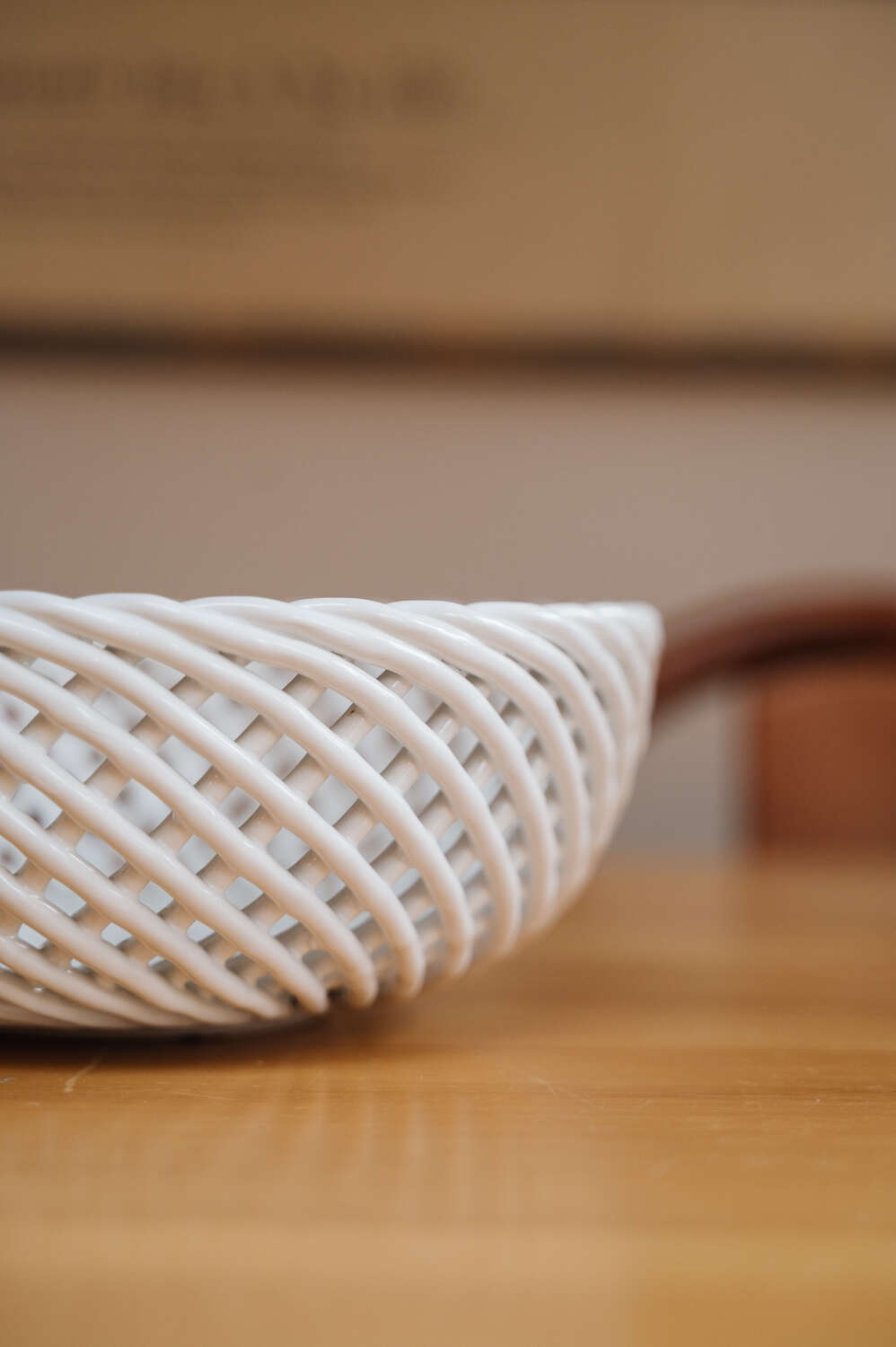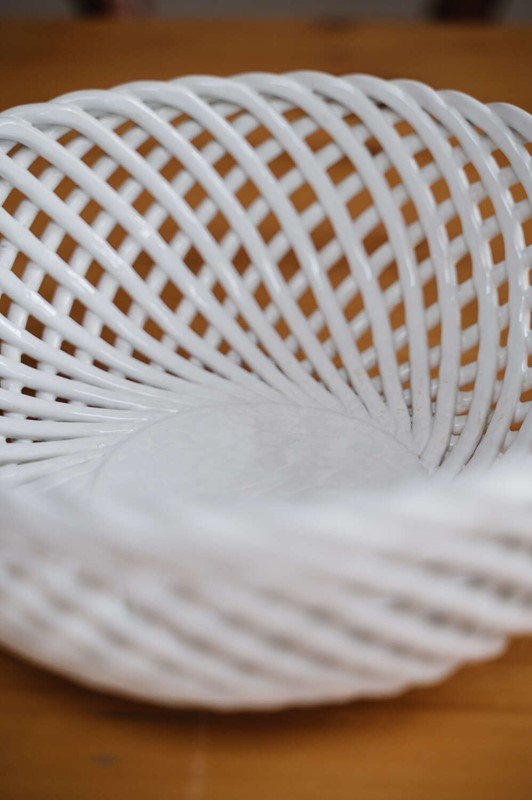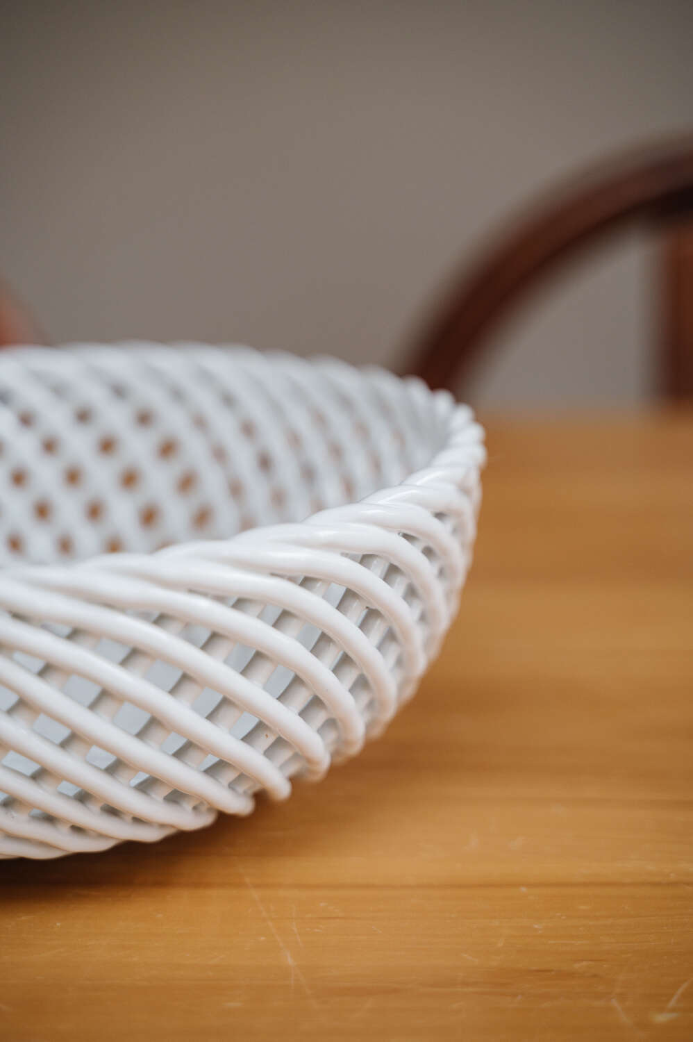 A beautifully made Italian porcelain fruit bowl with an open lattice weave design and softly rounded form. The pierced pattern gives it lightness and texture, allowing it to feel decorative even when empty. Marked to the underside with an ‘ATN’ sticker, the bowl has a clean, sculptural quality typical of mid to late 20th-century Italian tableware. Its gentle cream tone makes it easy to place — lovely centred on a kitchen table, styled on open shelving, or used simply for fruit as intended. In good vintage condition with light surface character in keeping with age. A practical piece with a quietly decorative edge.Measurements: 10cm Tall x 26cm Wide x 26cm Deep
