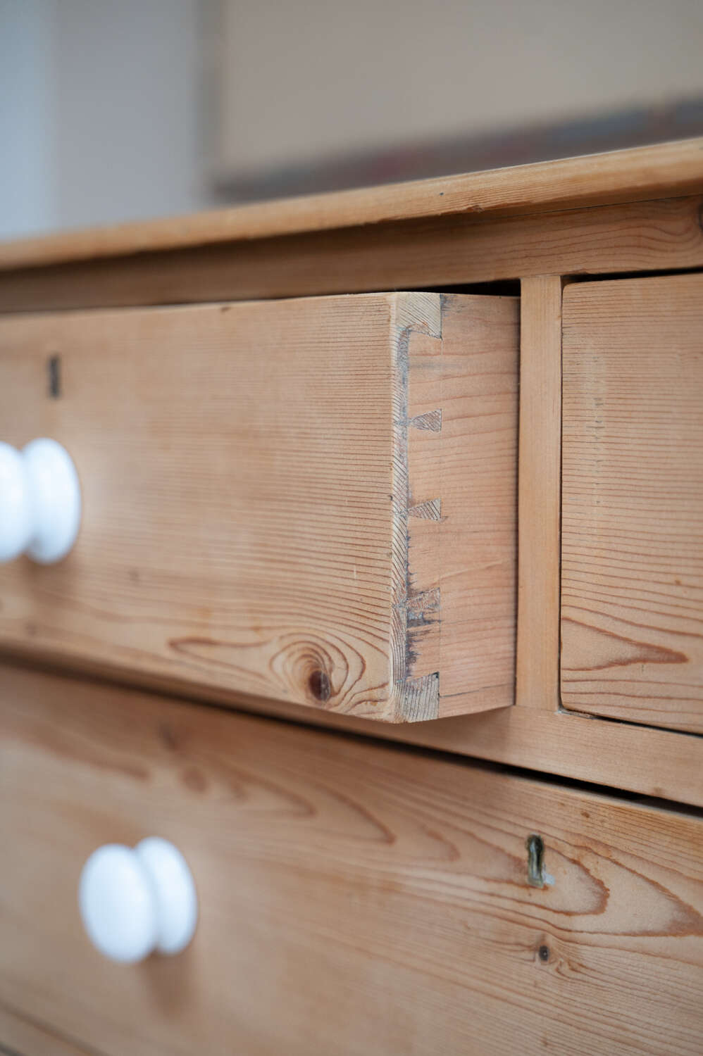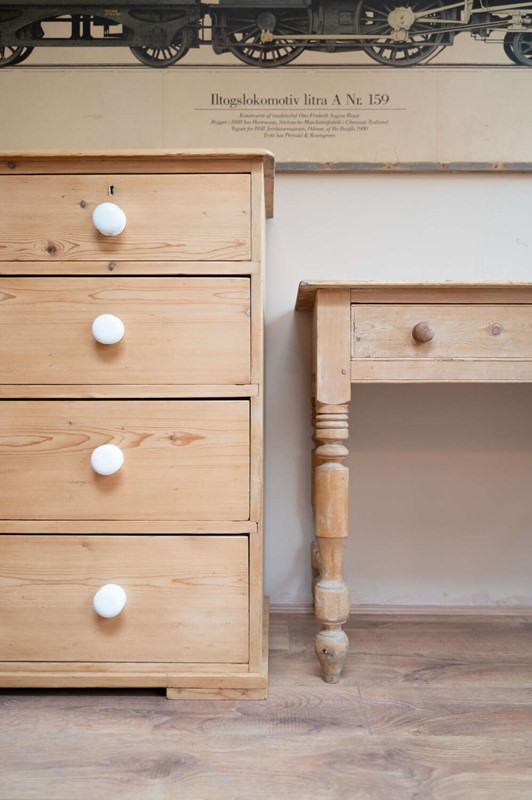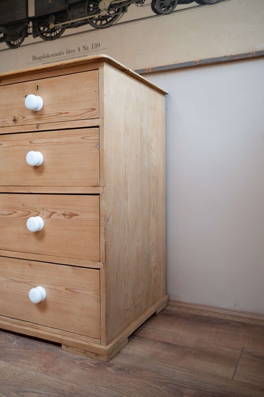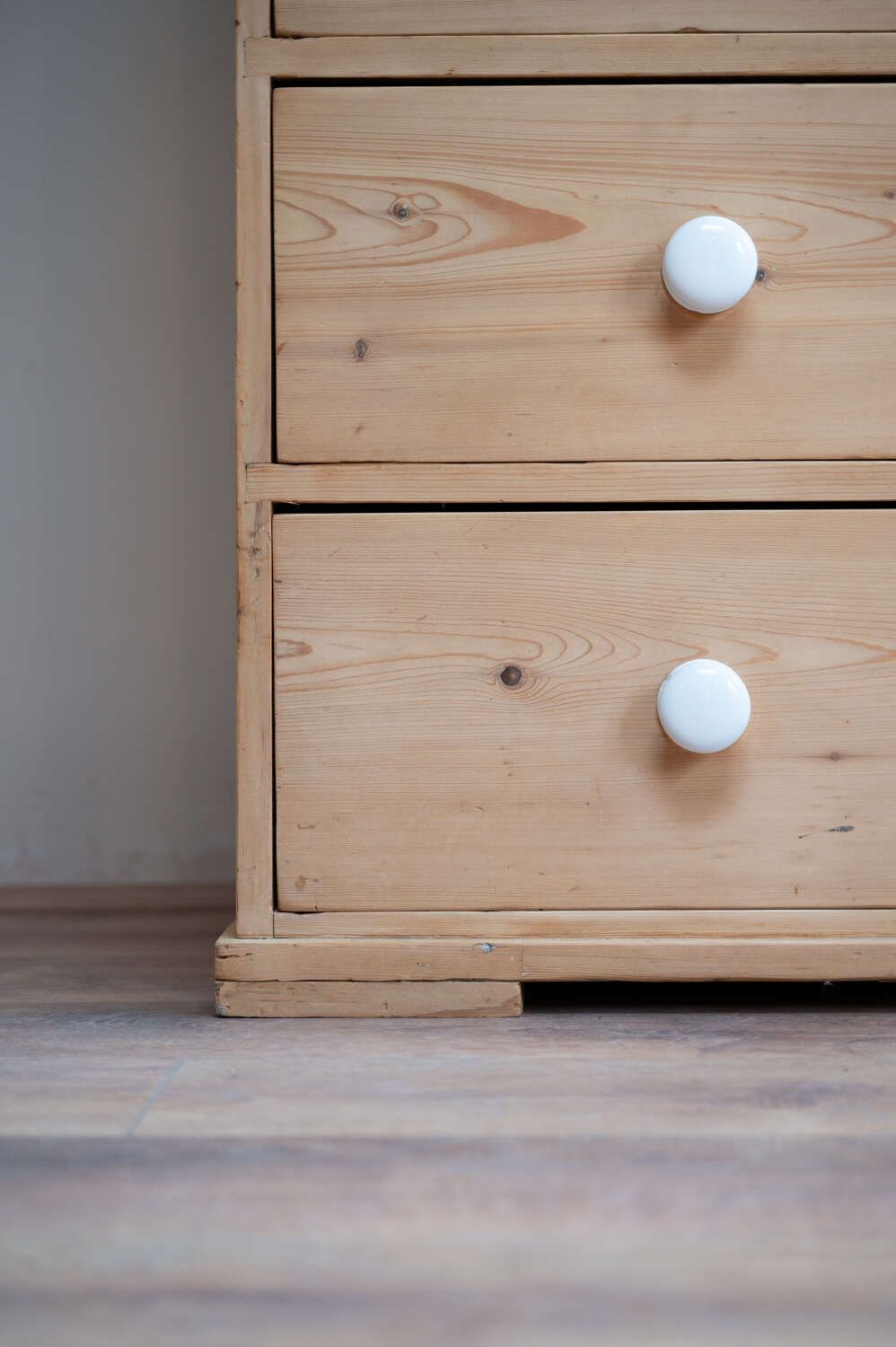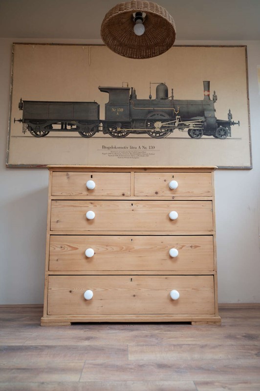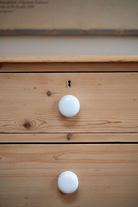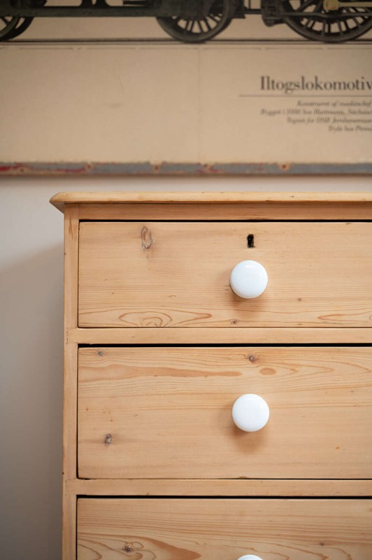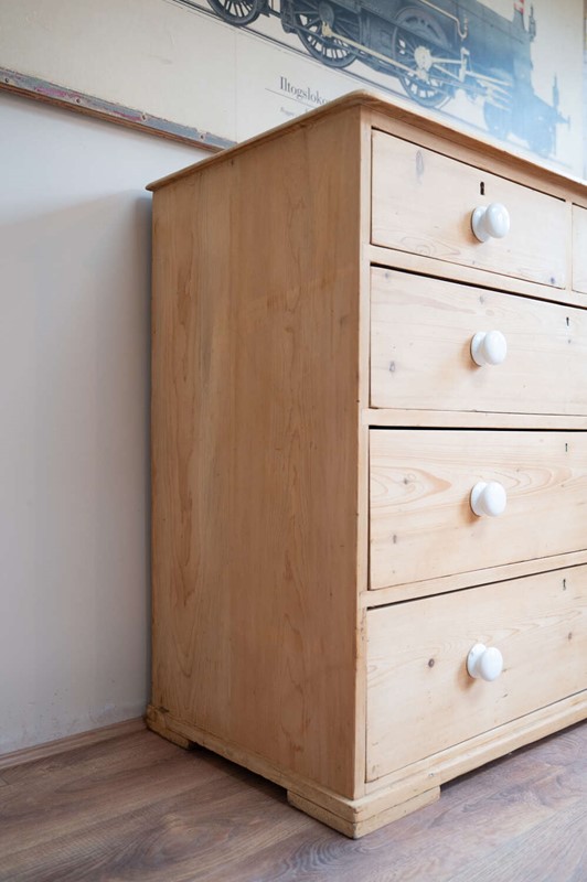 A handsome large antique pine chest of drawers, arranged in a practical 2 over 3 configuration and finished with charming vintage porcelain knobs. Offering generous storage, this is a substantial and versatile piece that works beautifully in bedrooms, hallways or larger living spaces.At some point in its history, simple wooden feet have been added. These are a straightforward, workmanlike addition, crafted from solid planks of wood, and they lift the chest nicely from the floor, giving it a more grounded and balanced presence. Rather than detracting, they add to the piece’s honest, utilitarian charm.The pine carries a warm, time-worn patina throughout, with surface markings in keeping with age, adding depth and character. Solid, usable and full of personality.Measurements: 94.5cm Tall x 106cm Wide x 51cm Deep