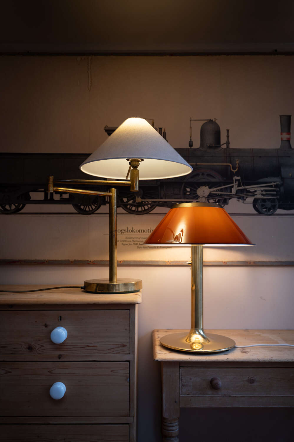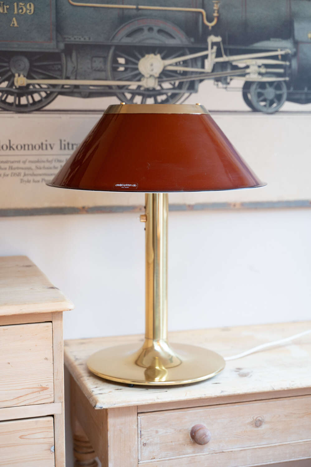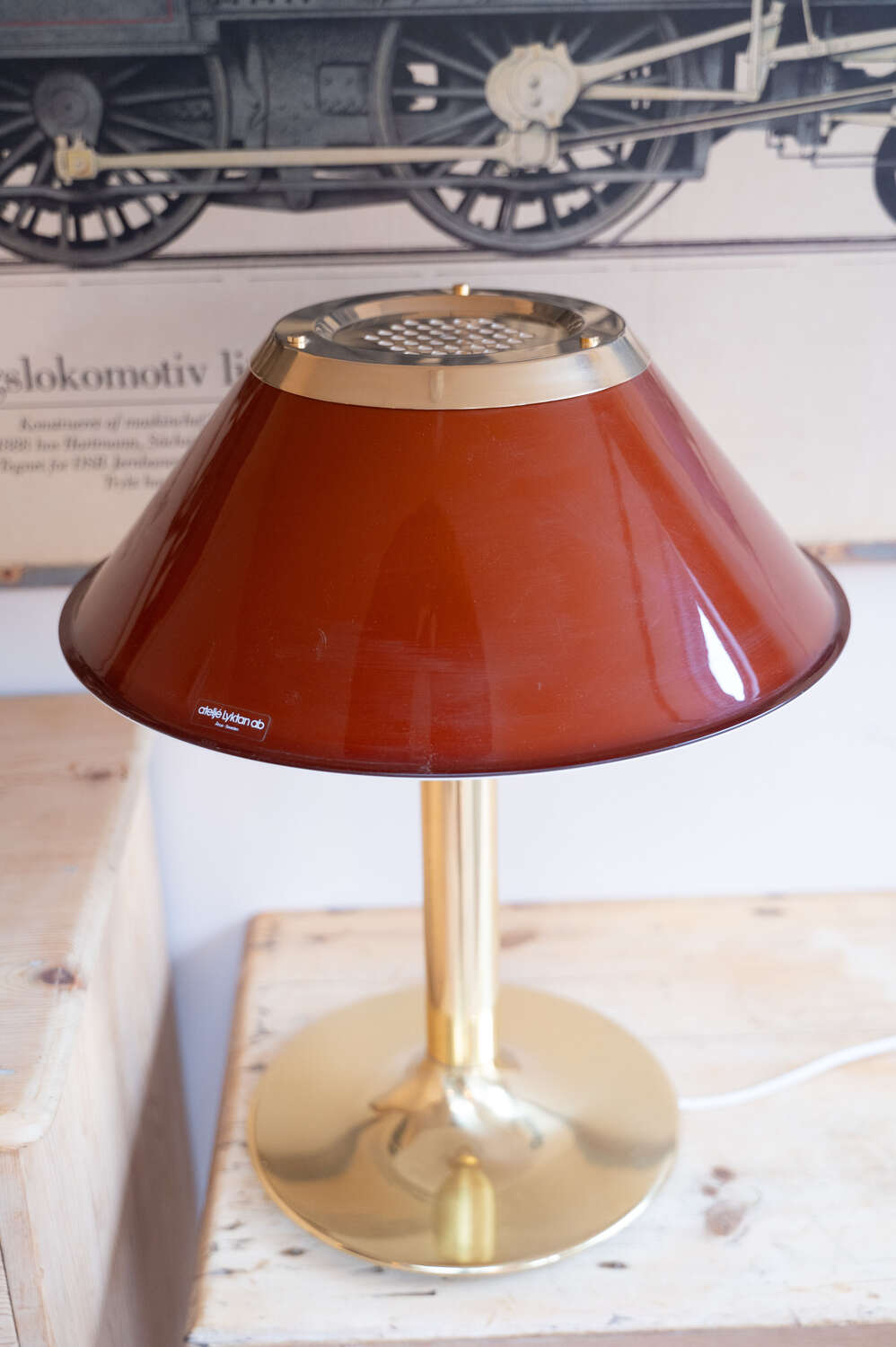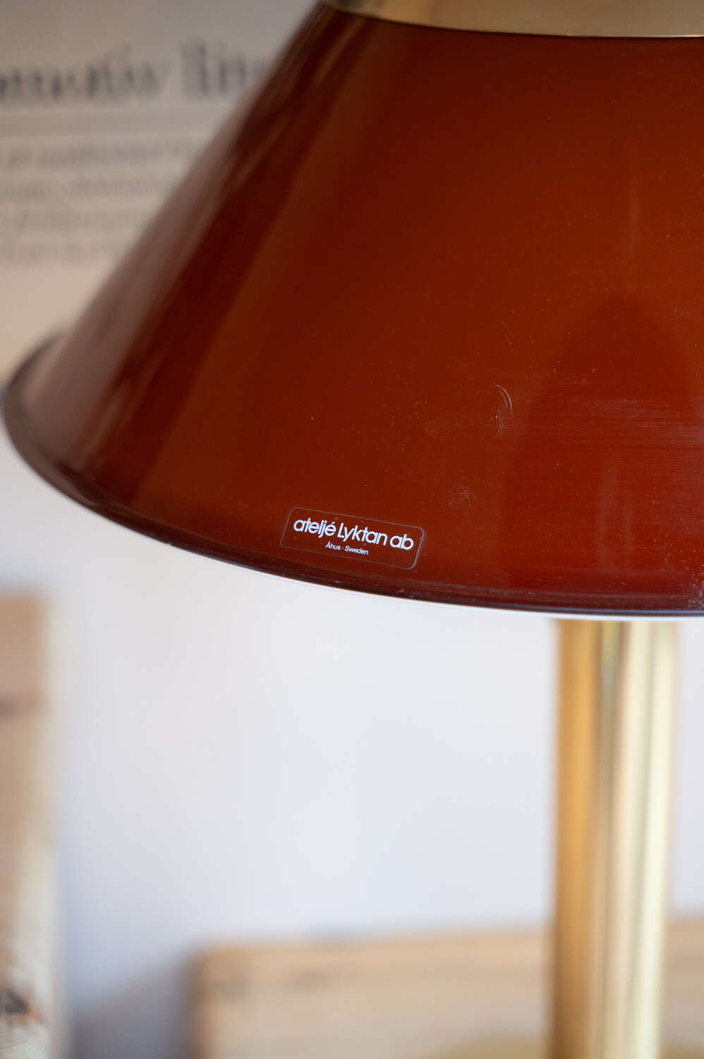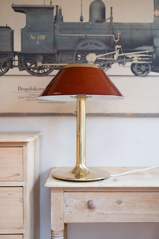 An iconic Mars table lamp designed by Per Sundstedt for Ateljé Lyktan AB, Sweden. A classic piece of Scandinavian mid century design, featuring a rich red metal shade paired with a solid brass stem and circular base. The proportions are spot on — bold yet refined — making it an excellent statement lamp for a desk, bedside or sideboard. The brass has aged beautifully, developing a soft patina that sits perfectly against the warmth of the red shade. In good vintage condition with light, honest wear consistent with age, some minor scratches but not noticeable for a few steps back. Fully working and ready to enjoy. A collectible design classic from one of Sweden’s most respected lighting manufacturers.Measurements:56cm Tall x 46cm Diameter