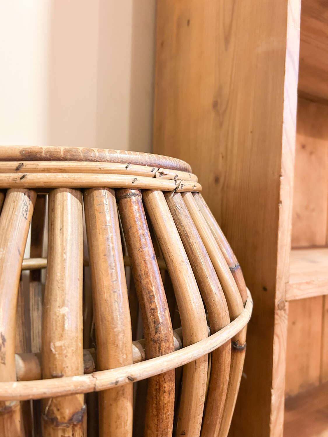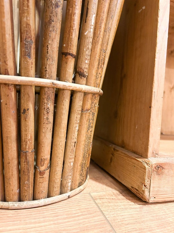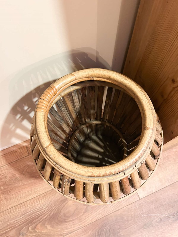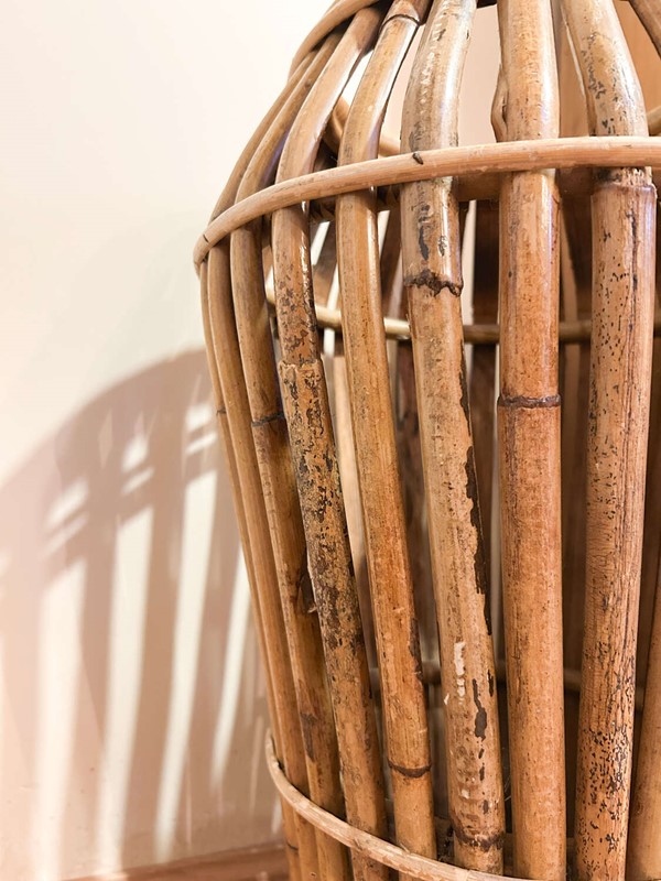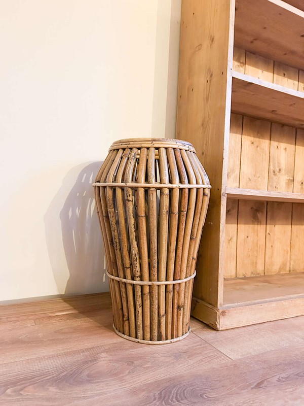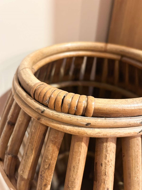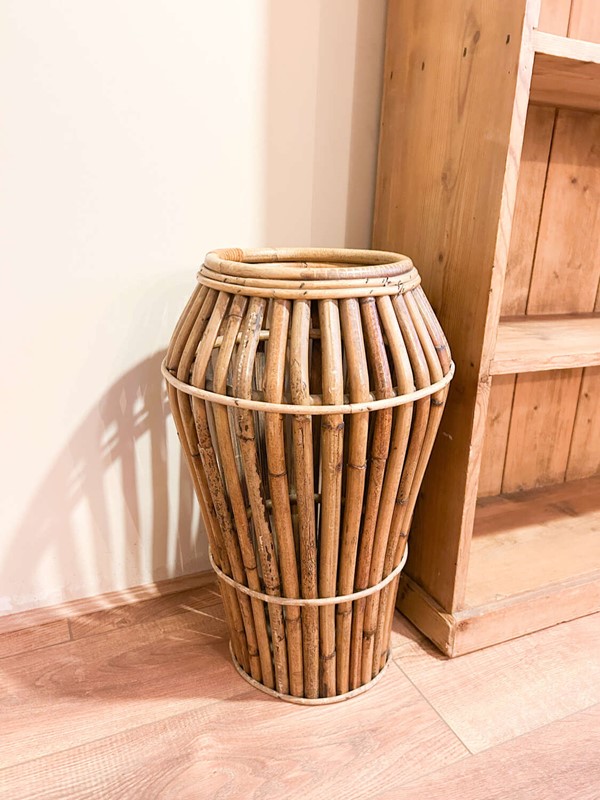 A striking mid-century Italian bamboo umbrella stand, beautifully crafted with a sculptural, tapered form. These original Italian pieces are increasingly hard to find, and this example has a wonderful warm patina that comes only with age.Lightweight yet sturdy, it’s both a practical hallway piece and an effortless design statement. As with all hand-worked bamboo, you’ll spot a few natural variations and gentle ageing in the cane, which only enhance its charm and authenticity.A brilliant addition to any mid-century, boho, or eclectic interior.Measurements: 54cm Tall x cm 34Wide x 34cm Deep