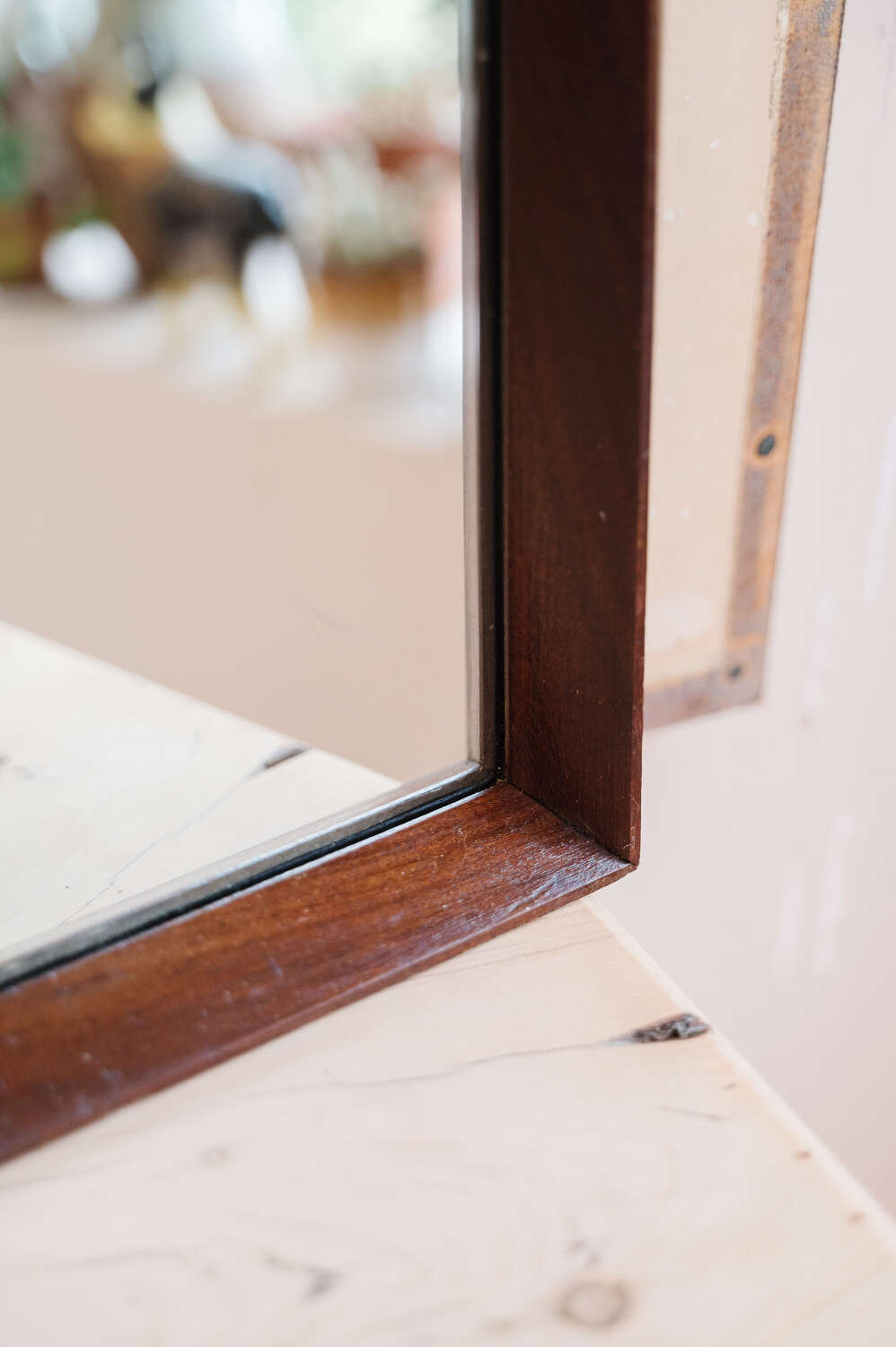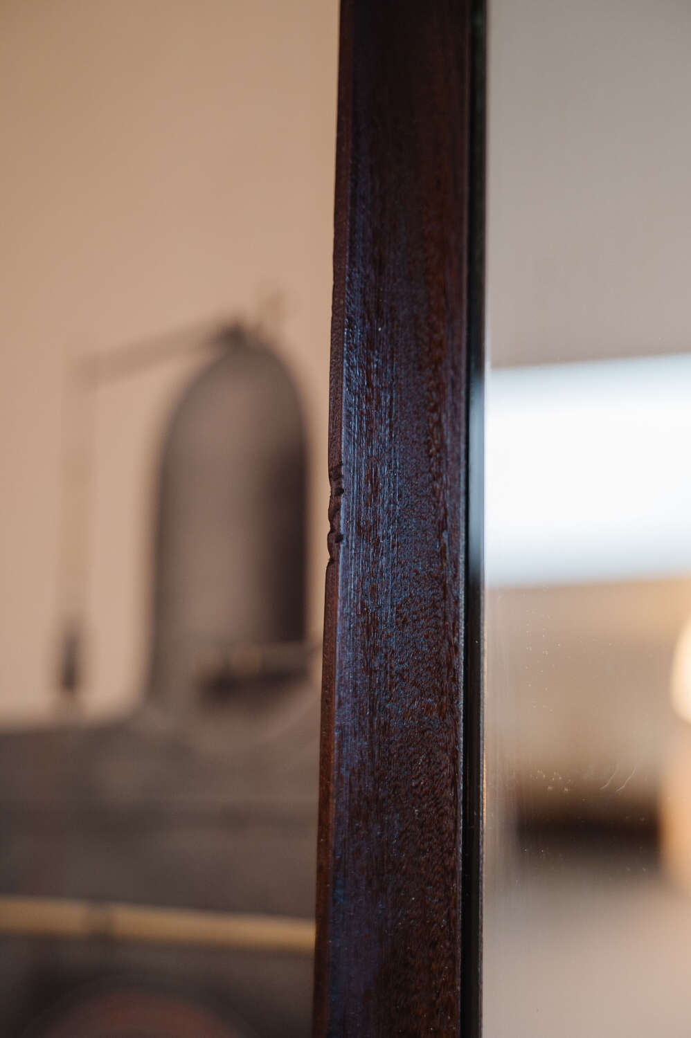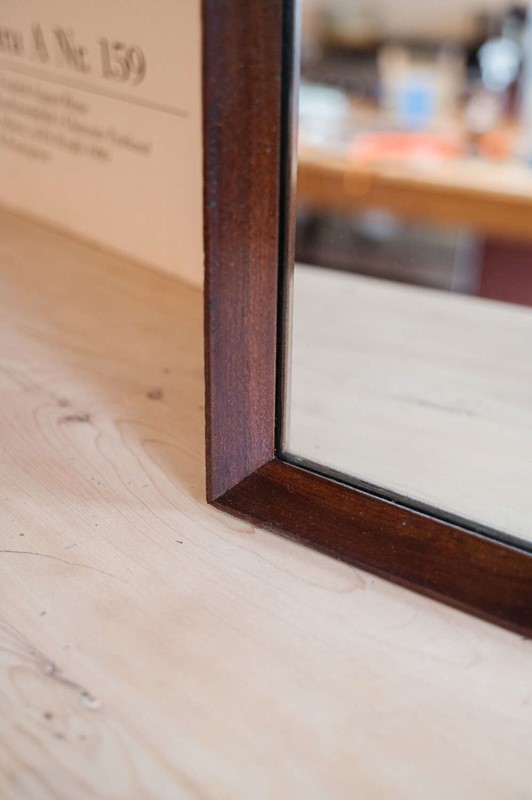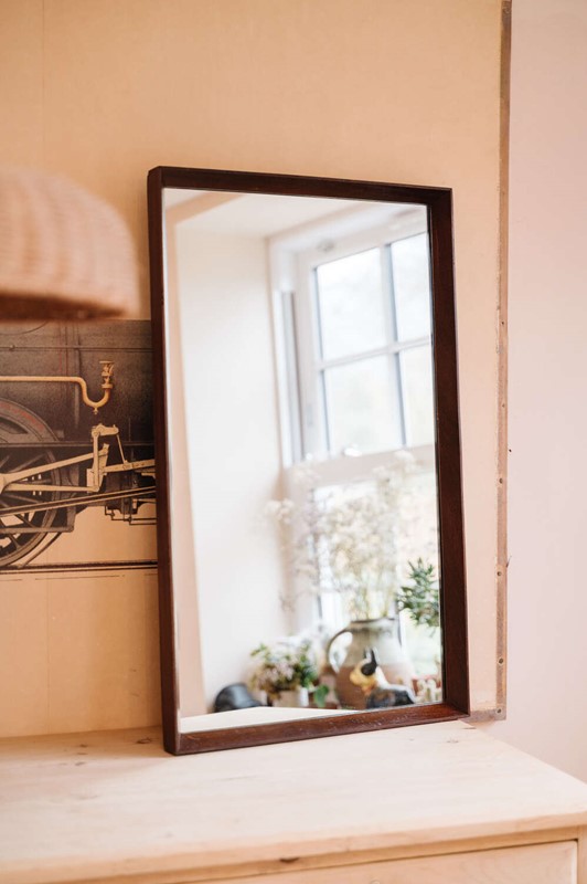 A clean-lined mid-century modern rectangular mirror with simple proportions and an easy, architectural presence. The pared-back frame allows the shape to speak for itself, making it a versatile piece within both contemporary and vintage-inspired interiors. Its understated form works beautifully above a sideboard, in a hallway, or layered into a bedroom setting. The proportions feel balanced and considered — functional without ever feeling fussy. Light surface character in keeping with age adds depth and authenticity. A timeless, quietly confident piece of mid-century design.Measurements: 71.5cm Tall x 43.5cm Wide x 4cm Deep