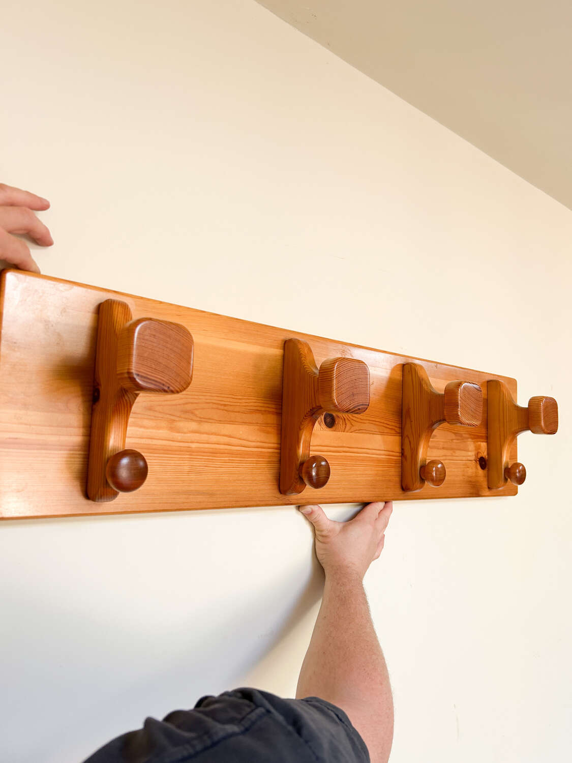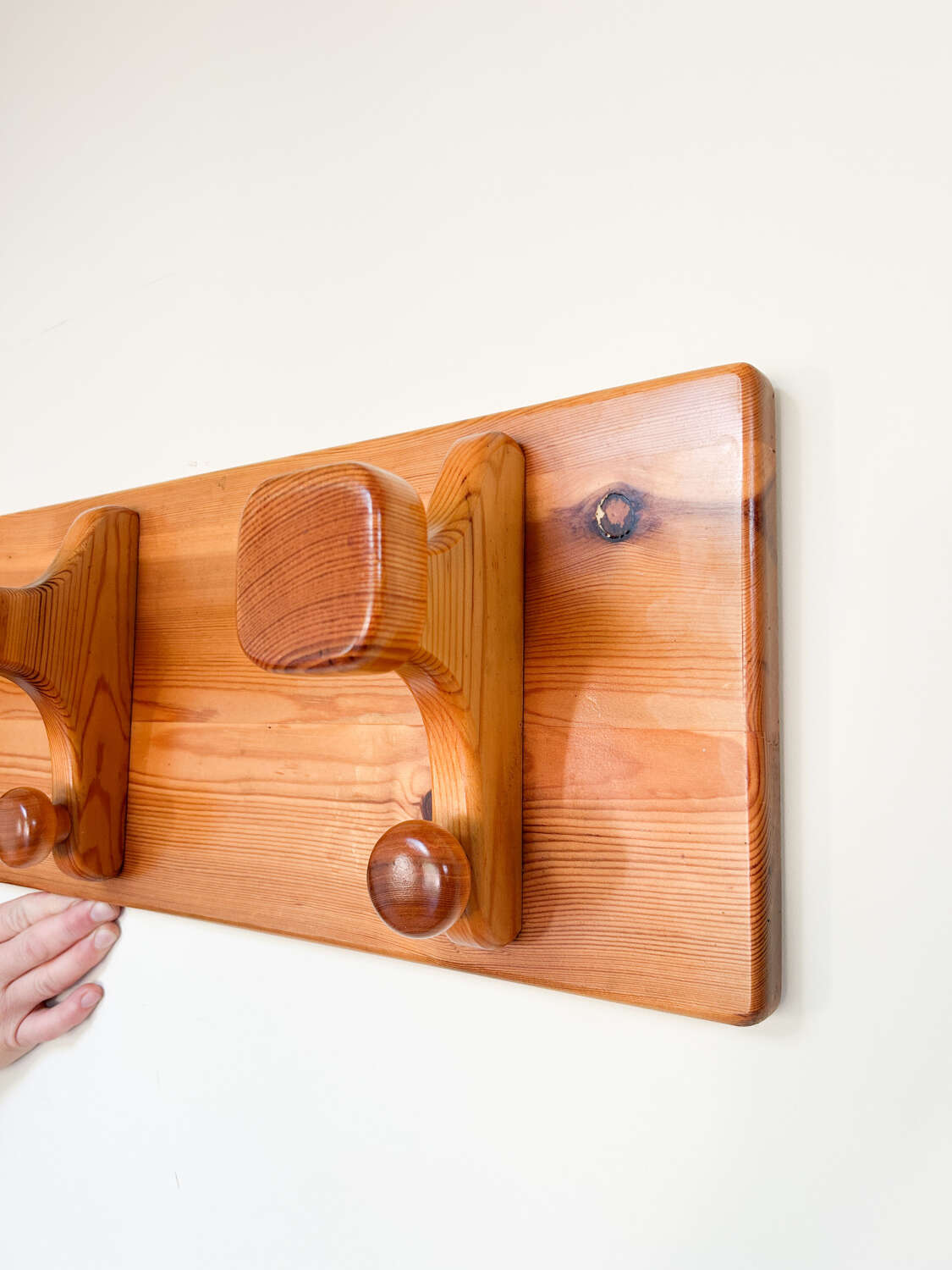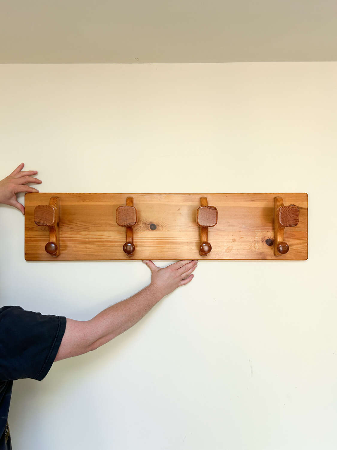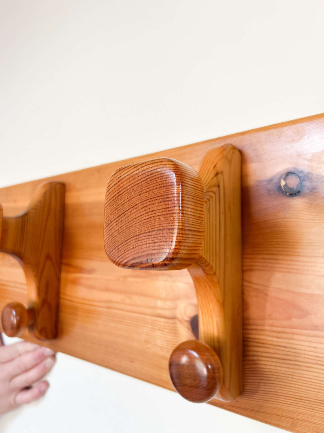 A sleek mid century modern teak coat rack, fitted with four sturdy pegs. With its clean lines and warm teak finish, this wall-mounted piece captures the simplicity and elegance of Scandinavian-inspired design. Perfect for a hallway, bedroom, or utility space, it combines practical storage with timeless retro style.Measurements: 24cm Tall x 100cm Wide x 14cm Deep including hooks
