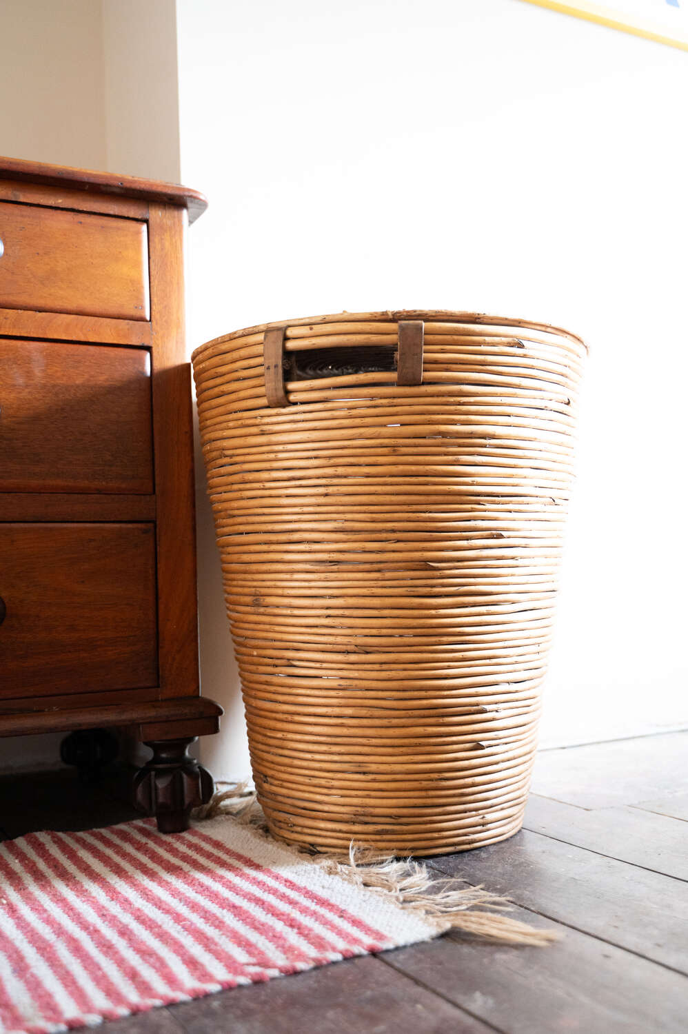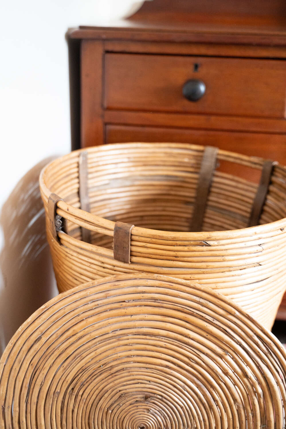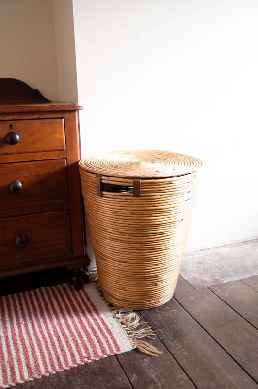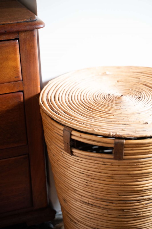 A striking mid century modern pencil reed rattan basket with fitted lid and leather strap detailing, attributed to the style of Gabriella Crespi. Beautifully proportioned and sculptural, this is a piece that works just as well as a functional storage solution as it does a decorative statement. In great condition throughout, the fine reed work and warm natural tones give it a timeless, design-forward feel. Ideal for use as a laundry basket, toy storage, blanket basket or simply as a stylish feature piece — the choice is yours. A versatile and elegant addition to any mid century, bohemian or contemporary interior.Measurements: 56cm Tall x 48.5cm Wide x 48.5cm Deep
