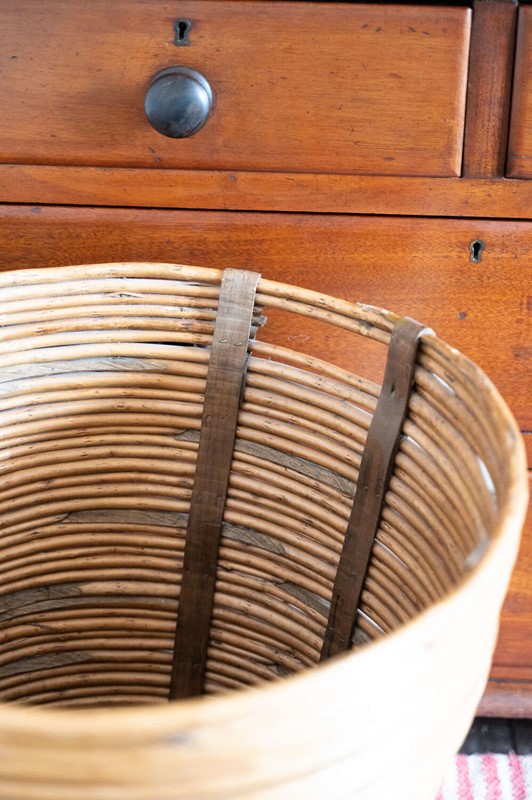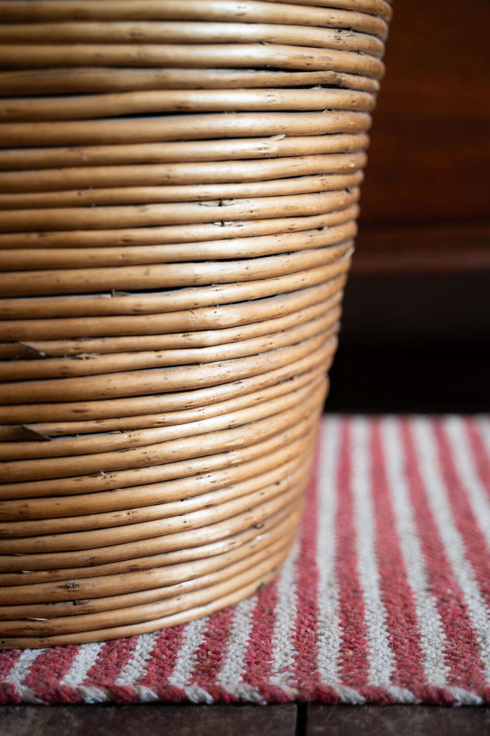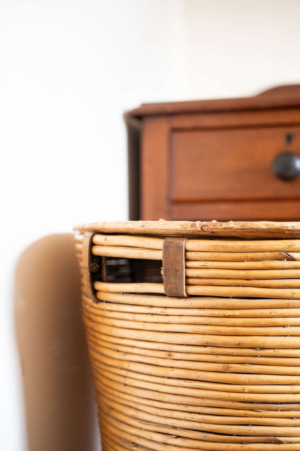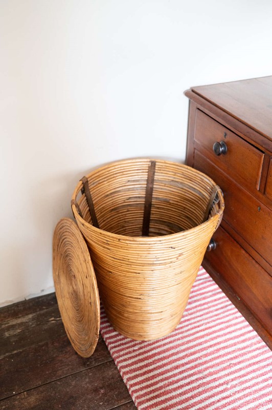 A striking mid century modern pencil reed rattan basket with fitted lid and leather strap detailing, attributed to the style of Gabriella Crespi. Beautifully proportioned and sculptural, this is a piece that works just as well as a functional storage solution as it does a decorative statement. In great condition throughout, the fine reed work and warm natural tones give it a timeless, design-forward feel. Ideal for use as a laundry basket, toy storage, blanket basket or simply as a stylish feature piece — the choice is yours. A versatile and elegant addition to any mid century, bohemian or contemporary interior.Measurements: 56cm Tall x 48.5cm Wide x 48.5cm Deep