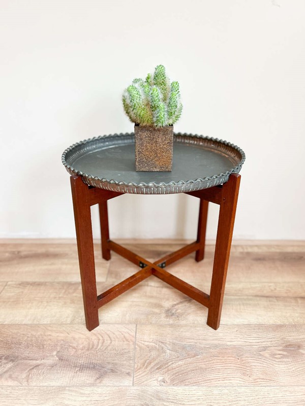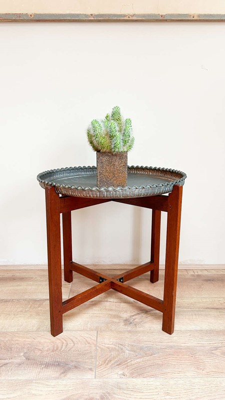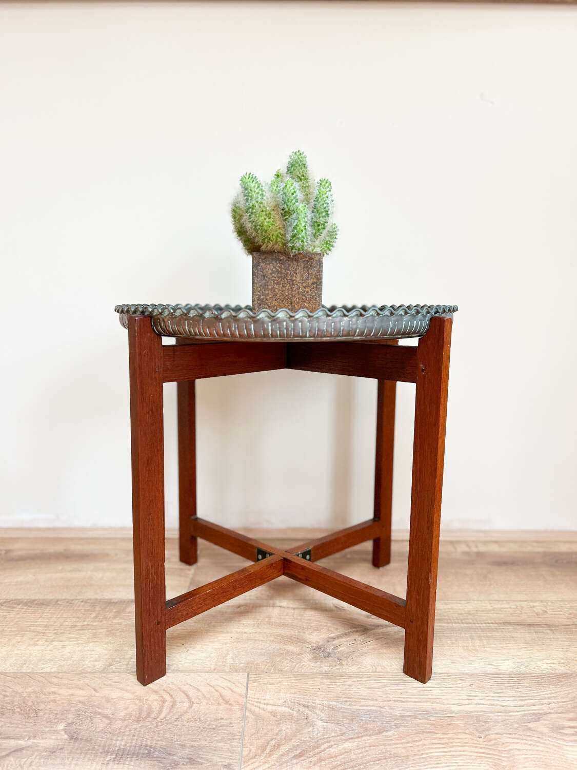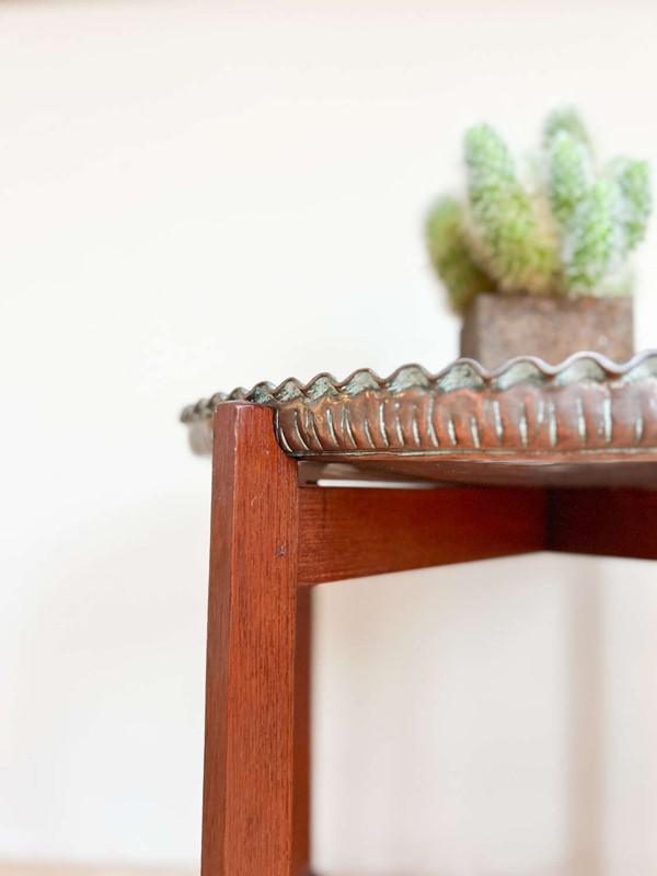 Mid Century Teak & Copper Plate Folding Side Table | Plant Stand