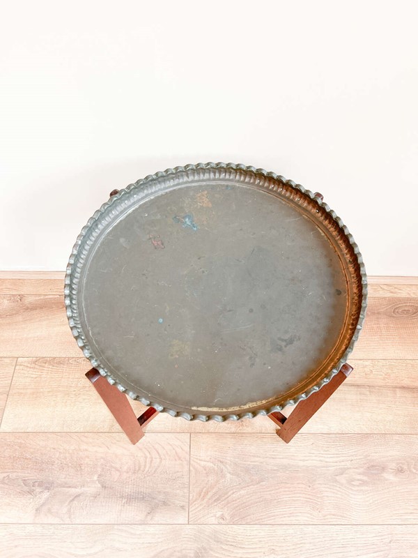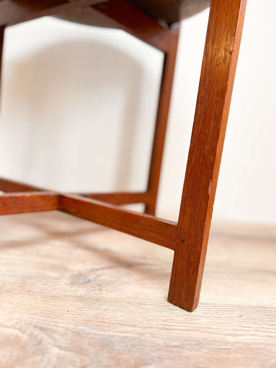 A stylish mid century modern side table with folding teak legs and a decorative copper plate top. Its compact, foldaway design makes it easy to move and store, while the warm copper surface adds a striking accent to any room.