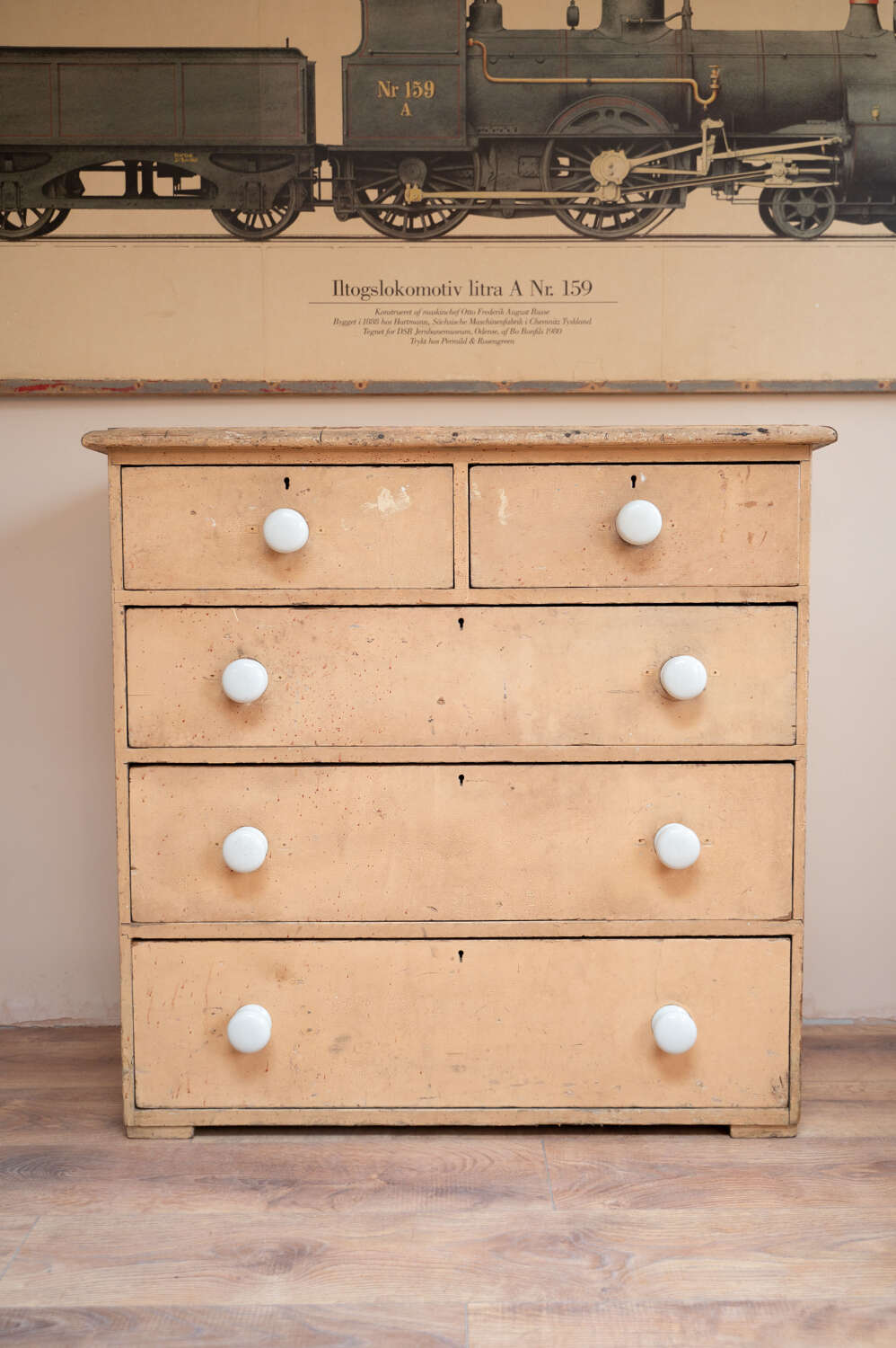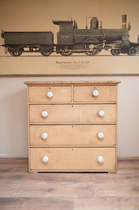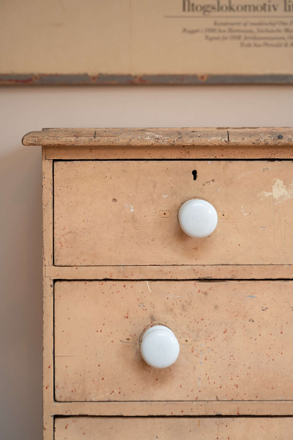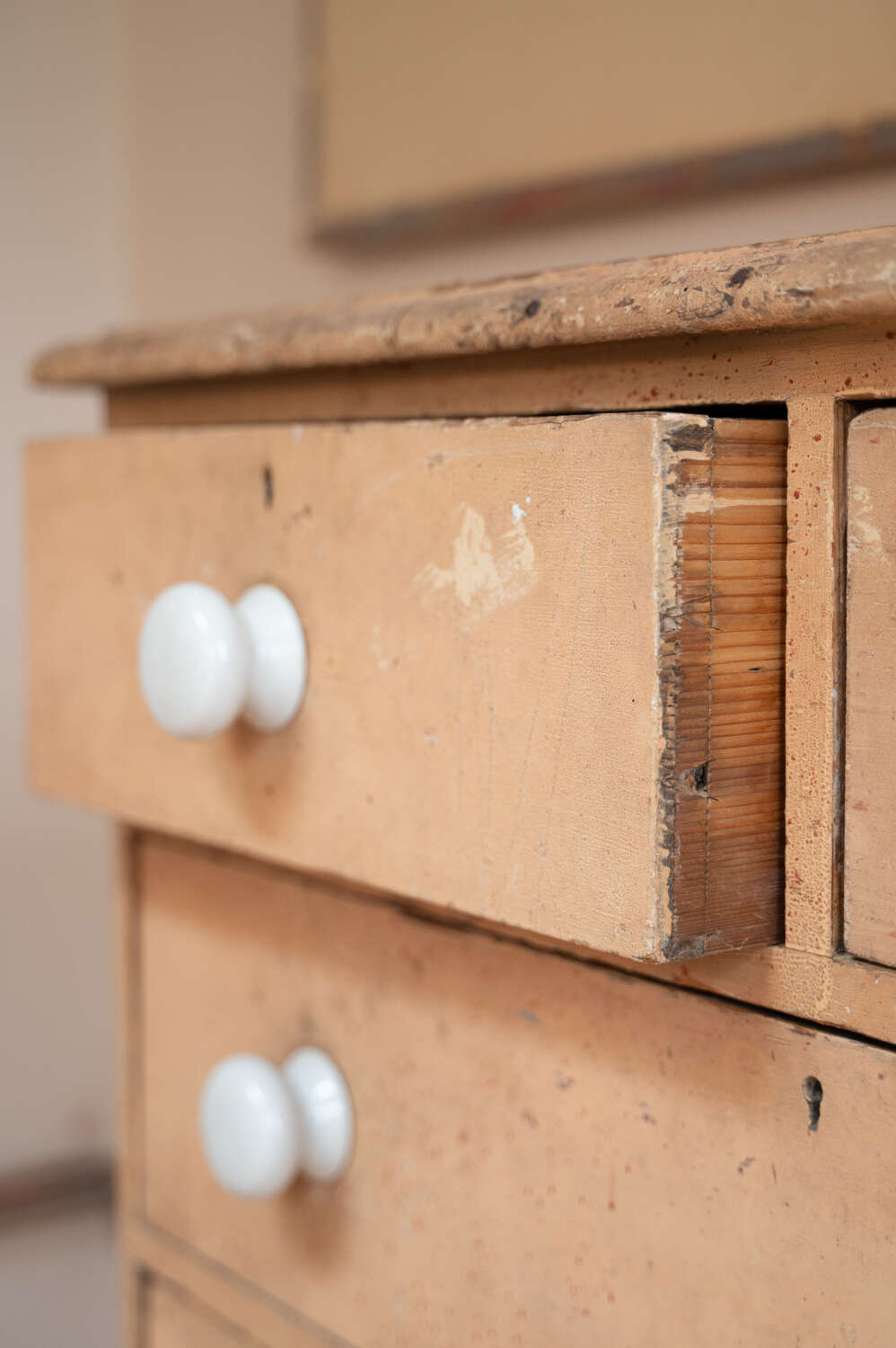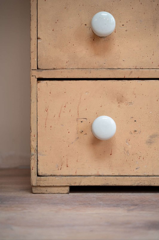 A characterful painted chest of drawers in a classic two-over-three configuration, finished in a soft cream tone with layers of timeworn patina. The surface carries heavier markings and variation in colour, giving it a relaxed, lived-in feel.The proportions are practical, offering useful storage while maintaining a simple, unfussy presence. It sits comfortably within cottage, farmhouse or more layered interiors where character and texture are welcomed.The wear is clearly visible in the photographs and forms part of the piece’s overall look. A well-used, decorative chest with plenty of charm.Measurements: 94.5cm Tall x 95cm Wide x 49cm Deep including handles