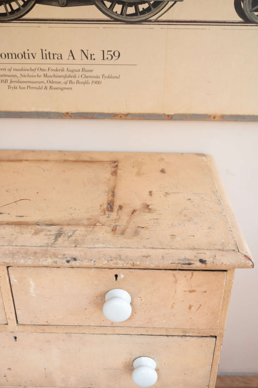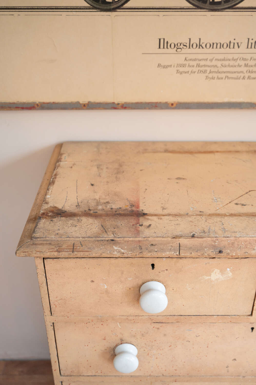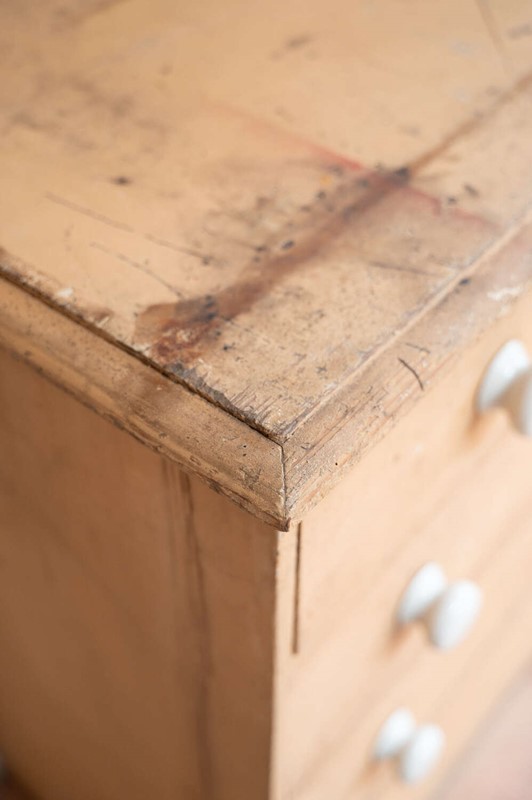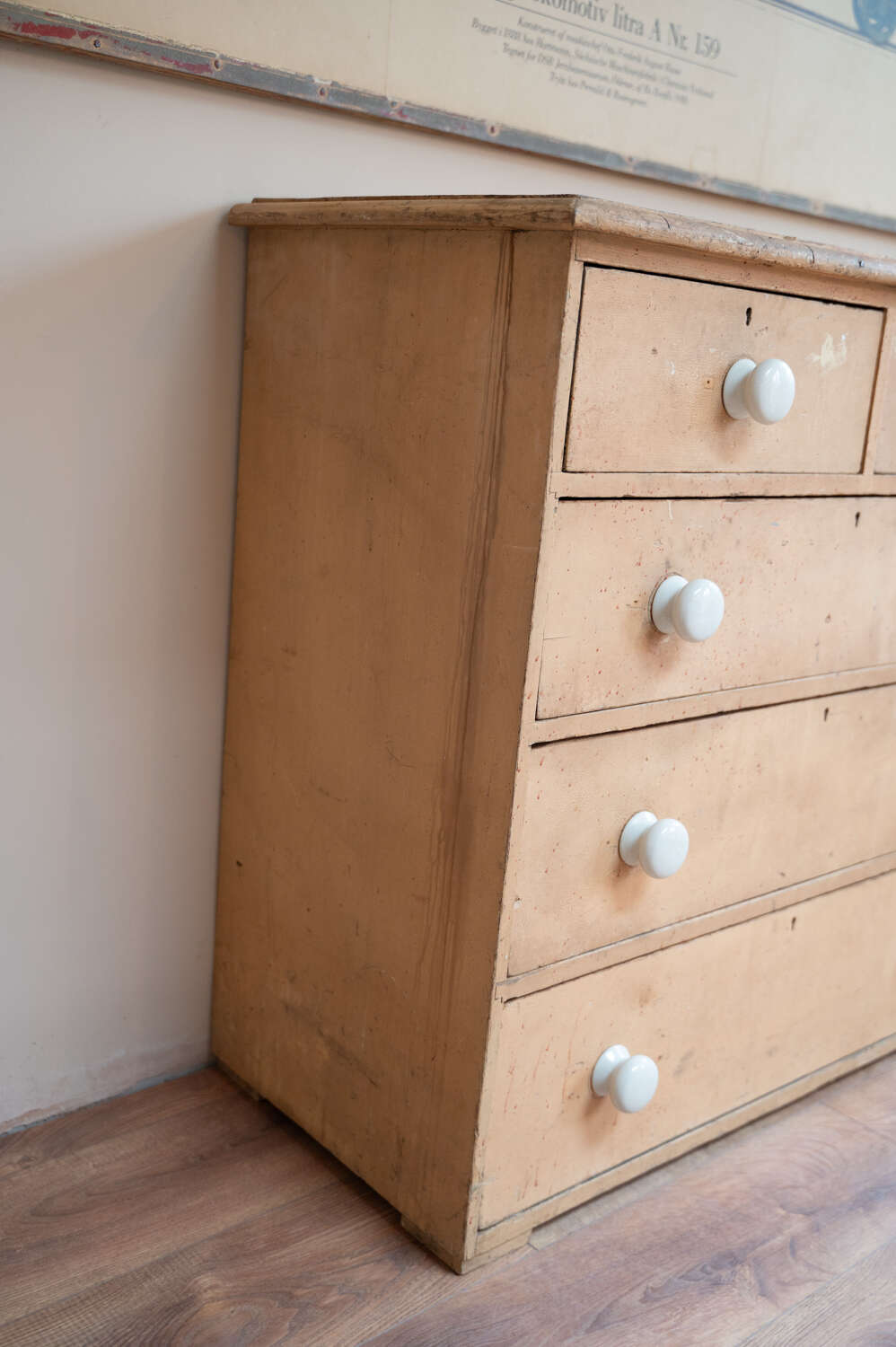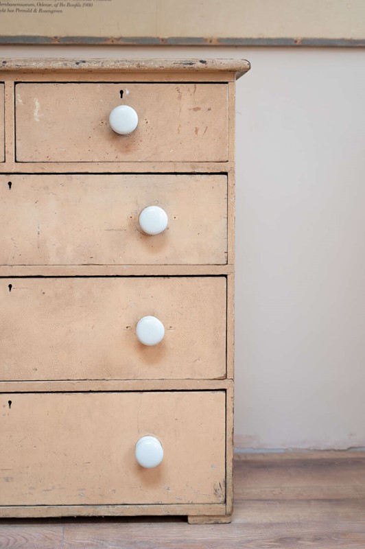 A characterful painted chest of drawers in a classic two-over-three configuration, finished in a soft cream tone with layers of timeworn patina. The surface carries heavier markings and variation in colour, giving it a relaxed, lived-in feel.The proportions are practical, offering useful storage while maintaining a simple, unfussy presence. It sits comfortably within cottage, farmhouse or more layered interiors where character and texture are welcomed.The wear is clearly visible in the photographs and forms part of the piece’s overall look. A well-used, decorative chest with plenty of charm.Measurements: 94.5cm Tall x 95cm Wide x 49cm Deep including handles