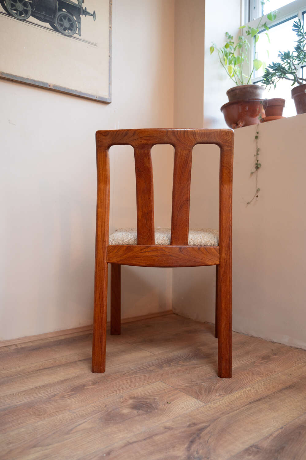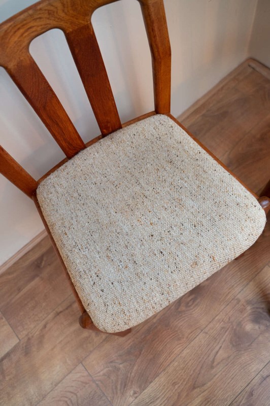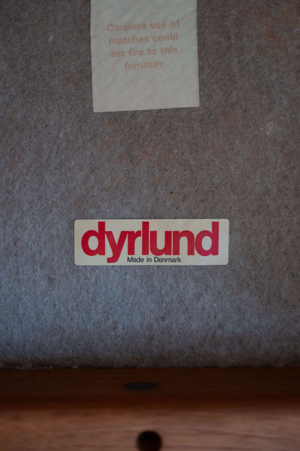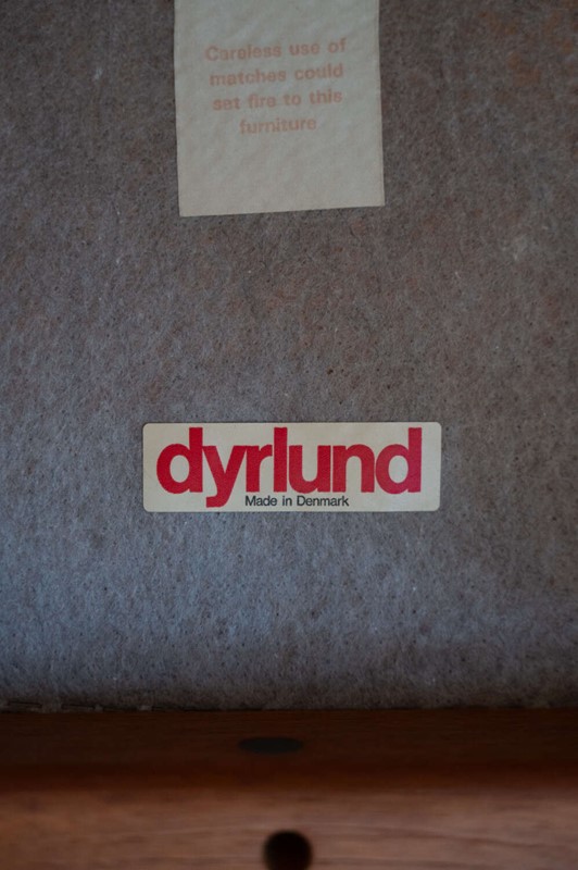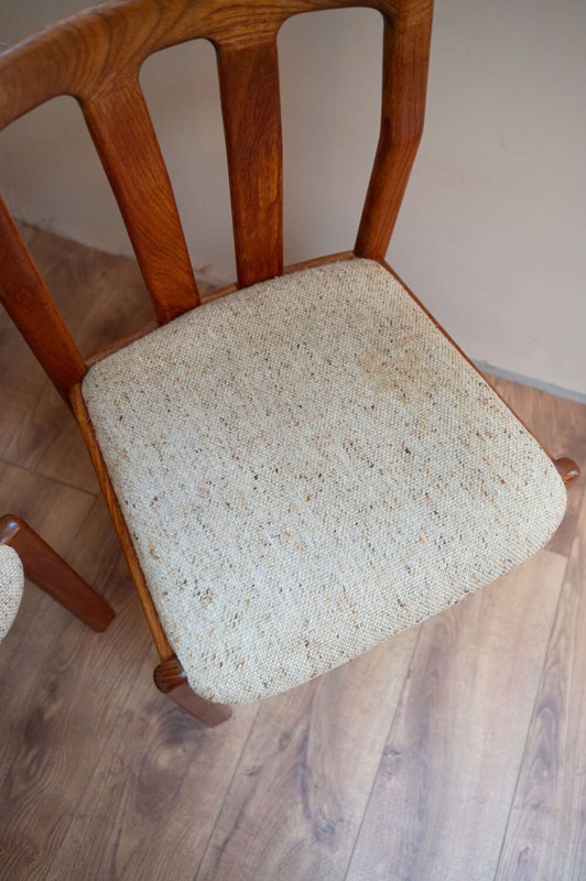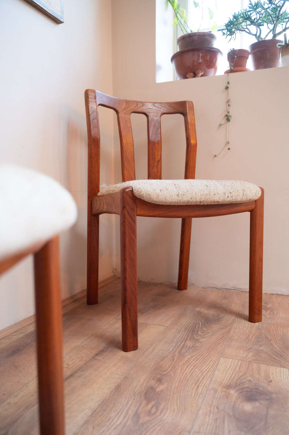 A stylish pair of Danish teak dining chairs by Dyrlund, dating to the mid-century modern period. Beautifully proportioned with warm teak frames and elegant lines, these chairs are a timeless addition to any dining space or kitchen setting. They retain their original upholstery, which shows some gentle, honest signs of use in keeping with age. Perfectly usable as they are, or easily reupholstered to suit your interior — reupholstery can be arranged for an additional fee if desired. Solid, comfortable, and full of classic Scandinavian character. 3rd available in alternate listing.Measurements: 79cm Tall (45cm seat height) x 50cm Wide x 47cm Deep