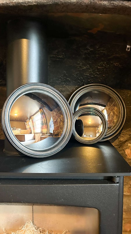 A stylish set of three French convex mini mirrors, each with a sleek black frame and presented in three graduated sizes. These decorative mirrors add instant charm and a touch of vintage French flair to any wall, whether styled together as a cluster or dotted individually throughout your home.Their convex shape catches the light beautifully, creating subtle reflections that bring depth and intrigue to a room. Perfect for hallways, living spaces, or as an elegant accent in a gallery wall display.Measurements:Large - 23cmMedium - 21cmSmall - 13cm