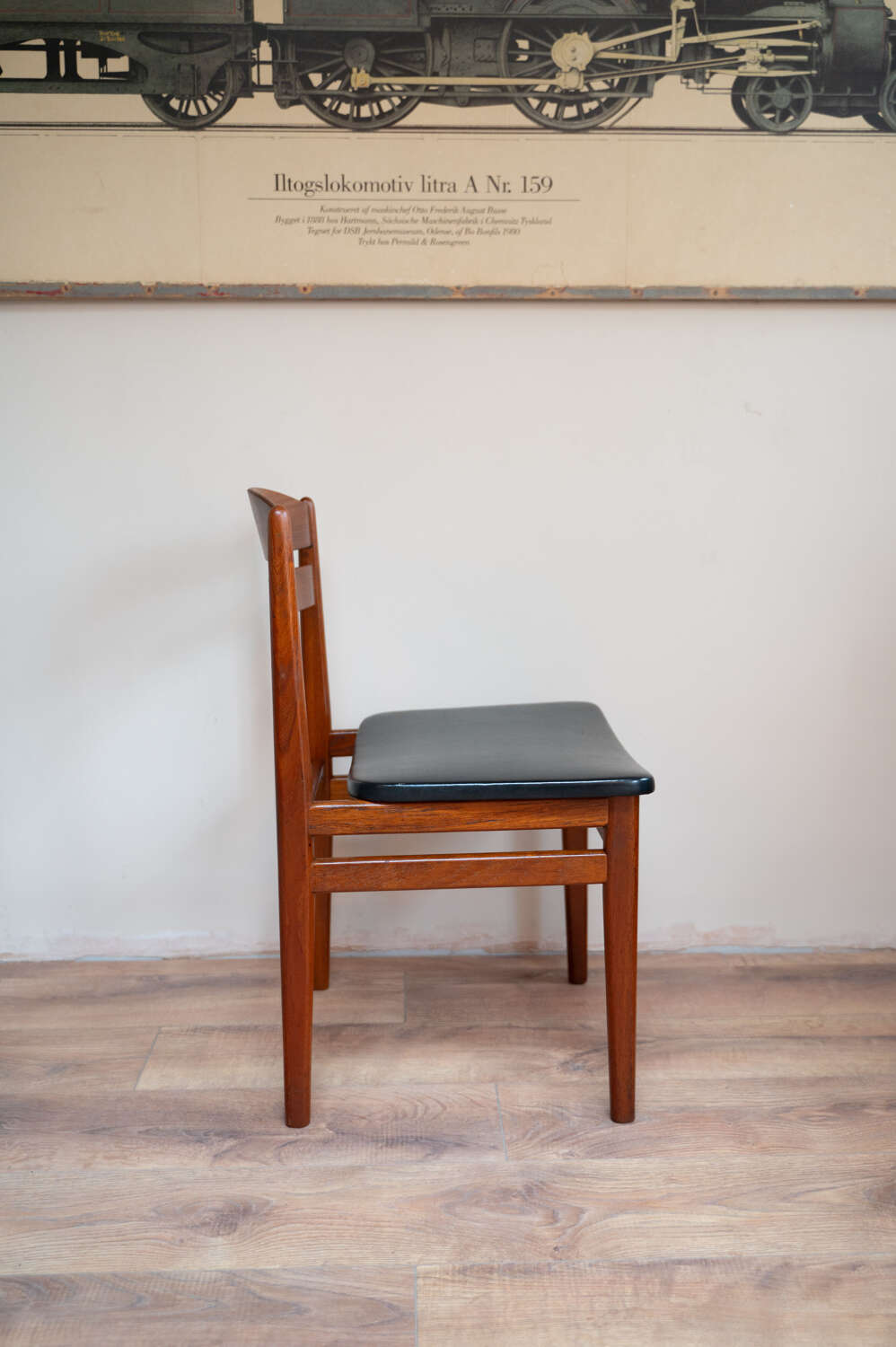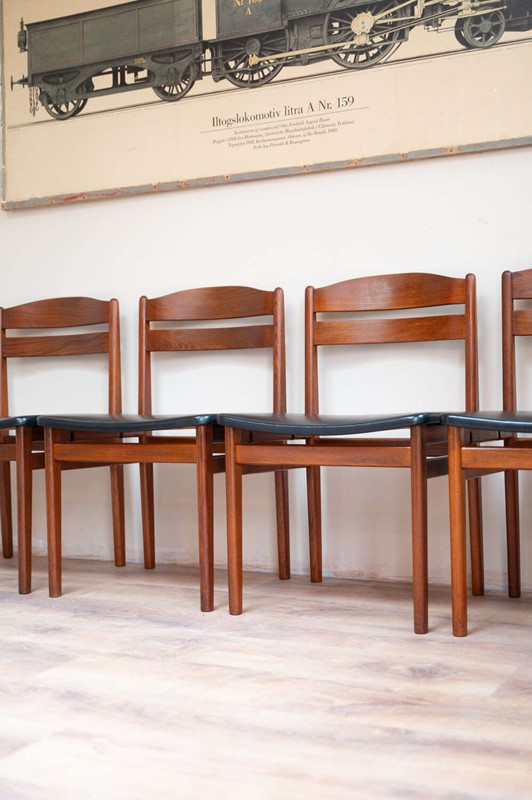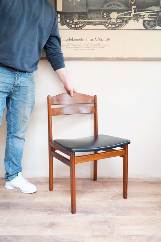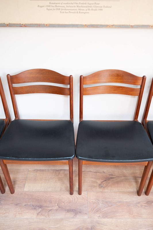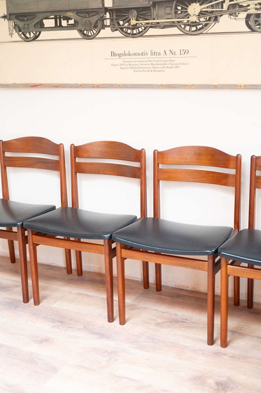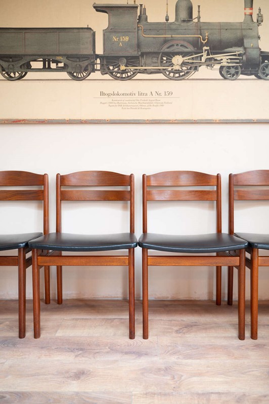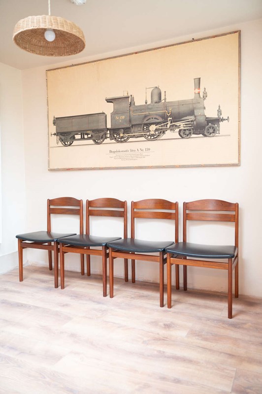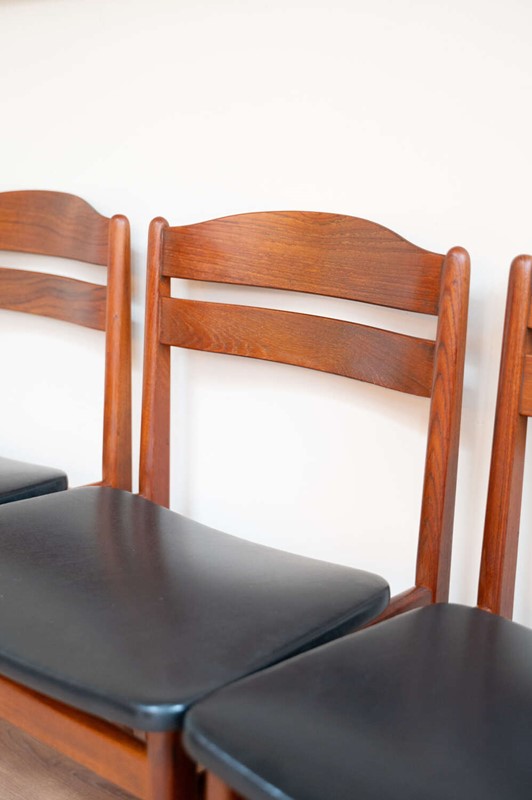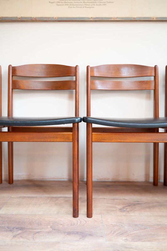 A refined set of four Danish mid-century dining chairs by Bolting Møbelfabrik, with beautifully shaped teak frames and clean, sculptural lines. The proportions are elegant and balanced, typical of well-crafted Scandinavian design. They retain their original black vinyl seat pads, which complement the warmth of the teak and sit comfortably with the period of the chairs. The frames are structurally solid with light surface character in keeping with age. A timeless and well-made set that works effortlessly within both mid-century and modern interiors.Measurements: 77cm Tall (42cm Seat Height) x 49cm Wide x 47cm Deep