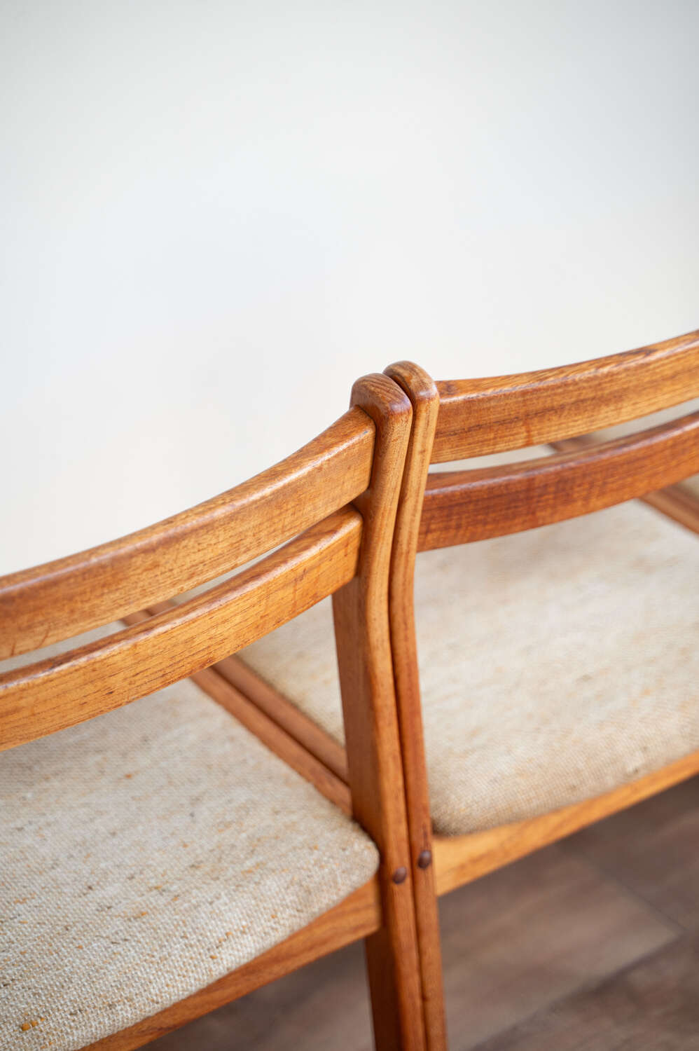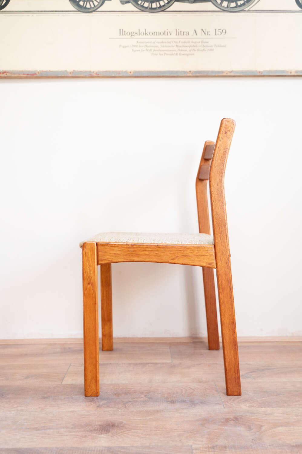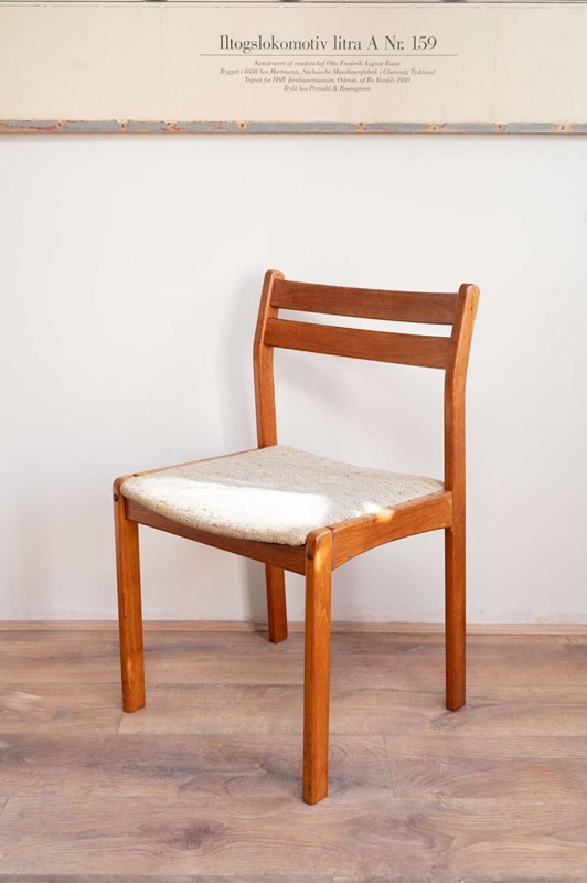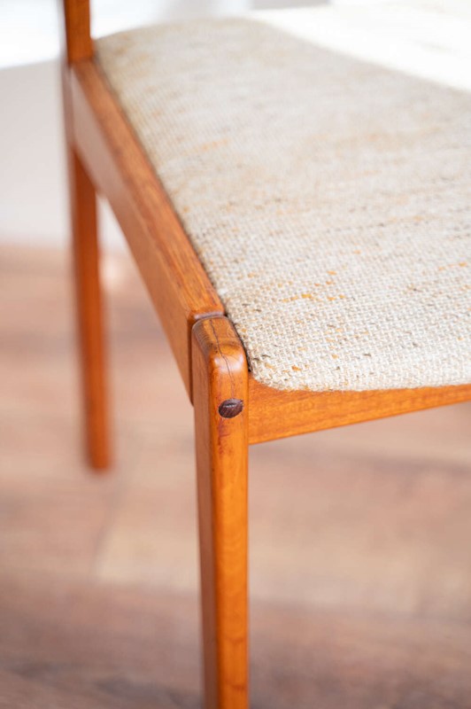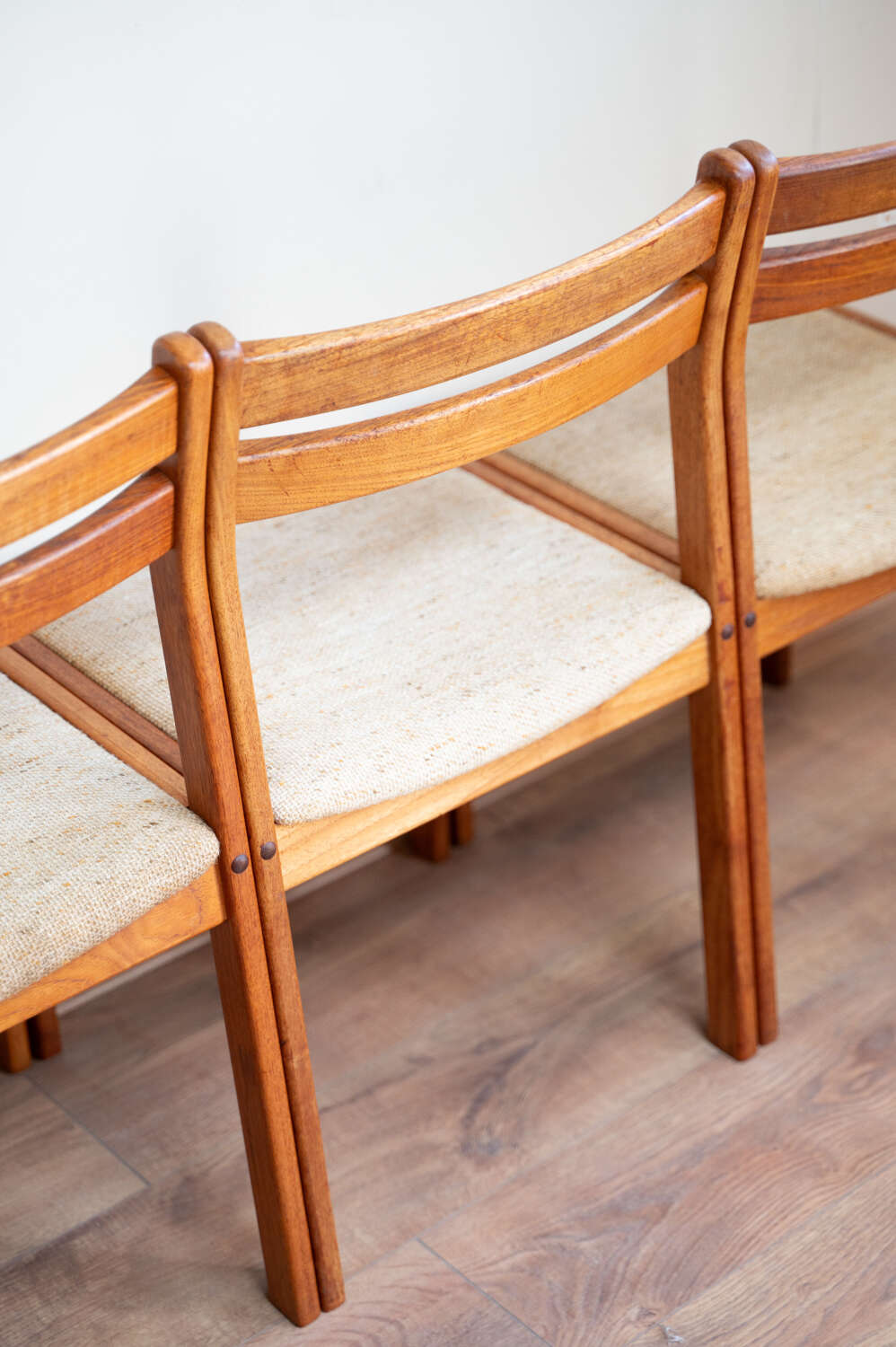 A classic set of four Danish teak dining chairs with beautifully simple mid-century lines and warm natural tone. The frames have been carefully checked, remedied where needed, and freshly oiled to bring the wood back to life and highlight the grain.As is often the case with well-loved vintage pieces, the chairs show some variation in wear. A few carry heavier surface markings and areas of sun fading than the others, adding to their honest vintage character. One chair has had a historic break which has been professionally rectified, as shown in the photographs. All remain structurally solid and ready for everyday use, with these considerations reflected in the price.They retain their original seat pads and upholstery. Should you wish, these can be professionally reupholstered in a fabric or leatherette of your choice for an additional fee — please message to discuss options.A well-designed and comfortable set that sits effortlessly within both mid-century and modern country interiors.Measurements: 77.5cm Tall (44cm Seat height) x 46cm Wide x 45cm Deep