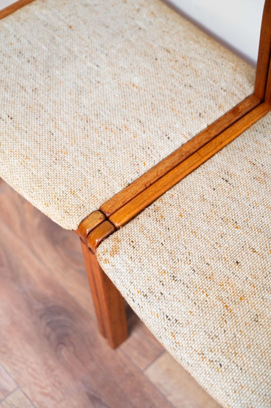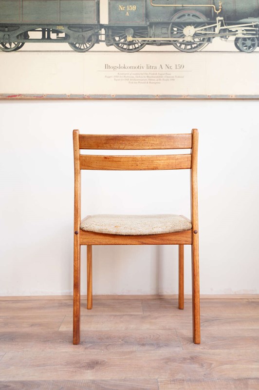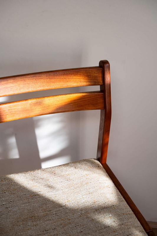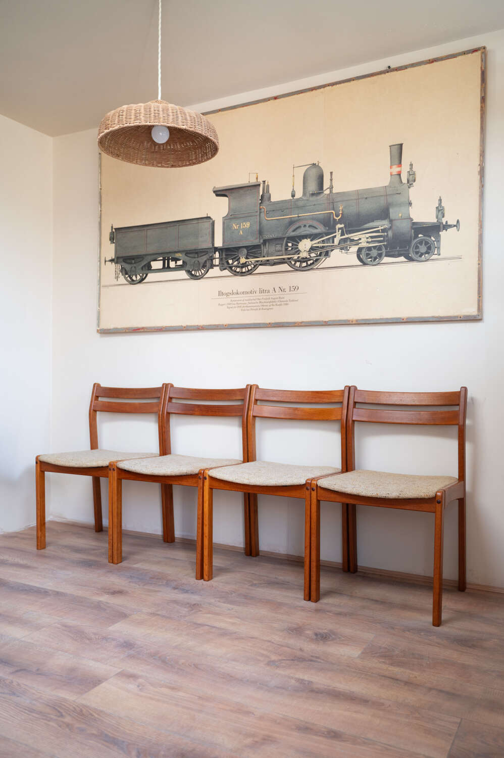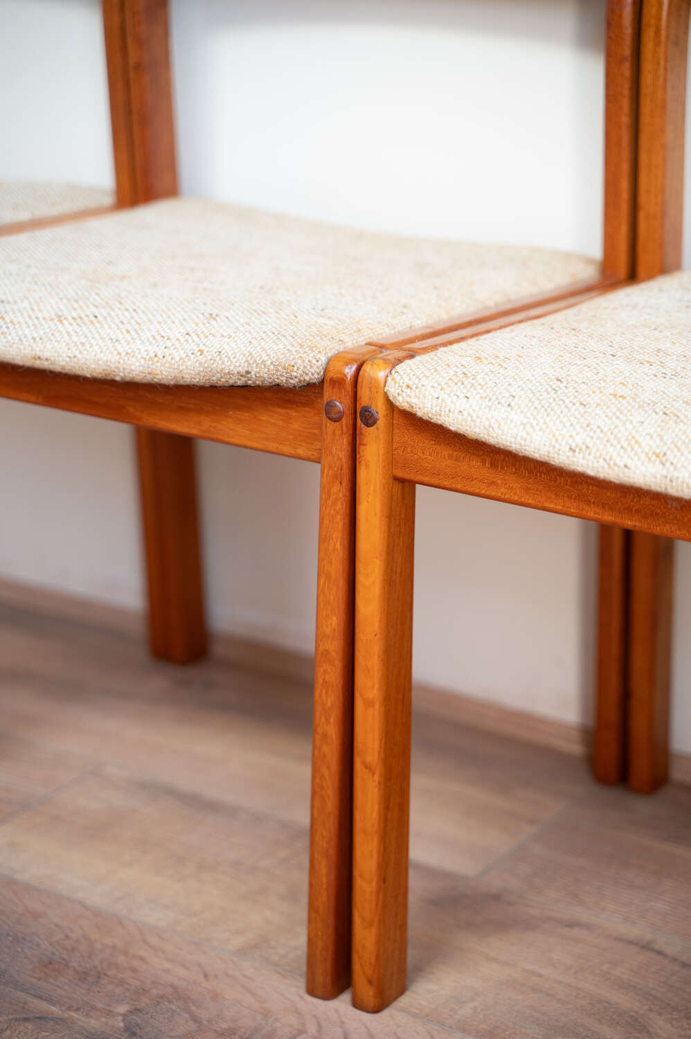 A classic set of four Danish teak dining chairs with beautifully simple mid-century lines and warm natural tone. The frames have been carefully checked, remedied where needed, and freshly oiled to bring the wood back to life and highlight the grain.As is often the case with well-loved vintage pieces, the chairs show some variation in wear. A few carry heavier surface markings and areas of sun fading than the others, adding to their honest vintage character. One chair has had a historic break which has been professionally rectified, as shown in the photographs. All remain structurally solid and ready for everyday use, with these considerations reflected in the price.They retain their original seat pads and upholstery. Should you wish, these can be professionally reupholstered in a fabric or leatherette of your choice for an additional fee — please message to discuss options.A well-designed and comfortable set that sits effortlessly within both mid-century and modern country interiors.Measurements: 77.5cm Tall (44cm Seat height) x 46cm Wide x 45cm Deep