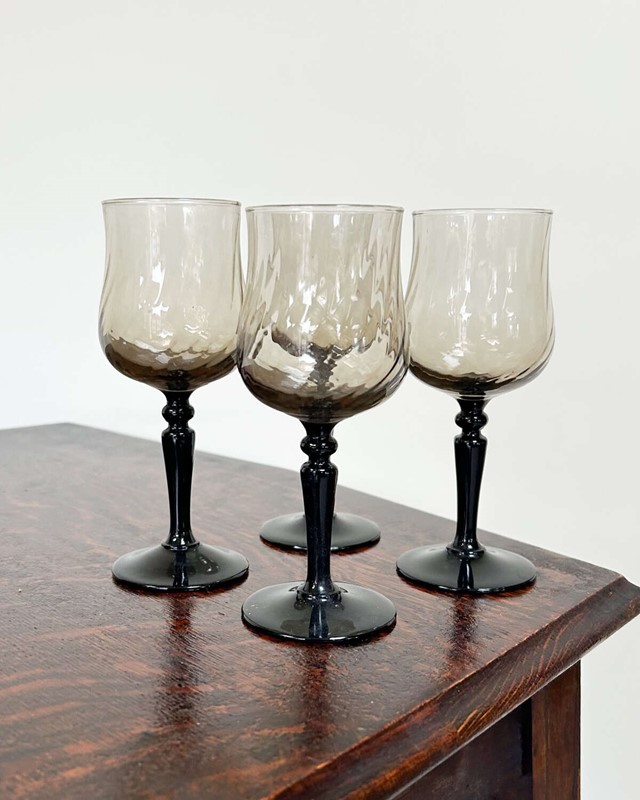 Set Of 4 Luminarc Black Stem Goblets | Smoky Swirl French Vintage Glasses 1970S