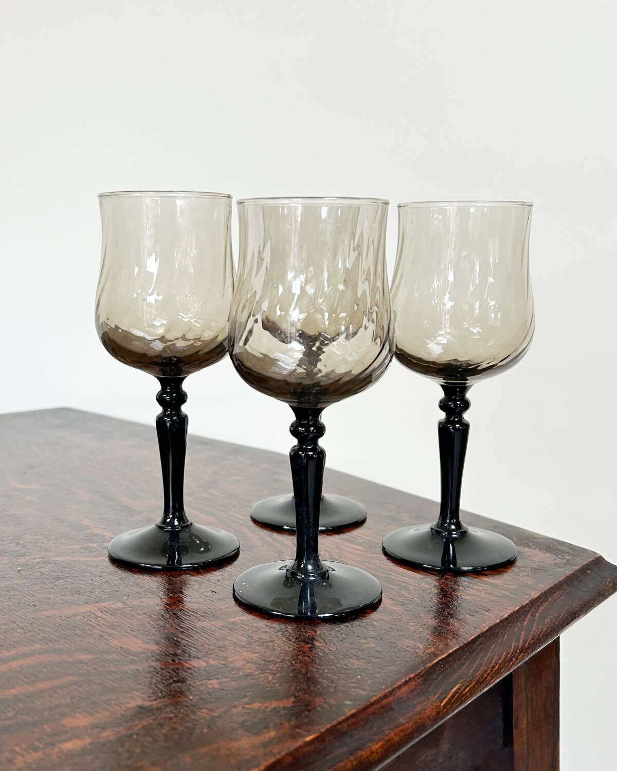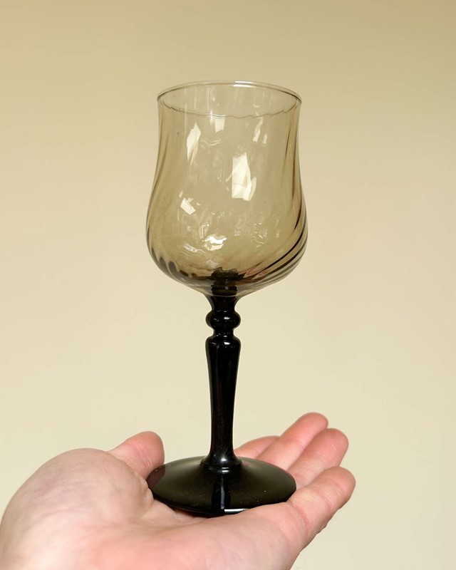 A beautiful set of four French vintage Luminarc goblets from the 1970s, featuring smoky swirl glass bowls and iconic black stems. Delicate yet durable, these mid-century pieces are perfect for white wine, aperitifs, or just making everyday drinks feel a little more elegant.