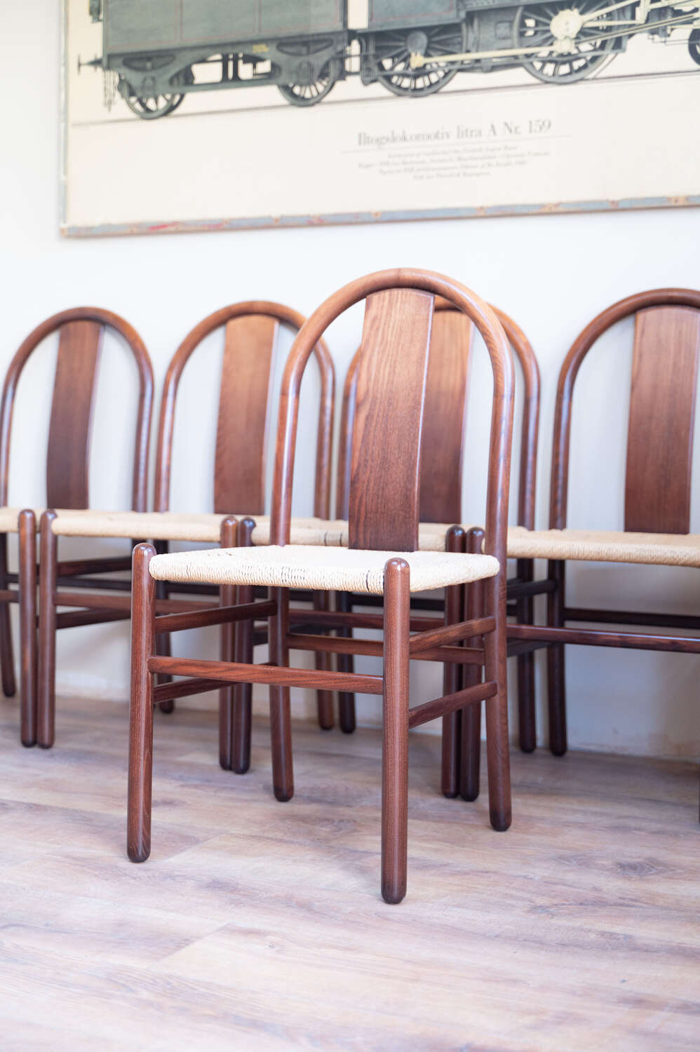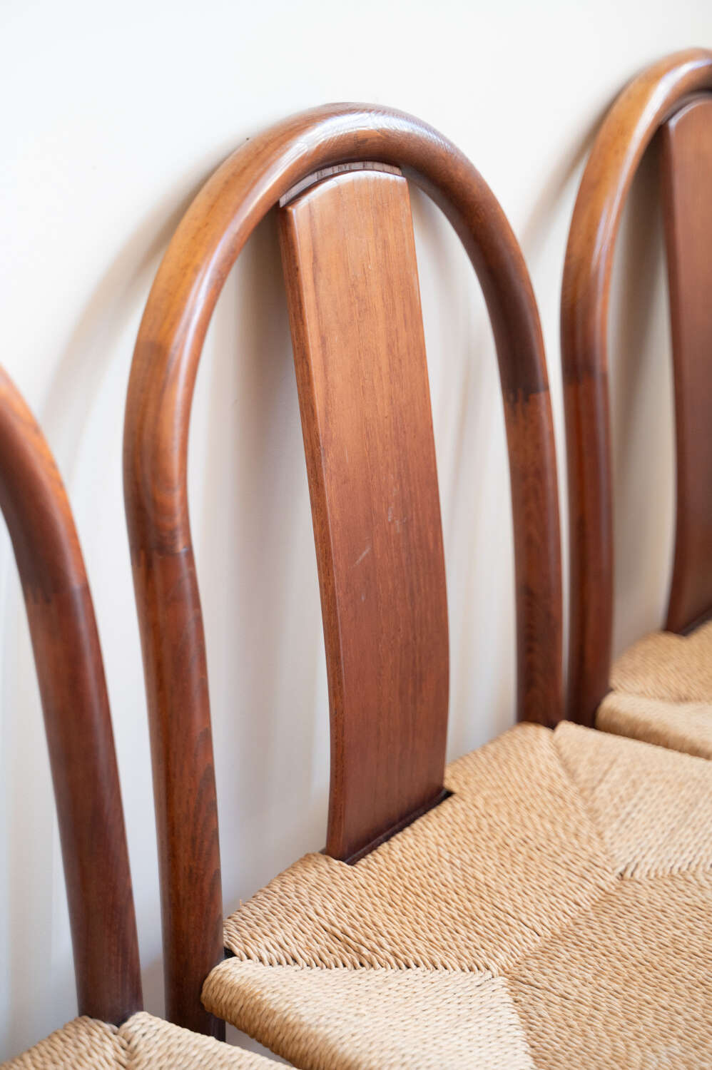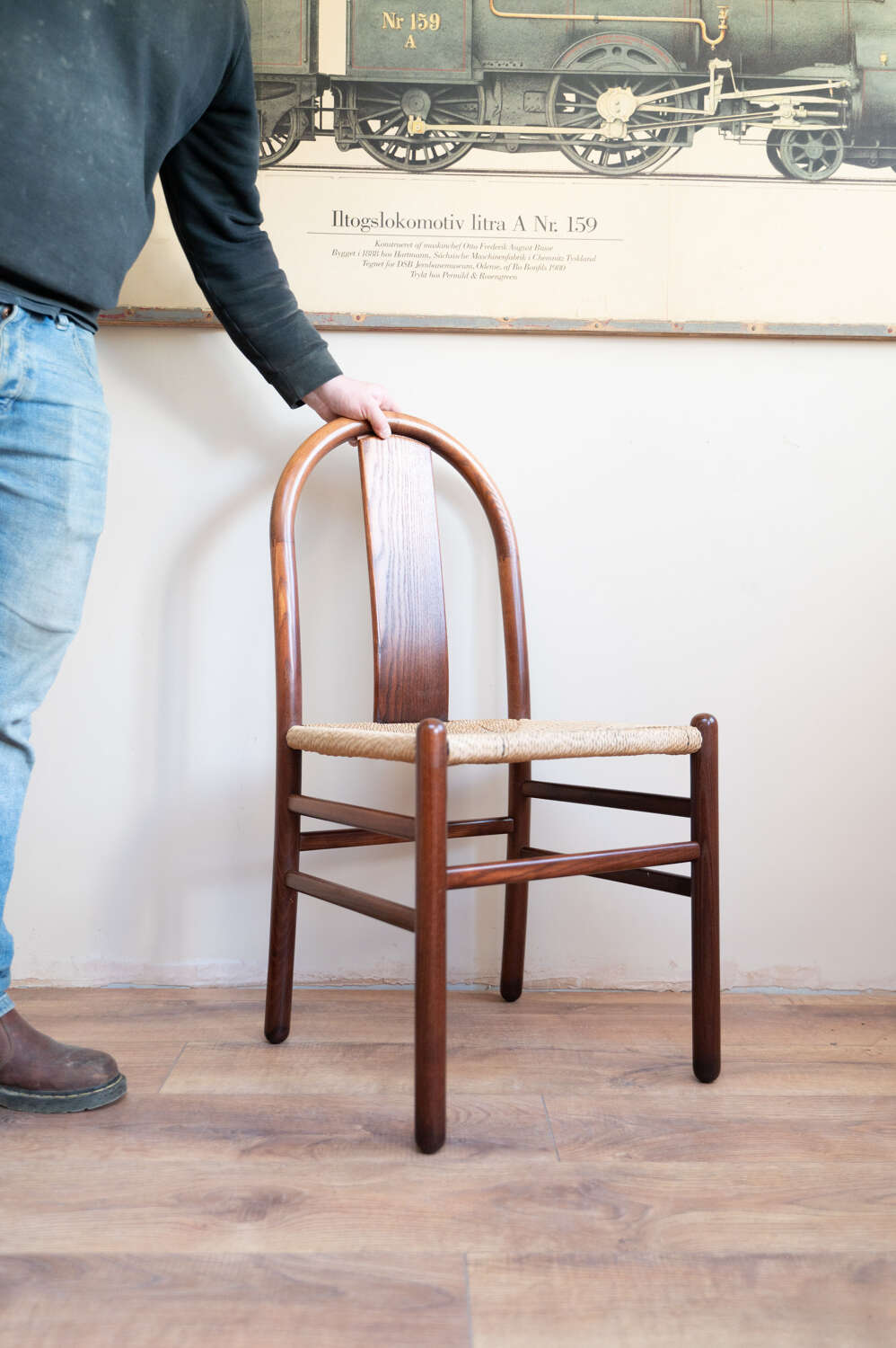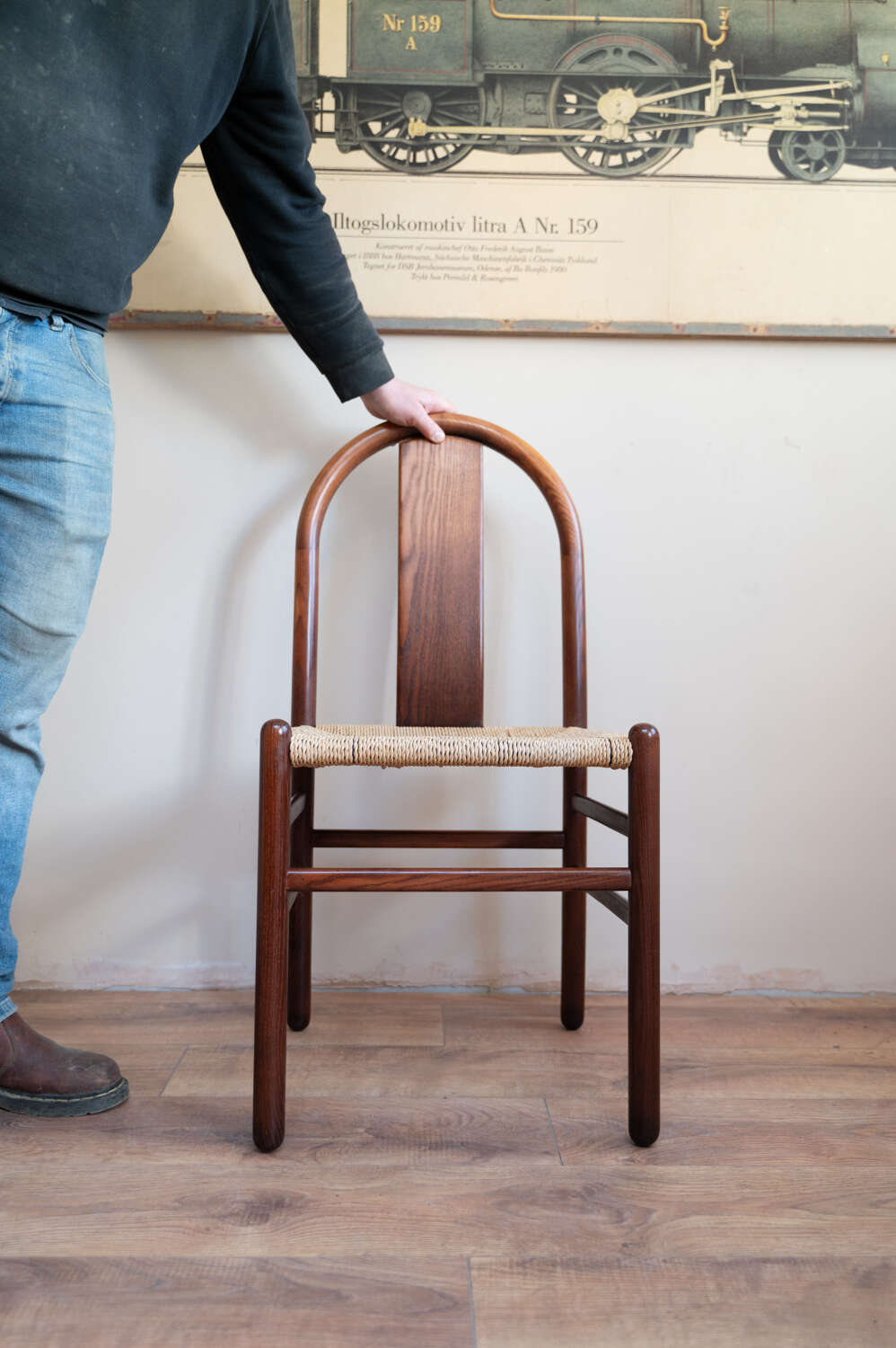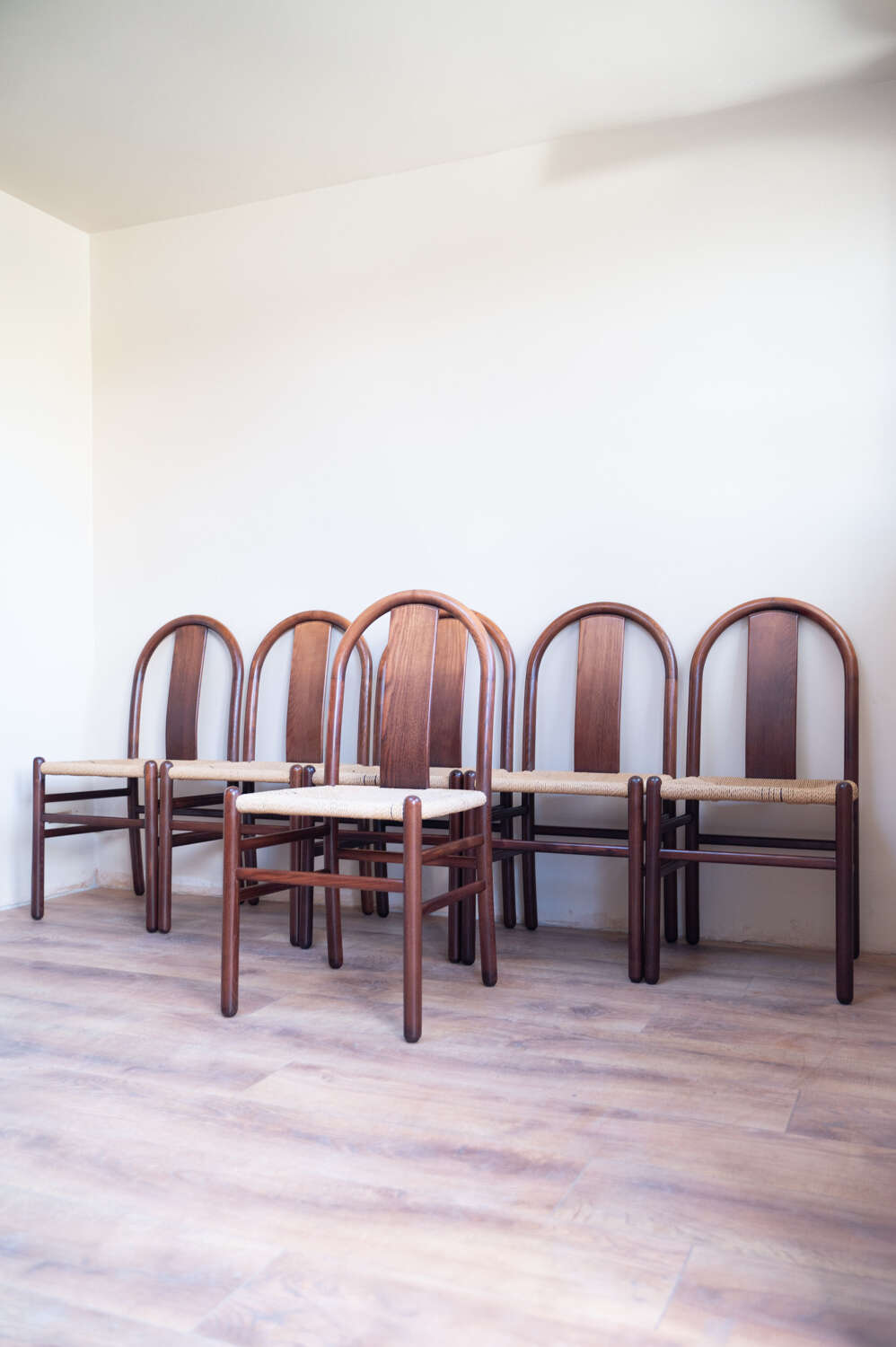 A striking set of six dining chairs designed by Annig Sarian for Tisettanta, dating to the 1980s. The distinctive round-bend wooden frames create a beautifully fluid silhouette, giving the chairs a sculptural quality while remaining comfortable and practical for everyday use. Finished in a rich dark wood tone, the frames are in great structural condition with only minimal surface markings in keeping with careful use. The rush seats remain largely in very good order, with slight natural variation between them as shown in the photographs, adding to their character. A refined and well-balanced set that works effortlessly within both contemporary and design-led interiors, while still bringing warmth and texture to a dining space.Measurements: 89cm Tall (45cm Seat Height) x 44cm Wide x 46cm Deep