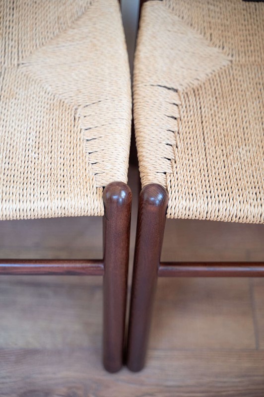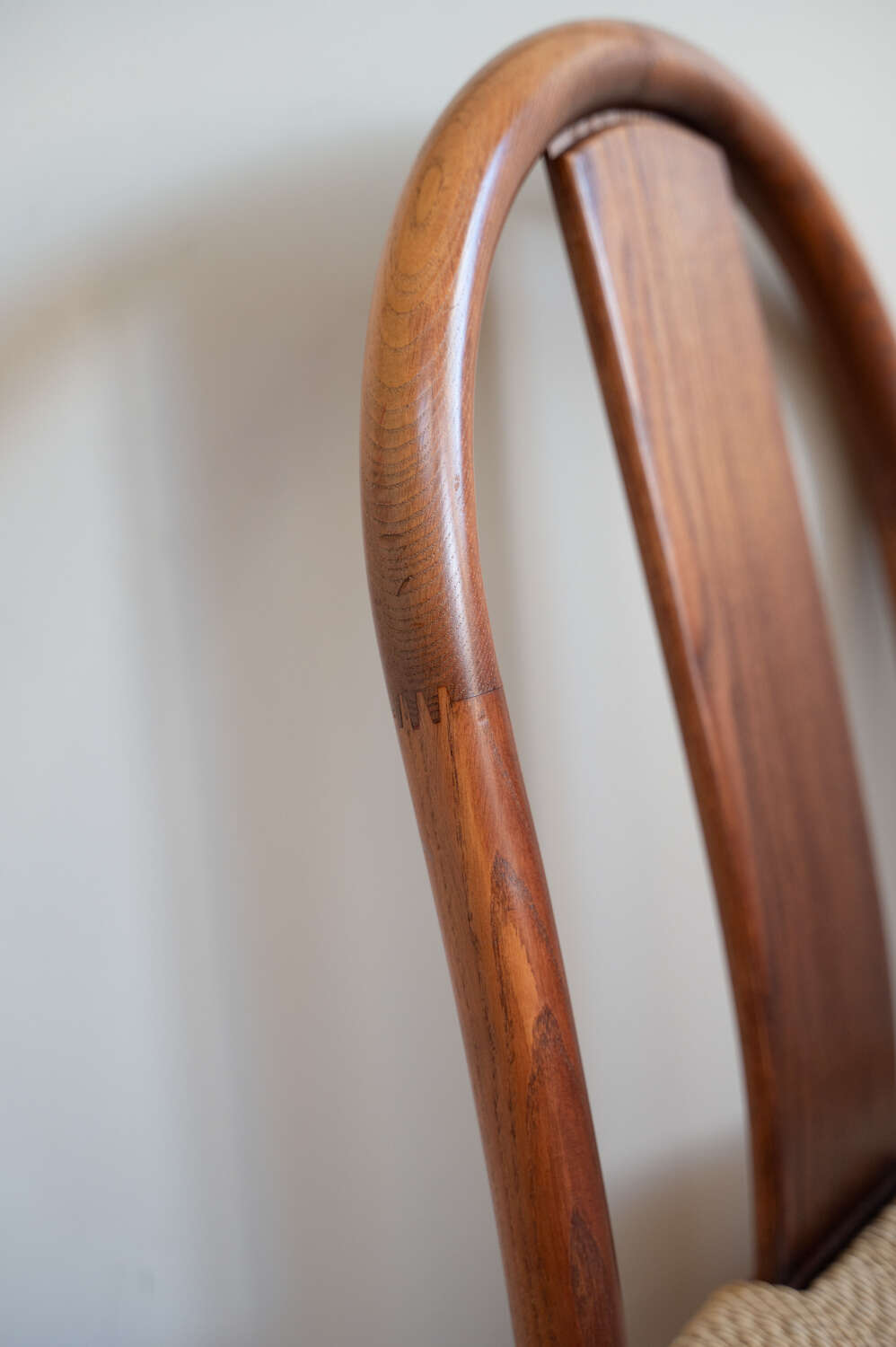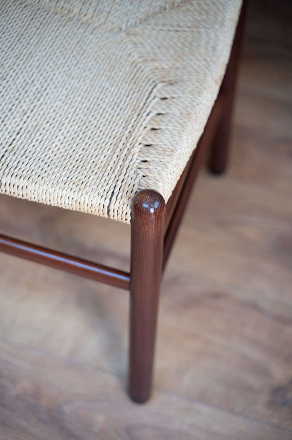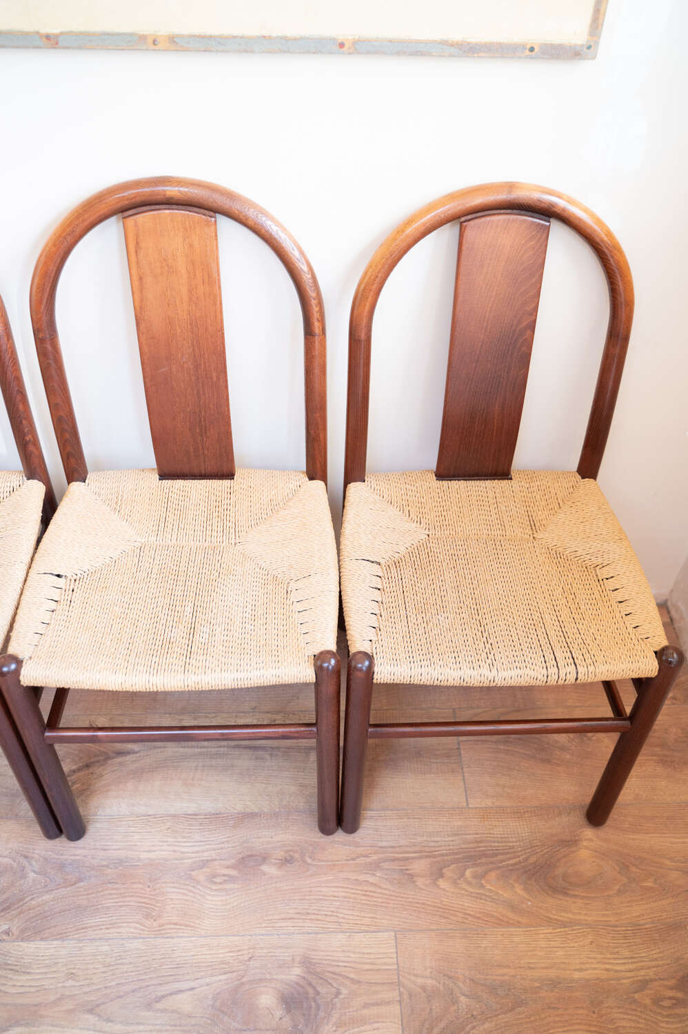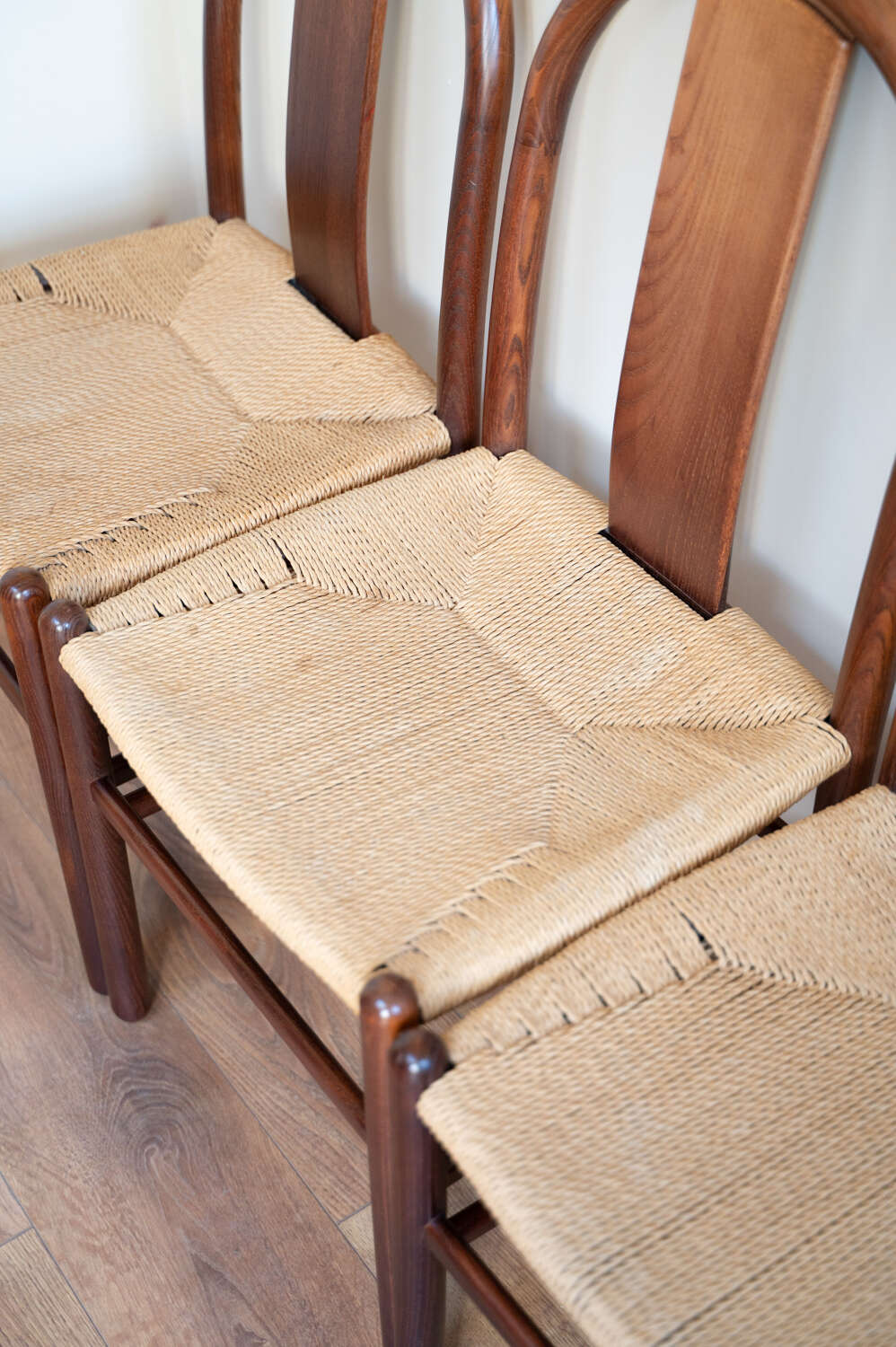A striking set of six dining chairs designed by Annig Sarian for Tisettanta, dating to the 1980s. The distinctive round-bend wooden frames create a beautifully fluid silhouette, giving the chairs a sculptural quality while remaining comfortable and practical for everyday use. Finished in a rich dark wood tone, the frames are in great structural condition with only minimal surface markings in keeping with careful use. The rush seats remain largely in very good order, with slight natural variation between them as shown in the photographs, adding to their character. A refined and well-balanced set that works effortlessly within both contemporary and design-led interiors, while still bringing warmth and texture to a dining space.Measurements: 89cm Tall (45cm Seat Height) x 44cm Wide x 46cm Deep