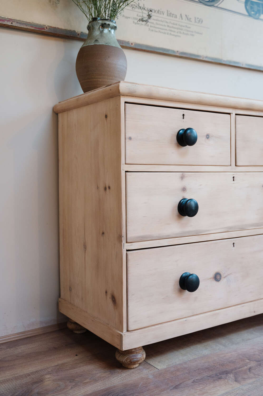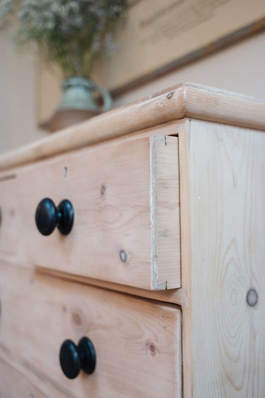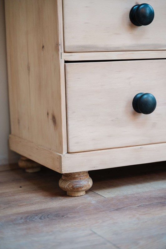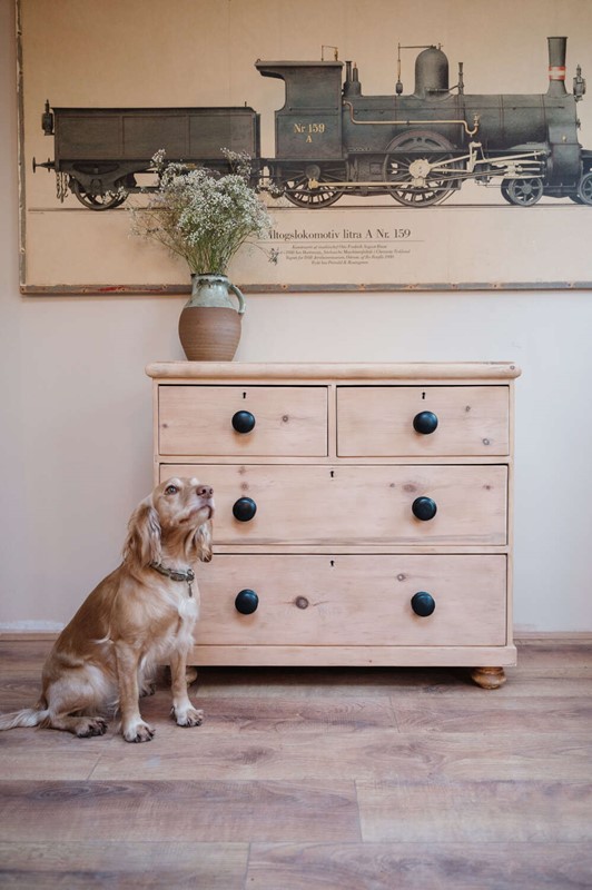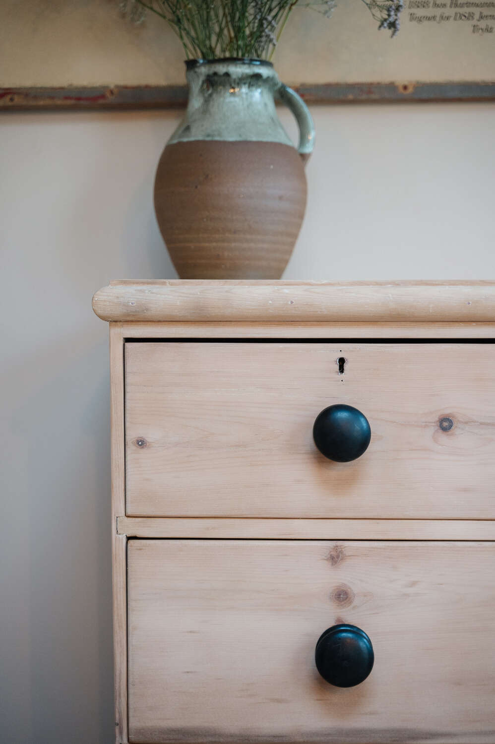 A classic Victorian pine chest of drawers in a timeless 2 over 2 configuration, stripped back to reveal the natural warmth and grain of the timber. Solid and structurally sound, this piece carries gentle signs of age and the stripping process, adding to its honest character and lived-in charm. Finished with vintage black knobs, it offers a subtle contrast against the pale pine and suits both traditional and more relaxed contemporary interiors. A versatile storage piece, ideal for bedrooms, hallways or guest rooms where character is key.Measurements: 80cm Tall x 88.5cm Wide x 43cm Deep
