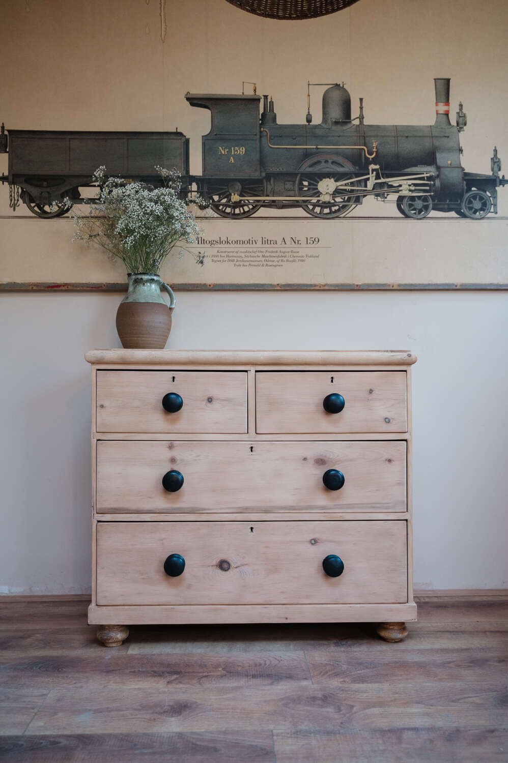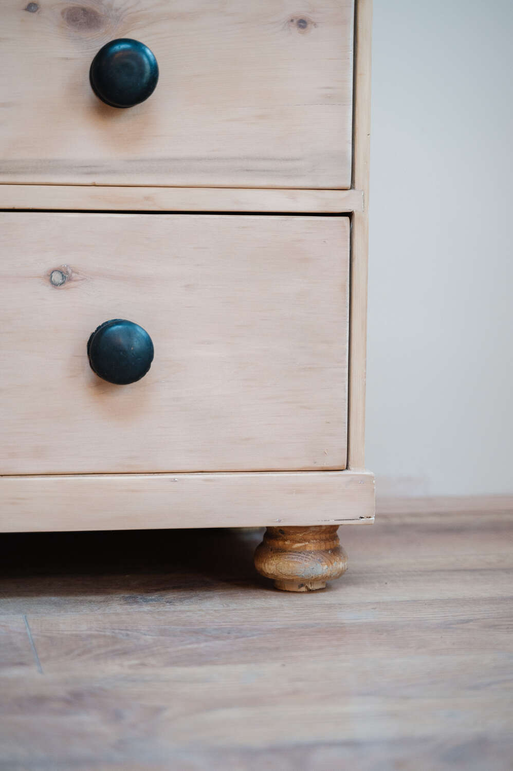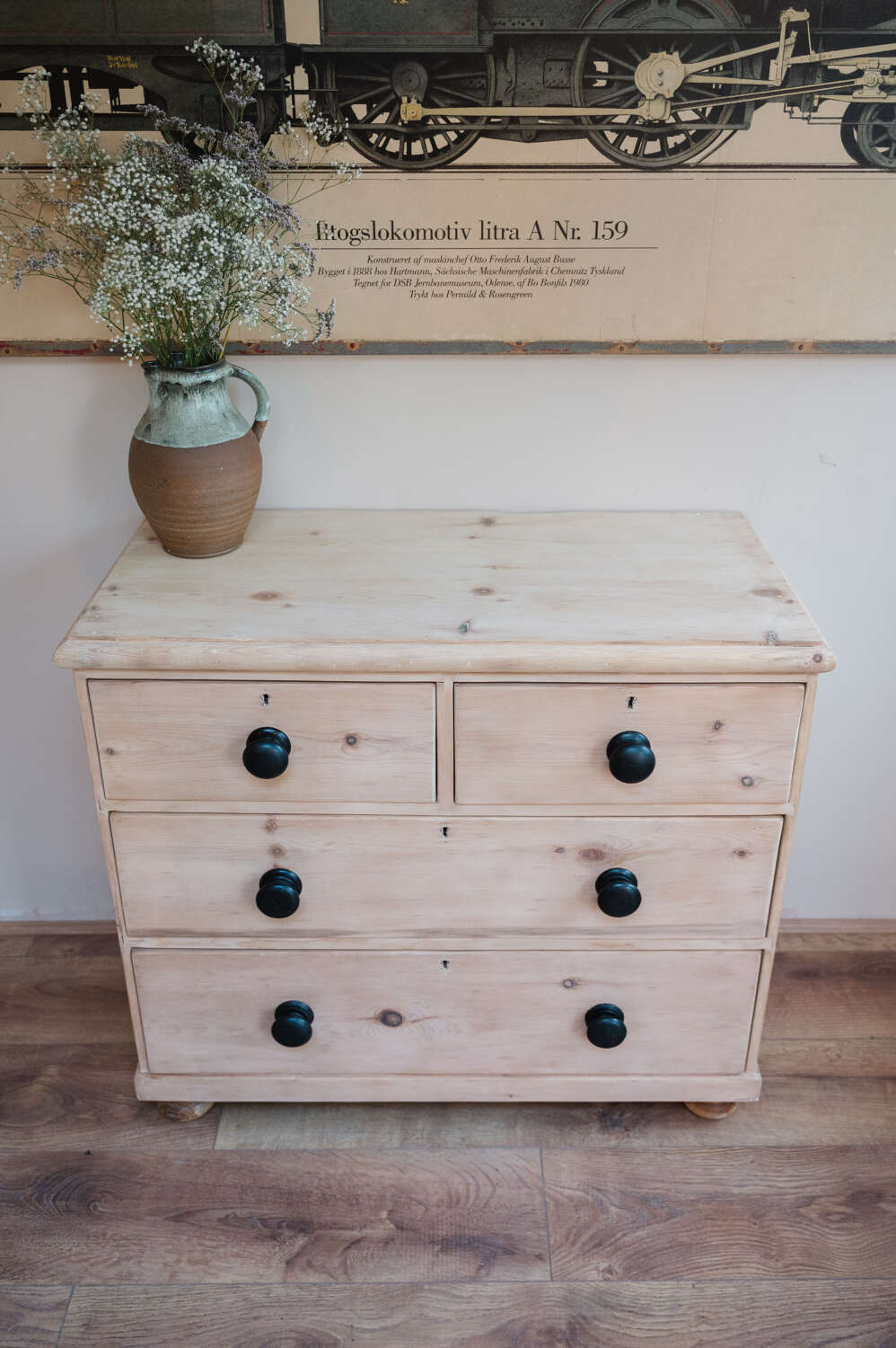 A classic Victorian pine chest of drawers in a timeless 2 over 2 configuration, stripped back to reveal the natural warmth and grain of the timber. Solid and structurally sound, this piece carries gentle signs of age and the stripping process, adding to its honest character and lived-in charm. Finished with vintage black knobs, it offers a subtle contrast against the pale pine and suits both traditional and more relaxed contemporary interiors. A versatile storage piece, ideal for bedrooms, hallways or guest rooms where character is key.Measurements: 80cm Tall x 88.5cm Wide x 43cm Deep
