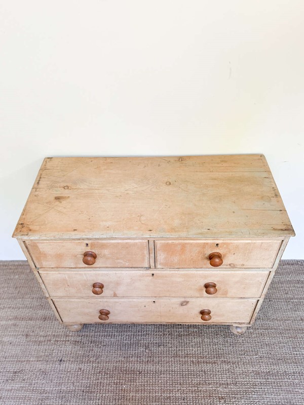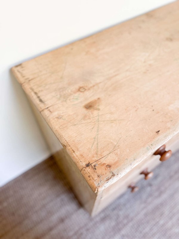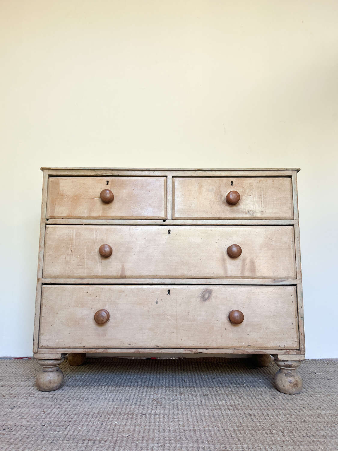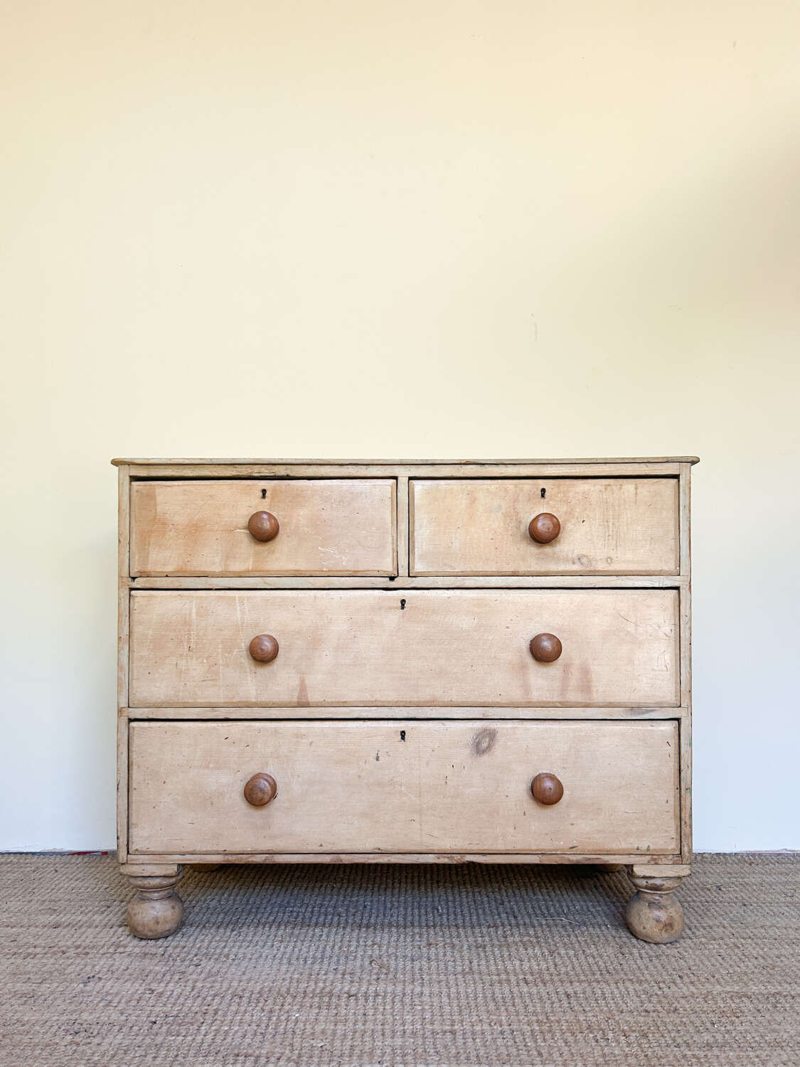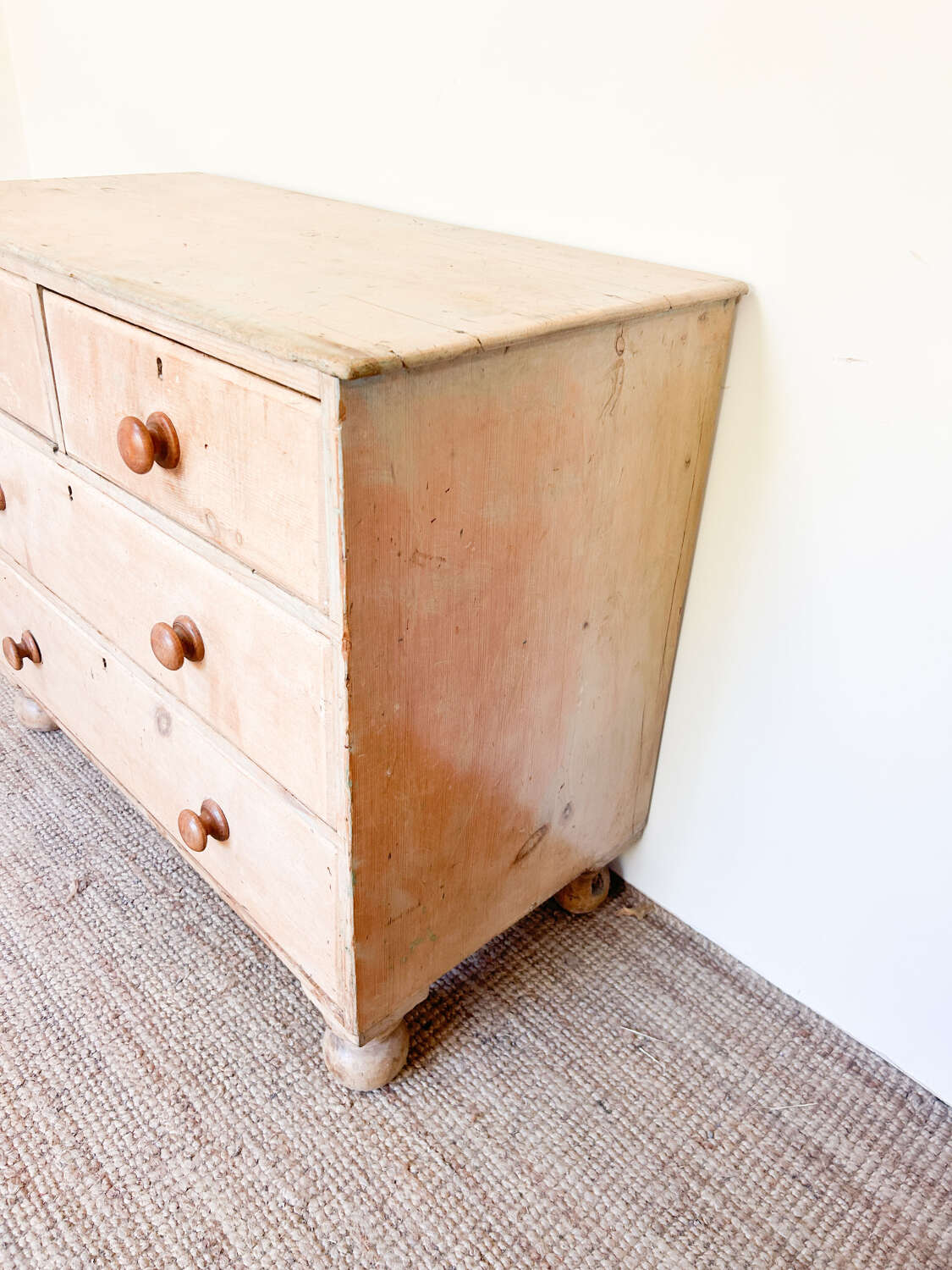 A Victorian pine chest of drawers with simple wooden handles and turned feet, giving it a rustic yet elegant presence. Compact and practical in size, this piece offers versatile storage while showcasing the warm tones and natural grain of pine. Its time-worn finish and patina tell the story of age and use, adding to its authentic antique charm. Perfect for a bedroom, hallway, or country-inspired interior.Measurements: 81.5cm Tall x 99cm Wide x 50.5cm Deep (47.5 deep top surface)