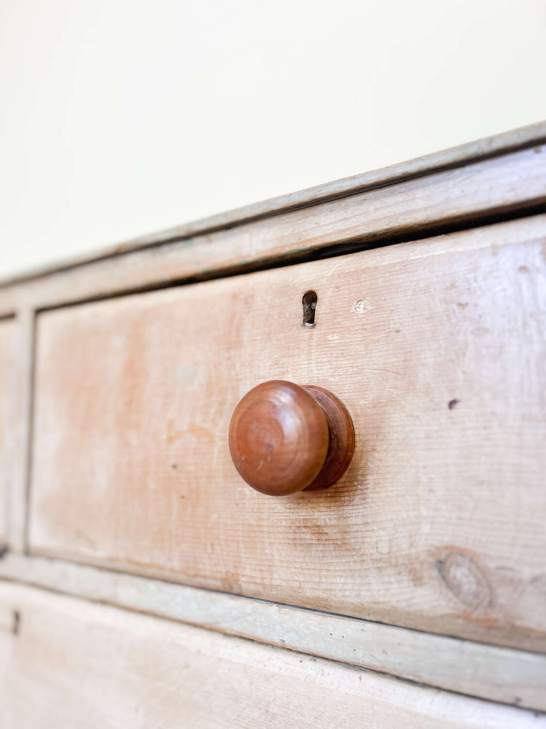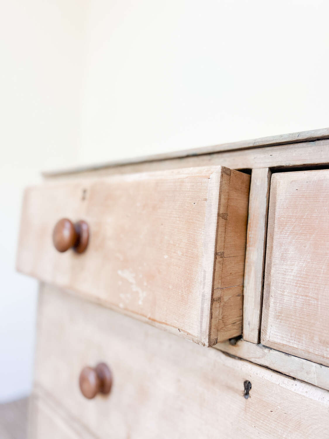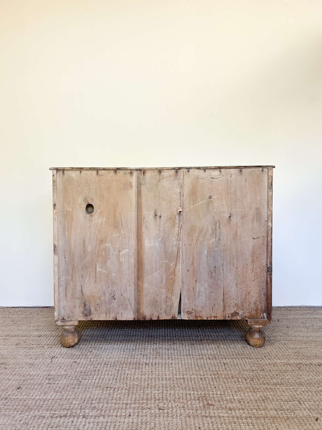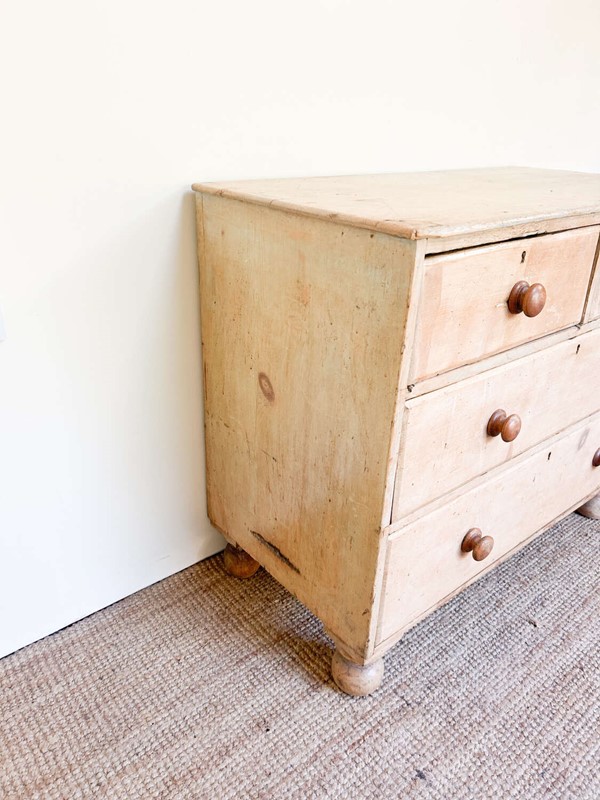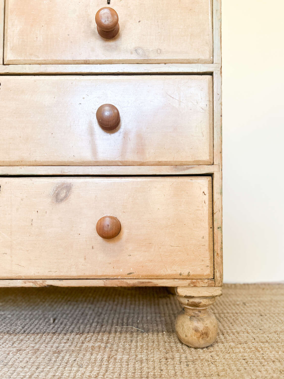 A Victorian pine chest of drawers with simple wooden handles and turned feet, giving it a rustic yet elegant presence. Compact and practical in size, this piece offers versatile storage while showcasing the warm tones and natural grain of pine. Its time-worn finish and patina tell the story of age and use, adding to its authentic antique charm. Perfect for a bedroom, hallway, or country-inspired interior.Measurements: 81.5cm Tall x 99cm Wide x 50.5cm Deep (47.5 deep top surface)