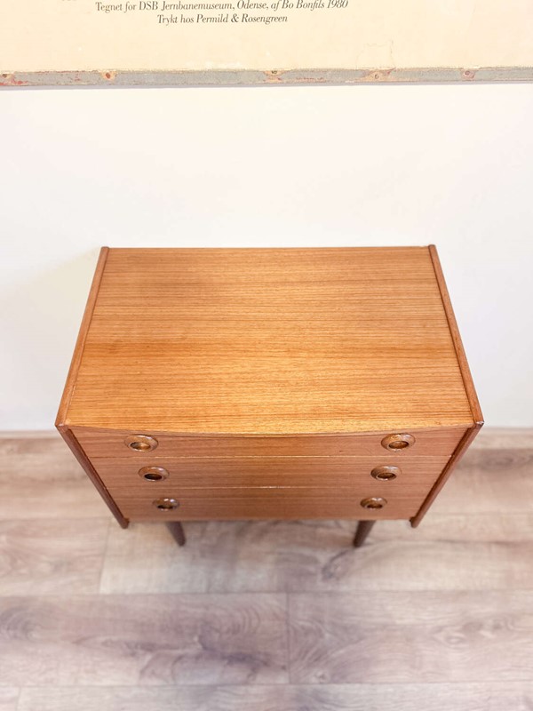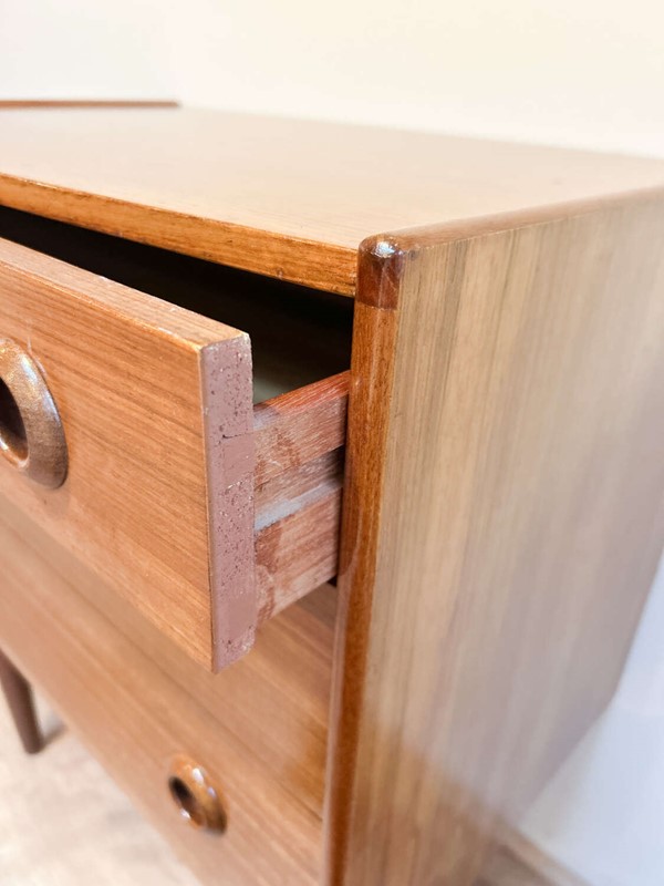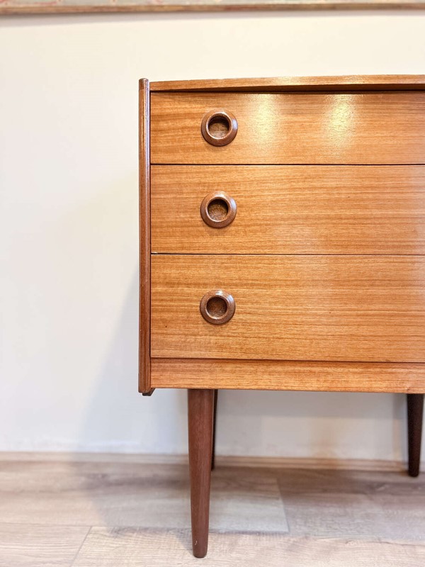 A smart and well-proportioned vintage chest of drawers by Avalon, dating to the 1960s and crafted in warm-toned teak. A classic mid-century design with clean lines, subtle detailing and beautifully figured grain throughout.The three drawers offer generous storage and sit within a solid, well-made carcass. The removable legs make this piece particularly versatile, allowing it to work equally well in bedrooms, hallways or as adaptable storage within a modern interior.Presented in good vintage condition, with light, age-related wear that adds to its character and confirms its authenticity, without detracting from its overall appearance or use.A timeless and practical piece of British mid-century furniture.Measurements: 72.5cm Tall x 63cm Wide x 40cm Deep