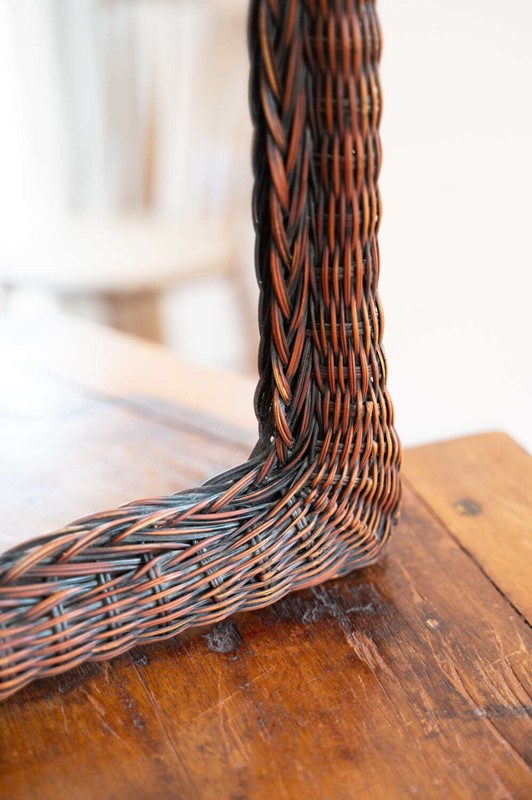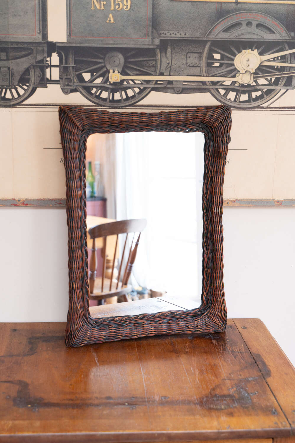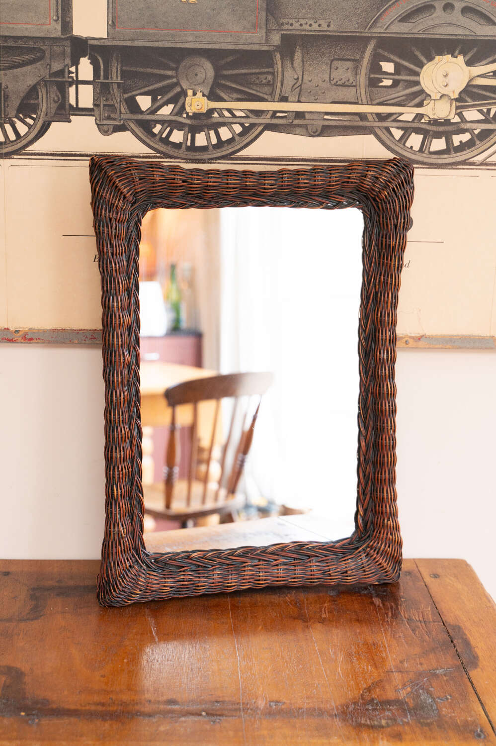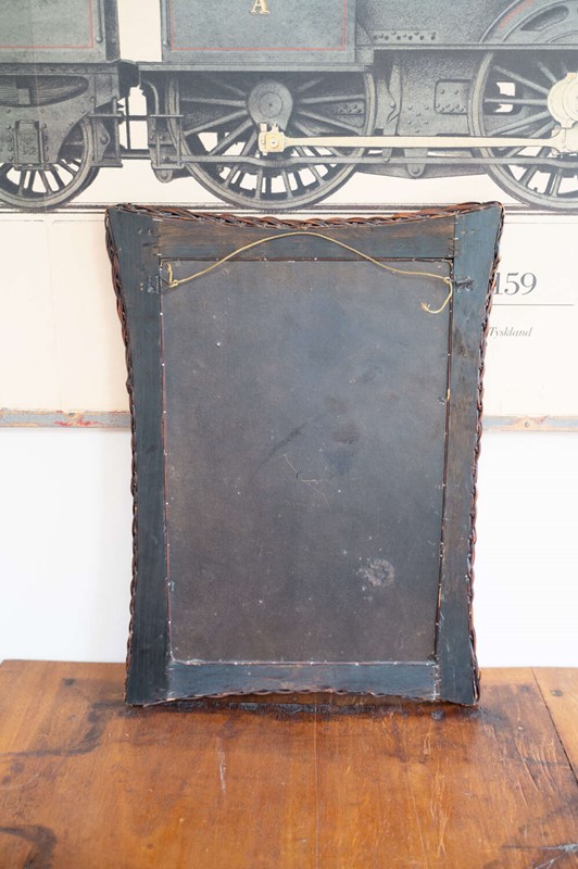 A decorative vintage wall mirror with a dark woven rattan frame and simple rectangular form. The texture of the weave adds depth and interest, while the darker tone gives it a slightly more grounded, moody feel. Easy to place, it works well in hallways, bathrooms or layered into a gallery wall for added texture. In good vintage condition with light character in keeping with age. A versatile and quietly decorative piece.Measurements: 55.5cm Tall x 41cm Wide x 3.5cm Deep