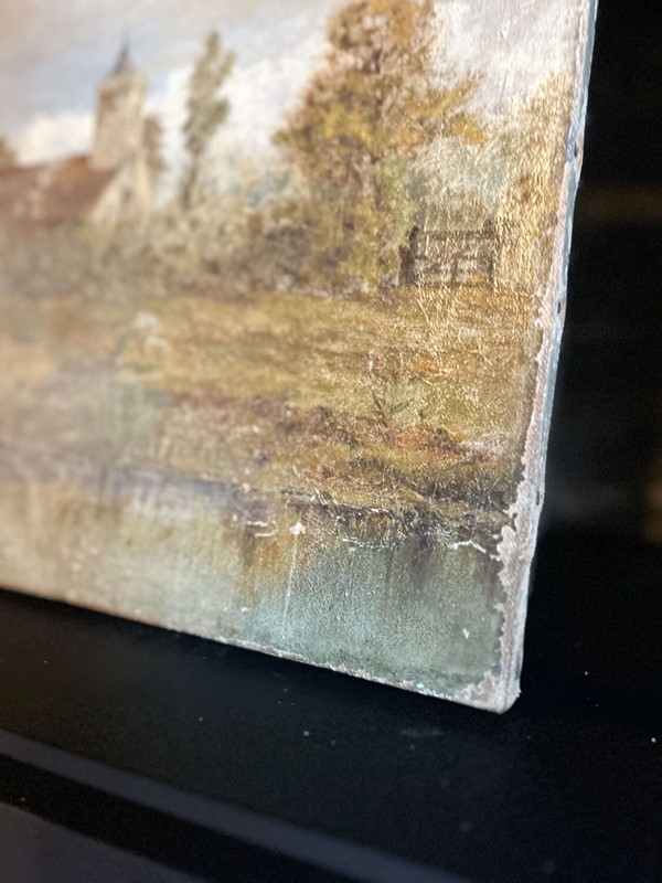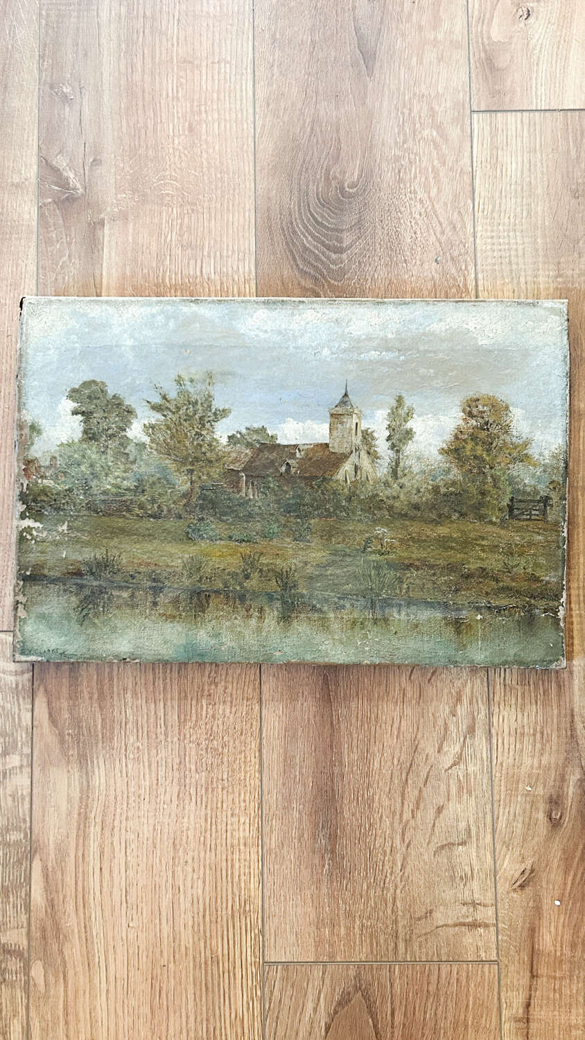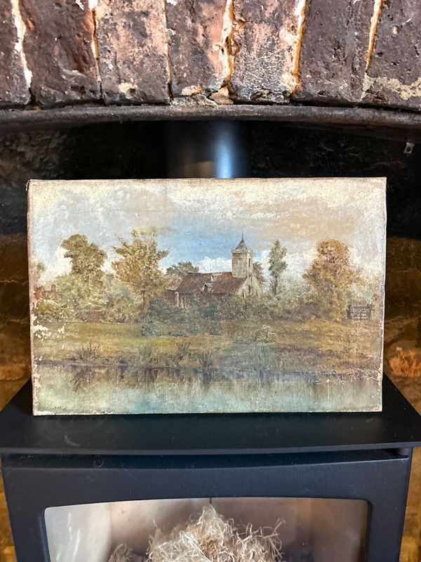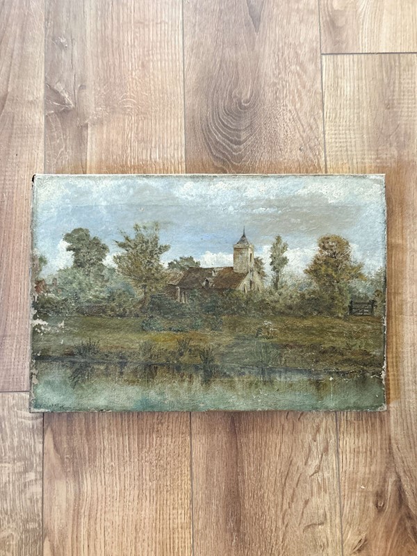 Vintage Oil On Canvas Landscape With Church & Trees By R.A. Clarke