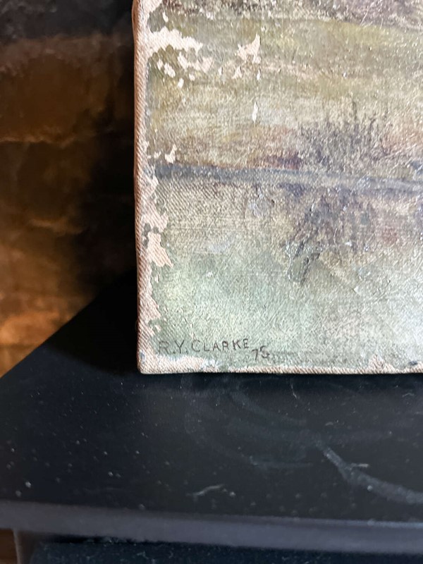 A charming vintage oil on canvas painting by R.A. Clarke, depicting a peaceful rural scene with trees framing a country church.