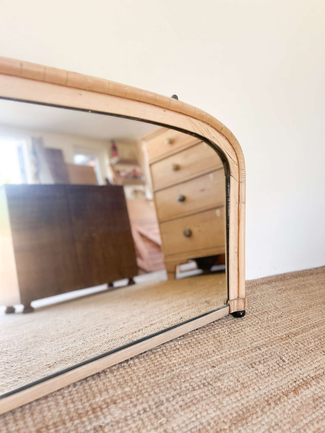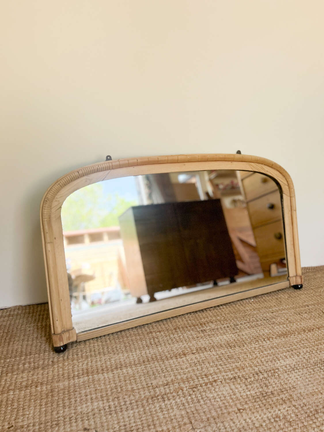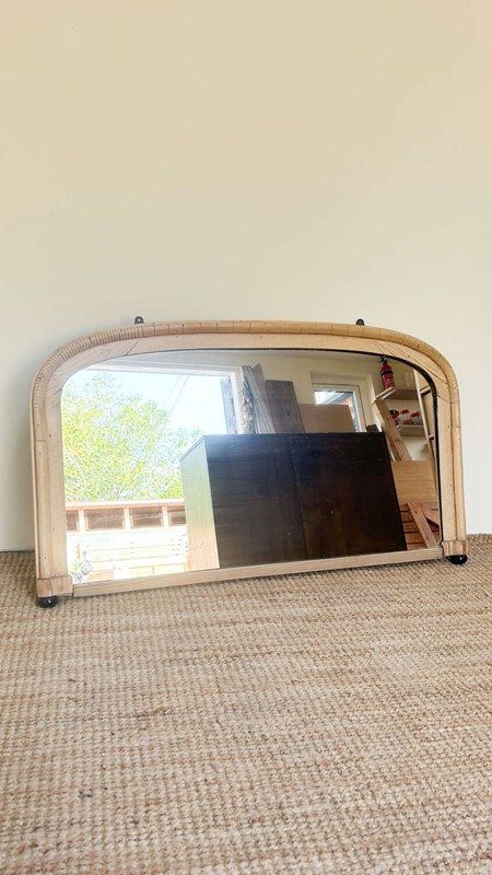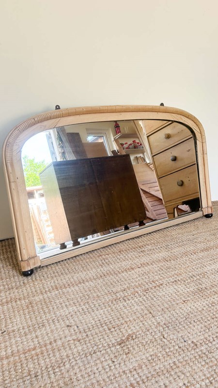 A charming and characterful vintage pine mirror, likely a lovingly handmade piece. Its one-of-a-kind design feels like a blend of ideas, places, and inspirations — giving it a distinct personality that sets it apart from the usual.With small feet for tabletop display and brackets for wall hanging, it's flexible in its use and full of warmth. The soft, honeyed pine frame has aged beautifully, with wear and imperfections that add soul rather than take away from its appeal.A true conversation piece for those who love furniture with feeling.Measurements: 57cm Tall x 100.5cm Wide x 5cm Deep at feet