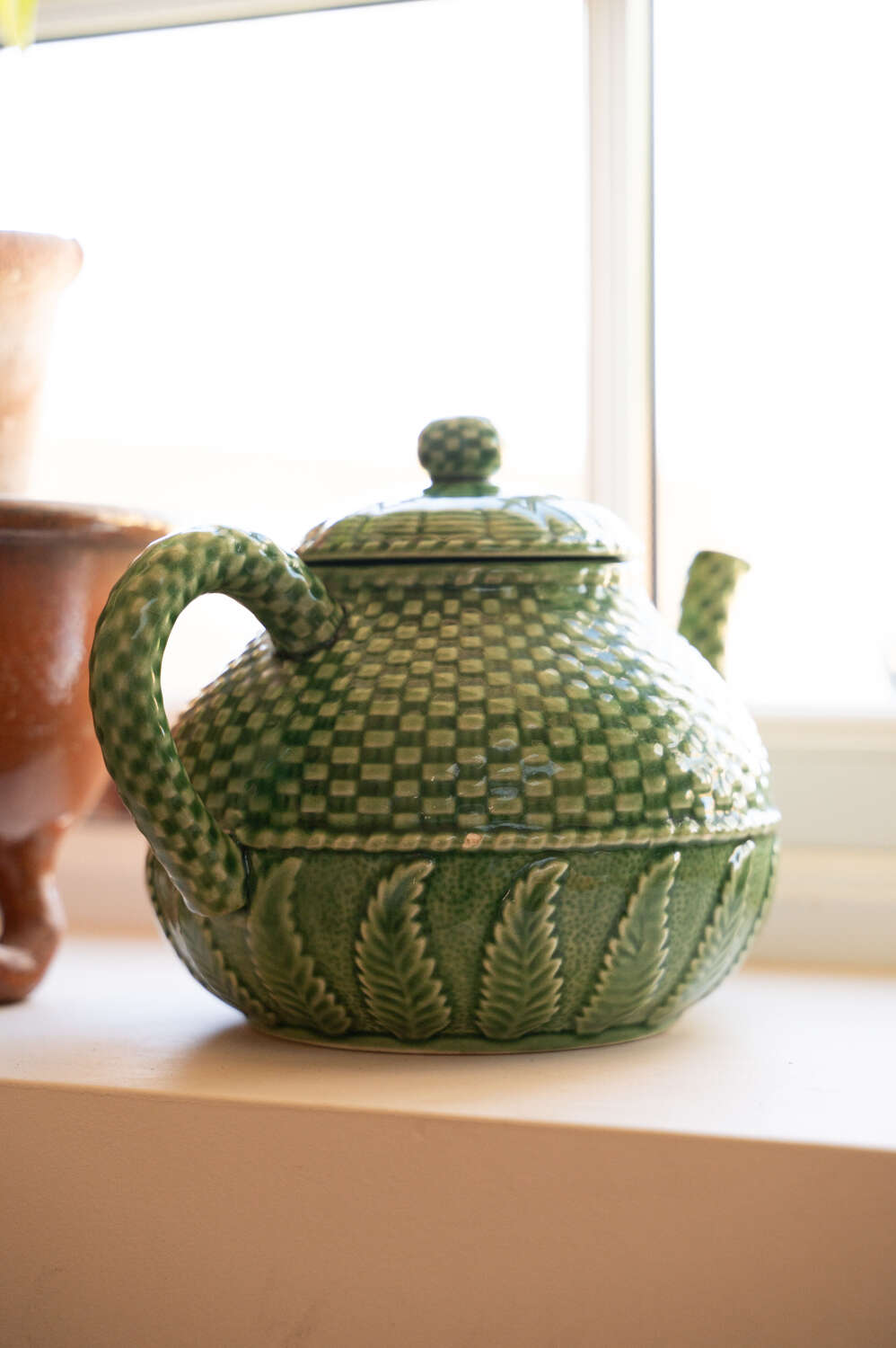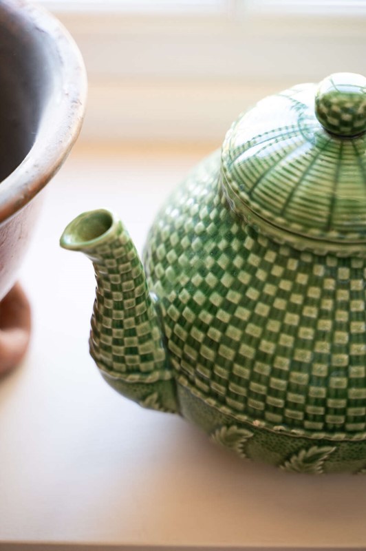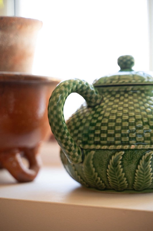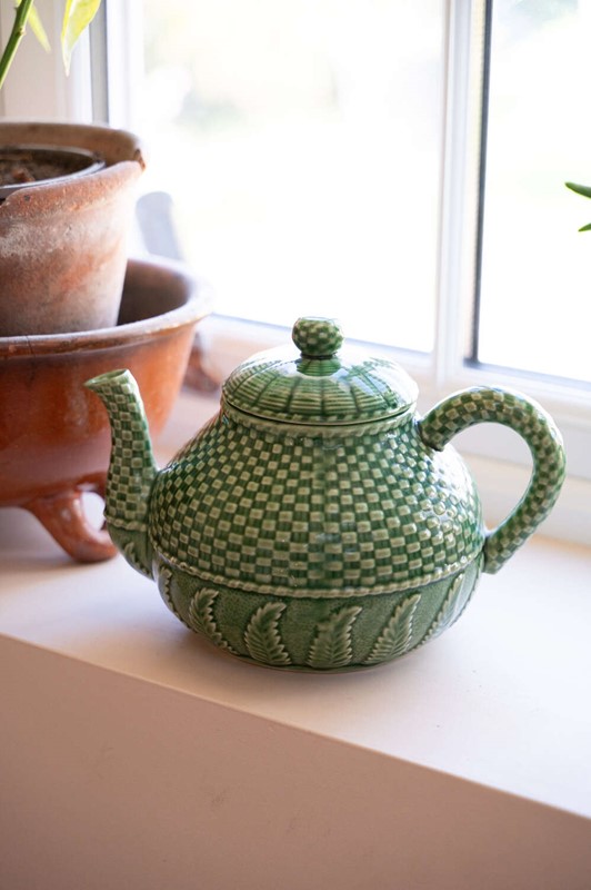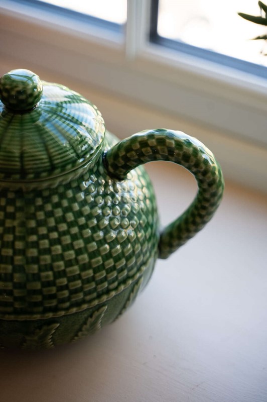 A beautifully detailed green majolica teapot by Bordallo Pinheiro, featuring the maker’s distinctive basket weave and fern pattern. Richly textured and full of movement, the design captures the naturalistic style the Portuguese ceramics house is so well known for. The deep green glaze highlights the layered fern detailing while the woven basket motif adds depth and visual interest from every angle. Both decorative and practical, it makes a wonderful serving piece or display item within a kitchen dresser or open shelving. In good vintage condition, with the vibrant glaze and sculptural detail making it a lovely example of Bordallo Pinheiro’s celebrated majolica work.Measurements: 16.5cm Wide and Deep body x 16.5cm tall x 23.5cm long