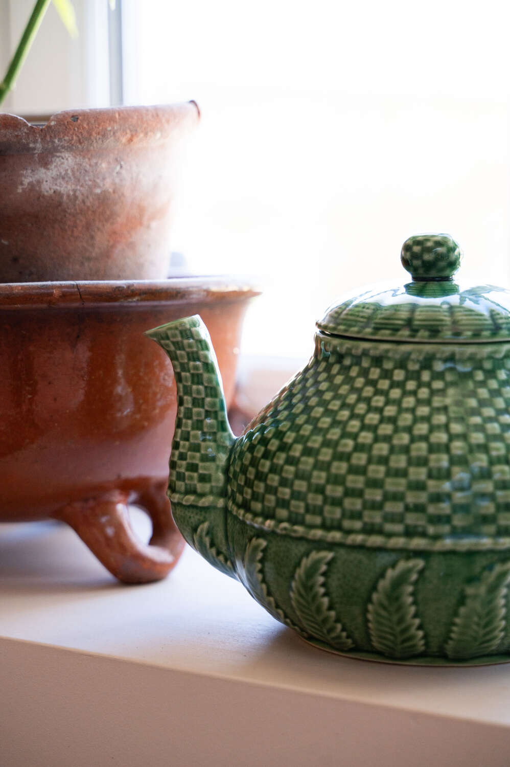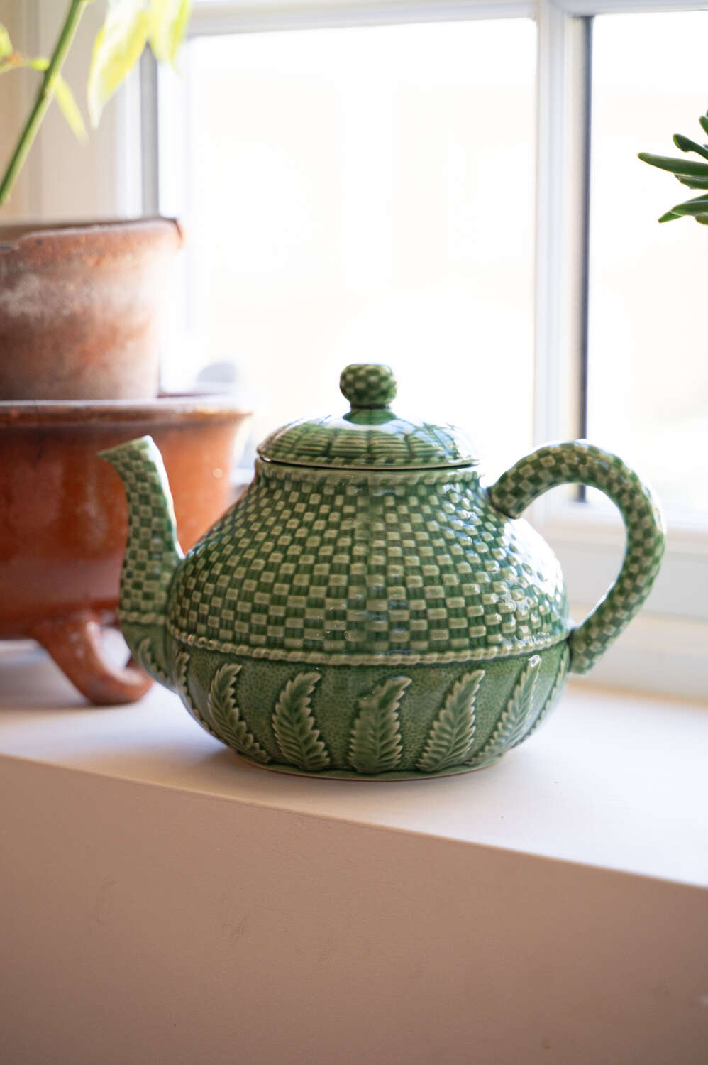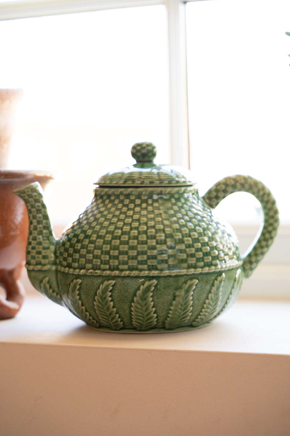 A beautifully detailed green majolica teapot by Bordallo Pinheiro, featuring the maker’s distinctive basket weave and fern pattern. Richly textured and full of movement, the design captures the naturalistic style the Portuguese ceramics house is so well known for. The deep green glaze highlights the layered fern detailing while the woven basket motif adds depth and visual interest from every angle. Both decorative and practical, it makes a wonderful serving piece or display item within a kitchen dresser or open shelving. In good vintage condition, with the vibrant glaze and sculptural detail making it a lovely example of Bordallo Pinheiro’s celebrated majolica work.Measurements: 16.5cm Wide and Deep body x 16.5cm tall x 23.5cm long