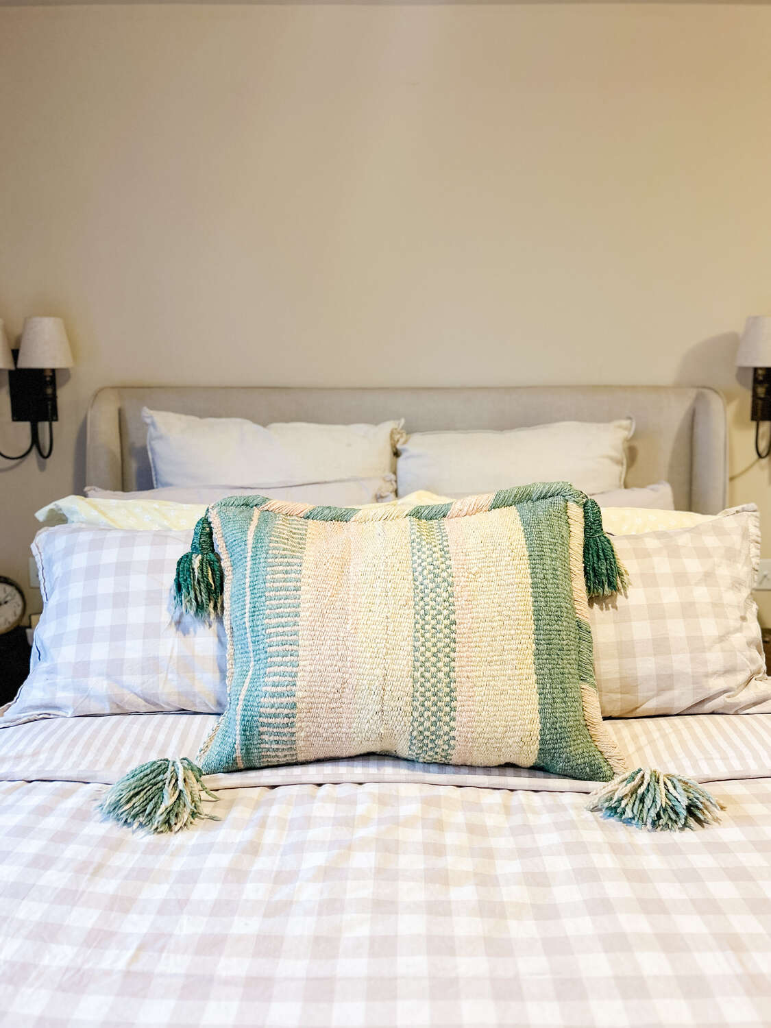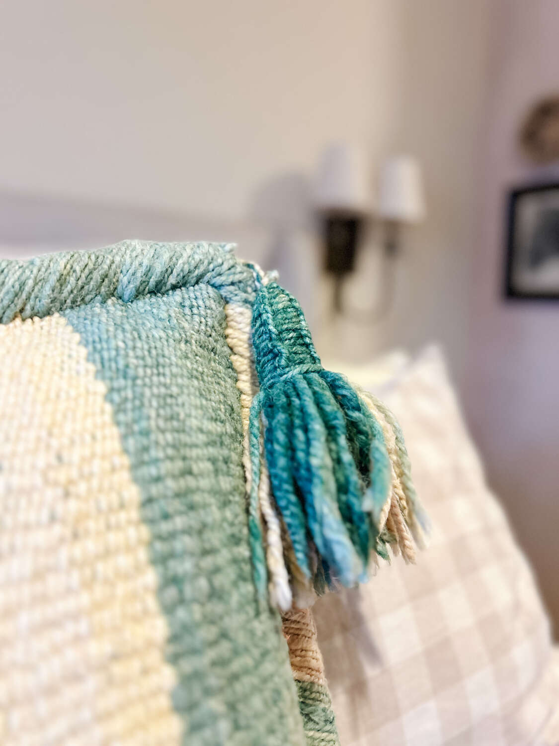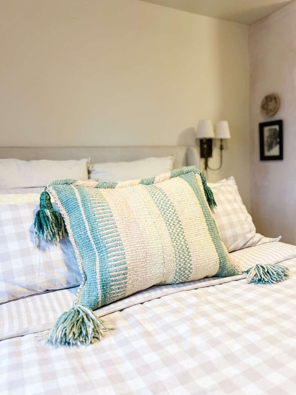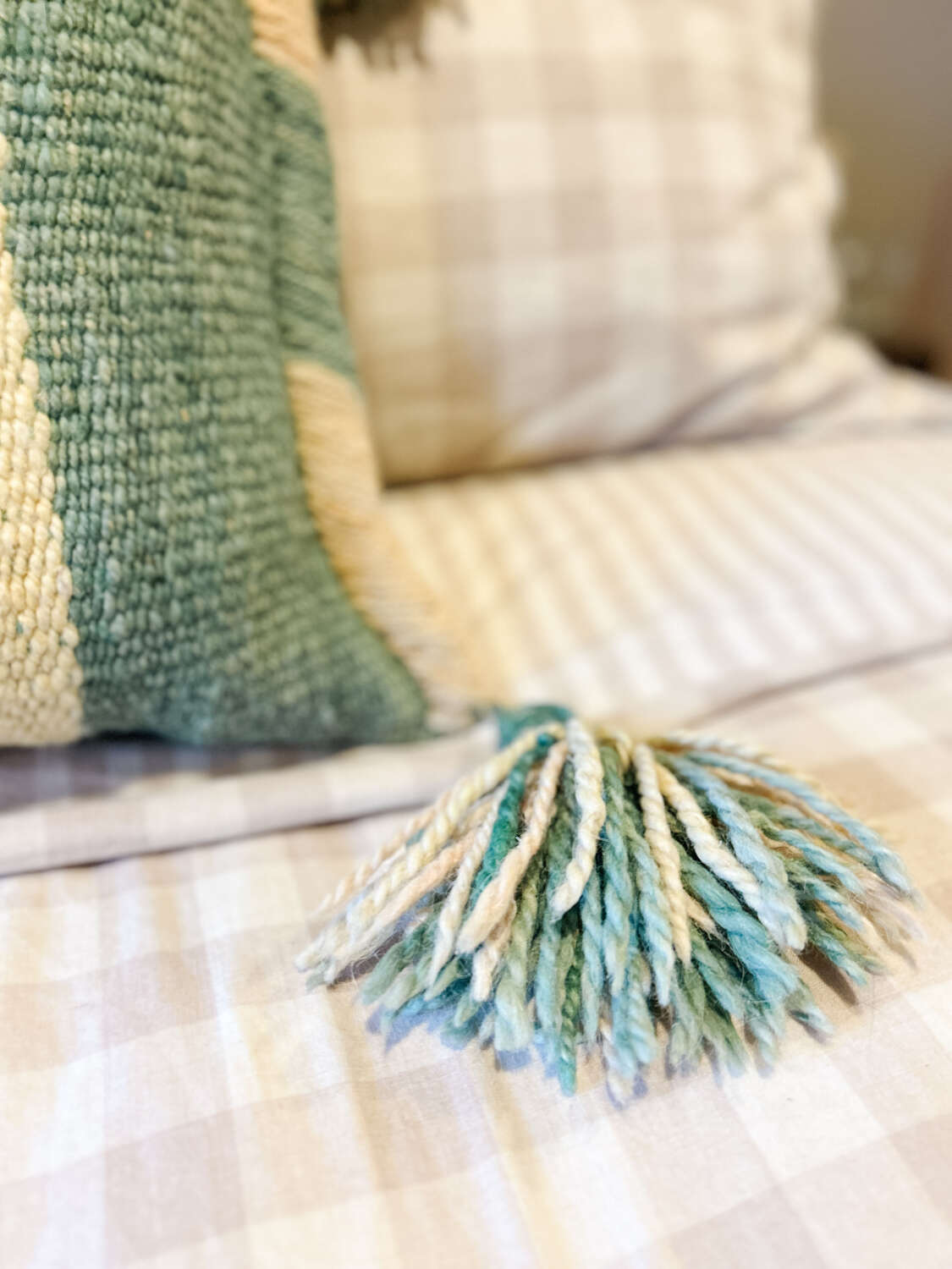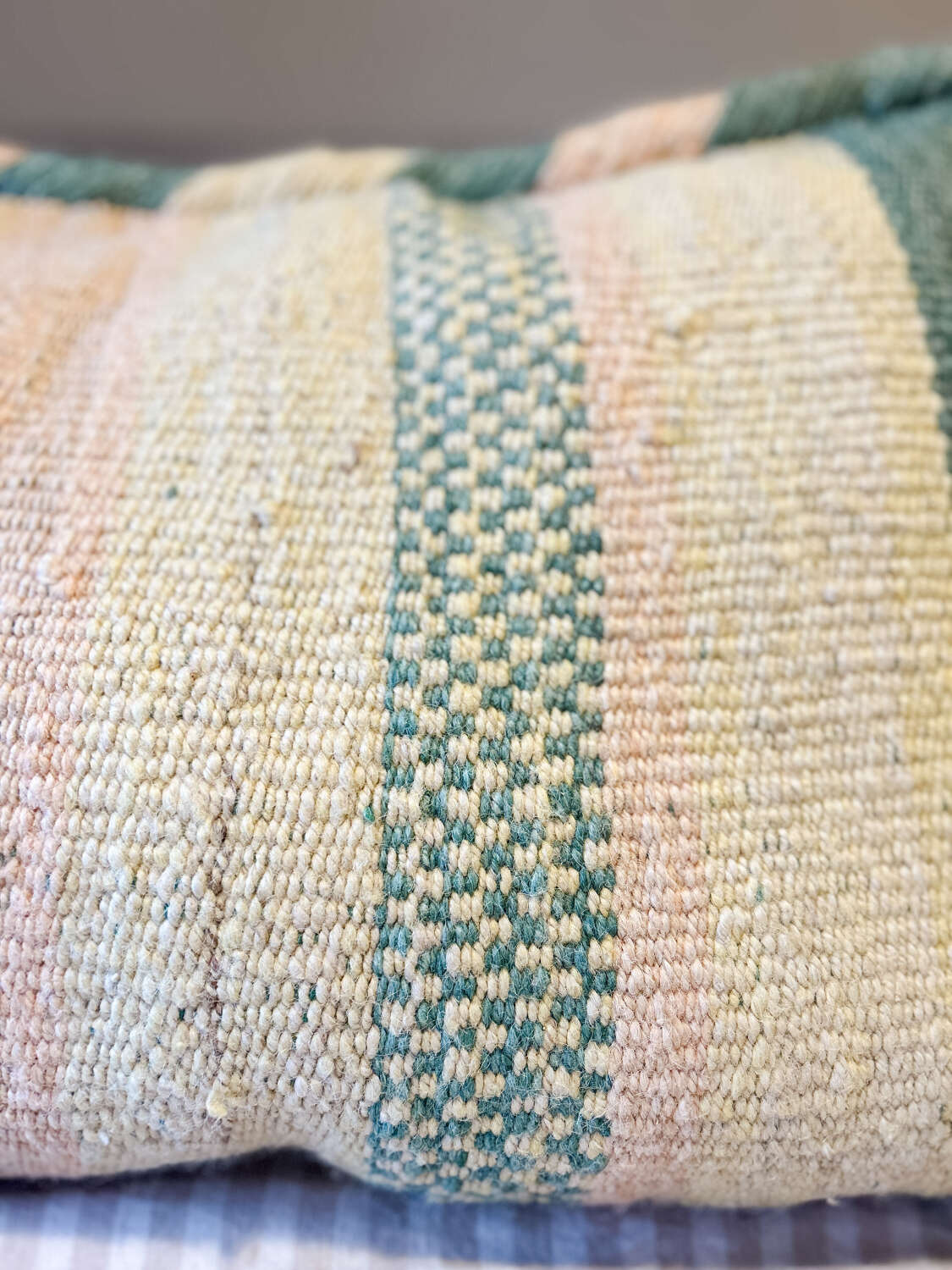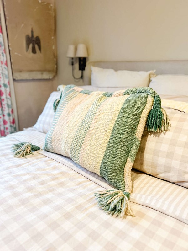 A beautifully textured vintage woven Kilim cushion, featuring soft, muted tones of cream, sage and teal with subtle geometric striping. Finished with generous tassels to each corner, it has a relaxed, artisan feel that works effortlessly in both traditional and contemporary interiors.The cushion is feather filled, giving it a lovely weight and softness, ideal for layering on a bed, sofa or occasional chair. The woven surface shows gentle variation and texture, adding depth and visual interest without overpowering a space.A characterful decorative piece that brings warmth, pattern and a touch of global influence to an interior.Measurements: 50cm Tall x 68cm Wide x 13cm Deep