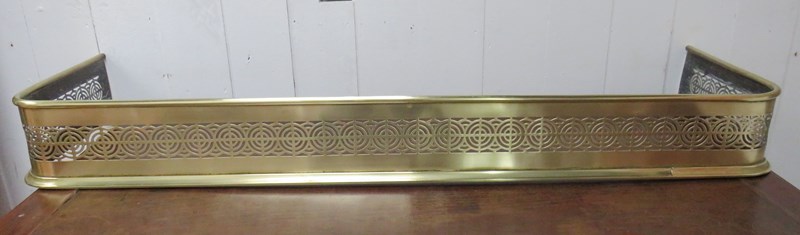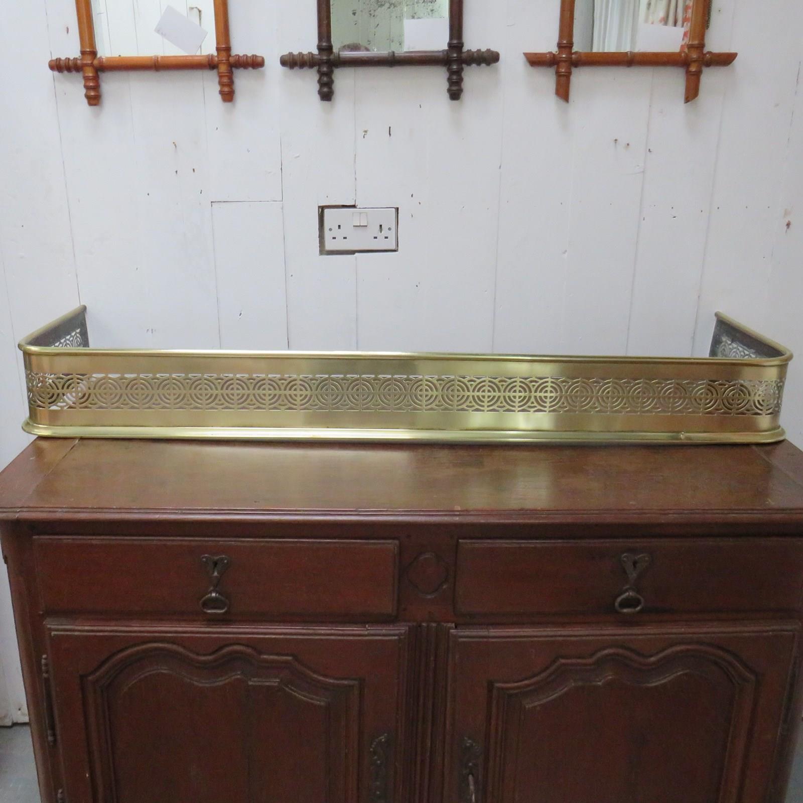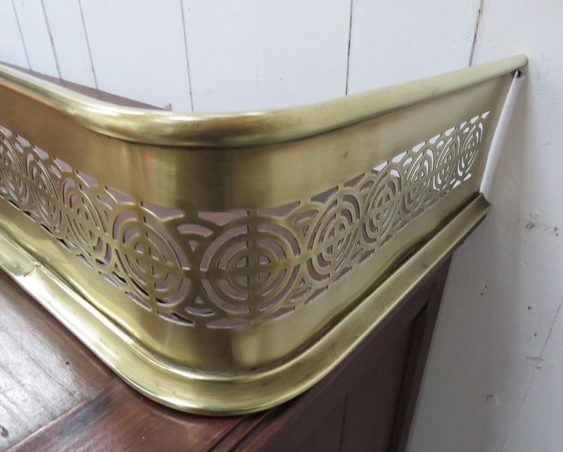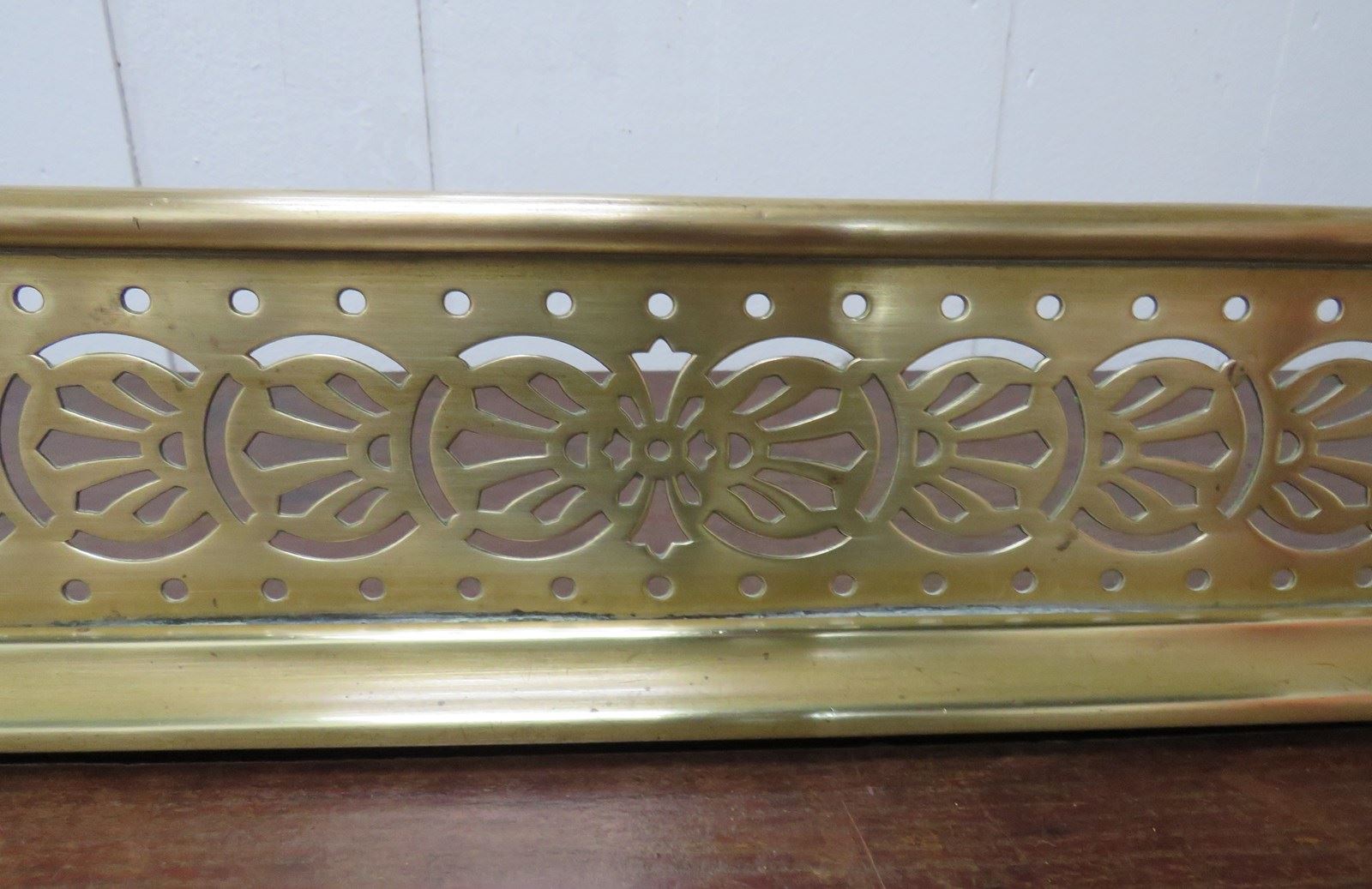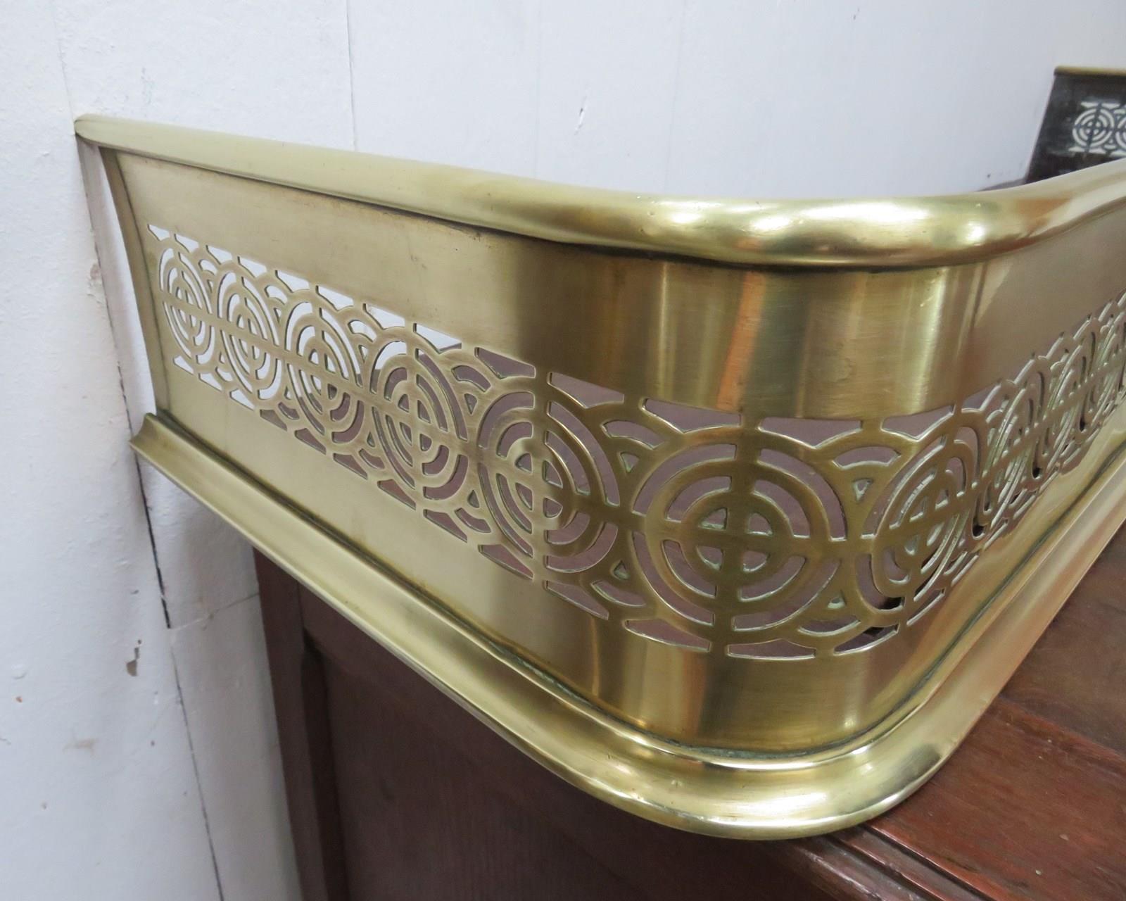 Shapely early 20th century English decorative pierced brass fire place fender.