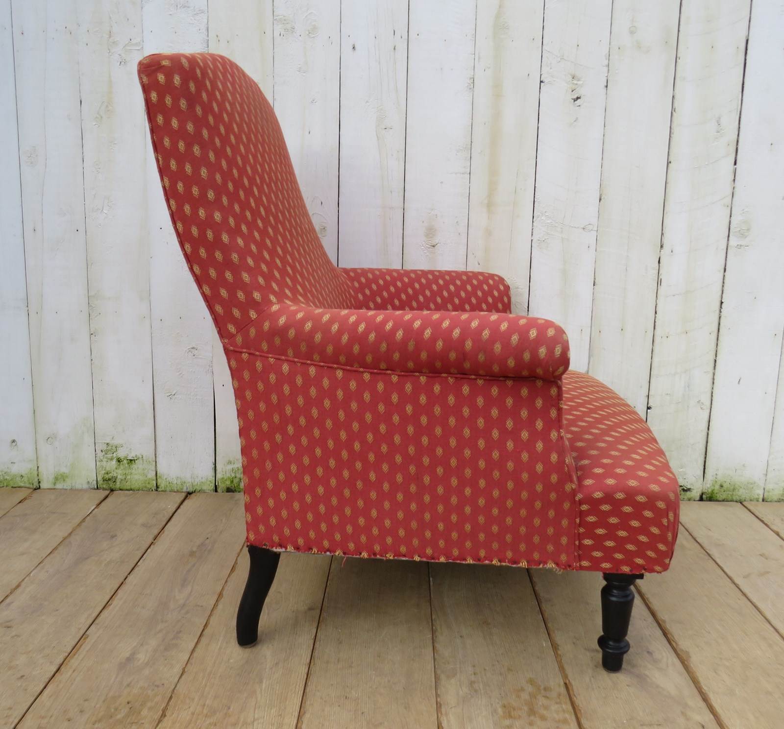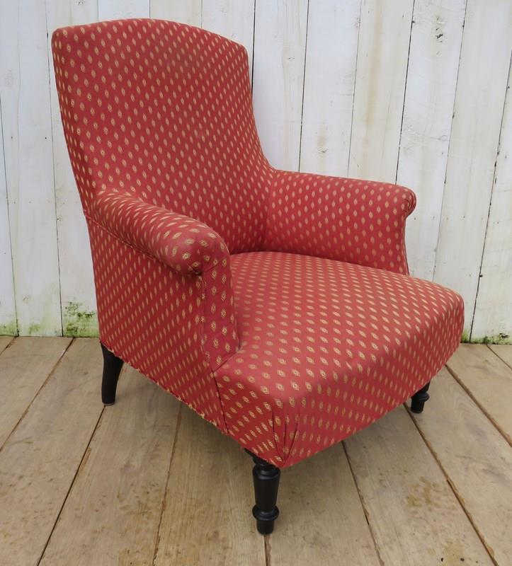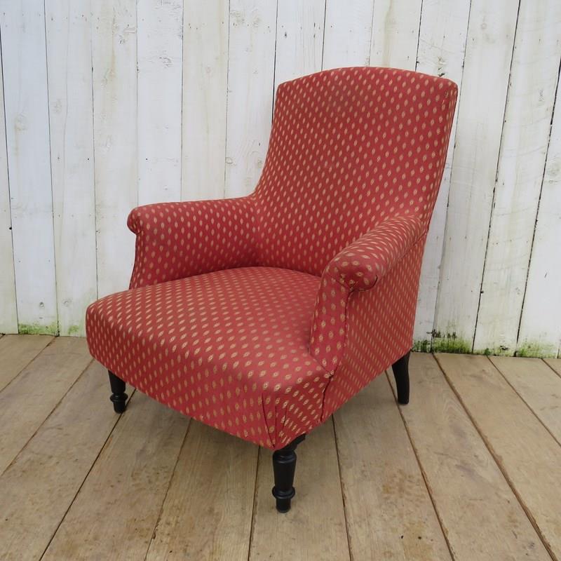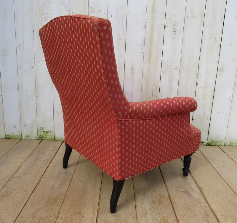 Shapely, sound, sturdy and sprung 19th century French high back Napoleon III armchair on ebonized legs for re-upholstery or used as is with a clean. Seat height 42 cm & seat depth 54 cm.
