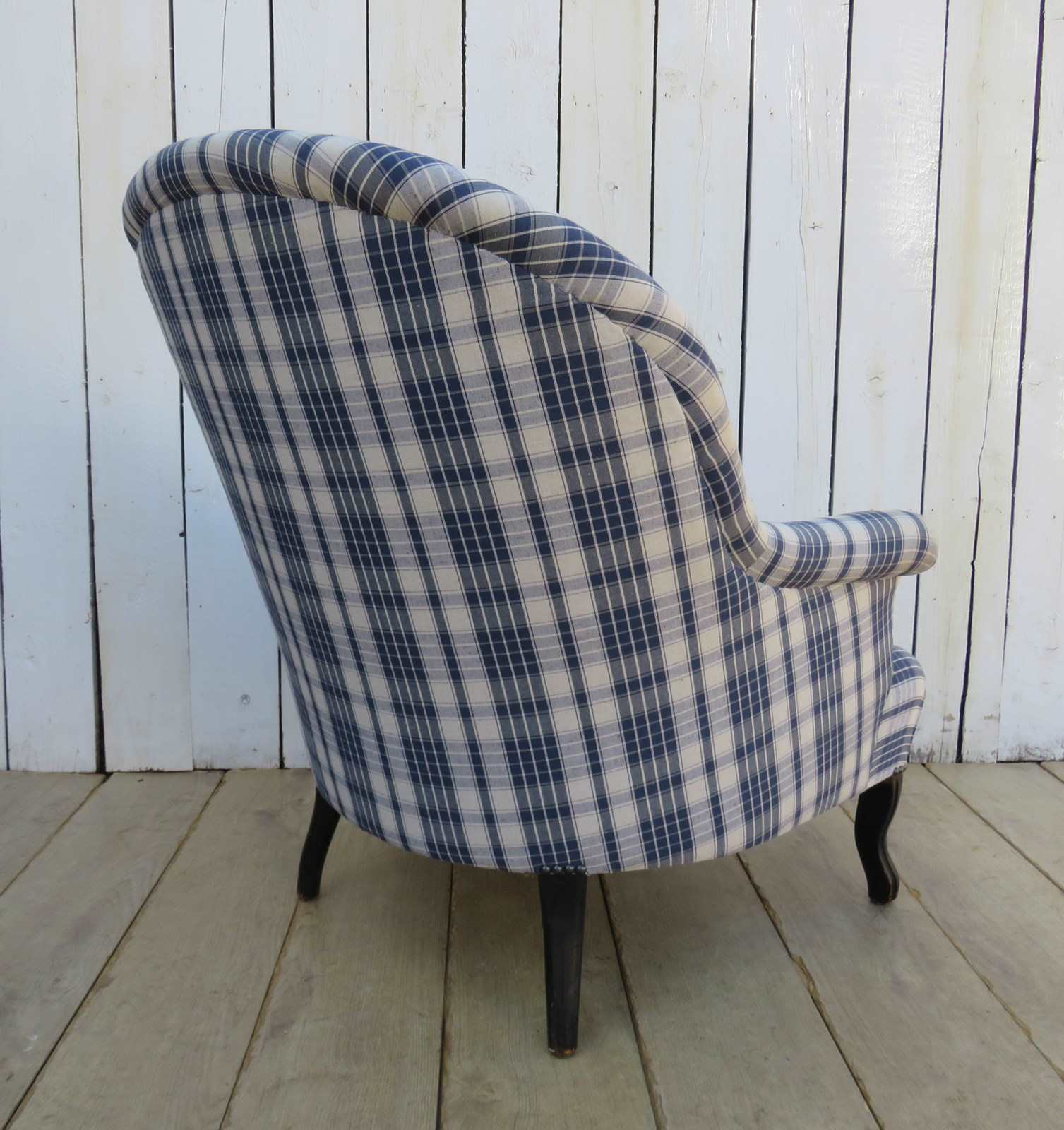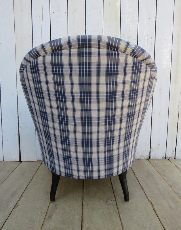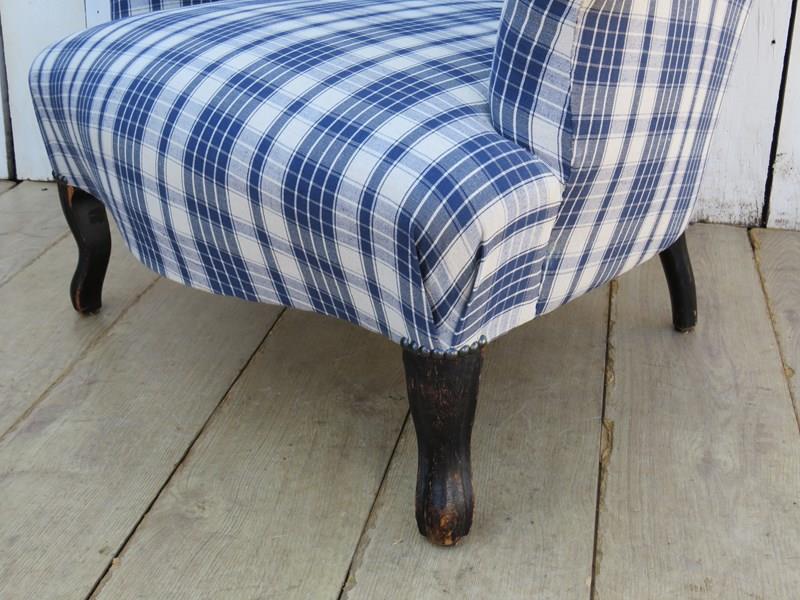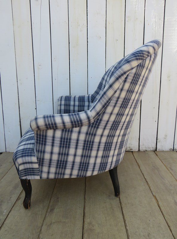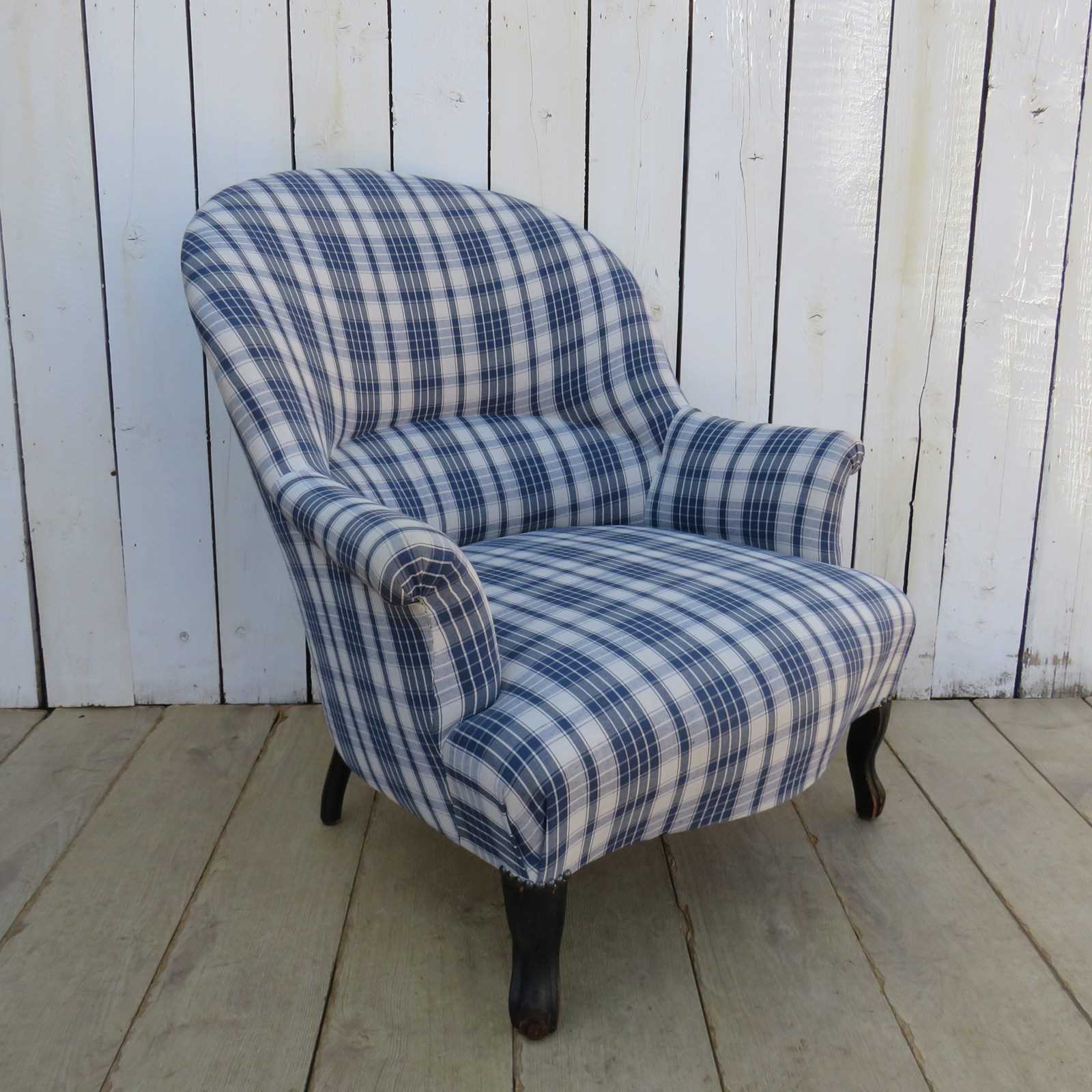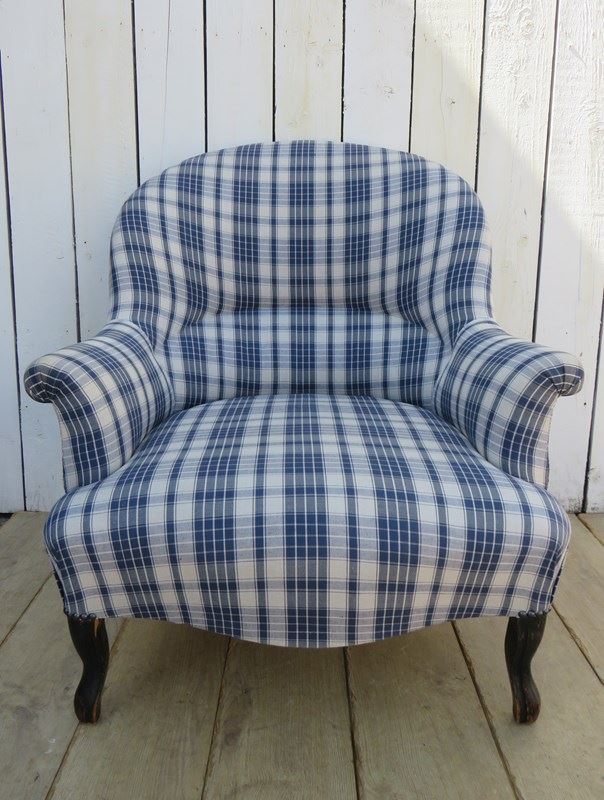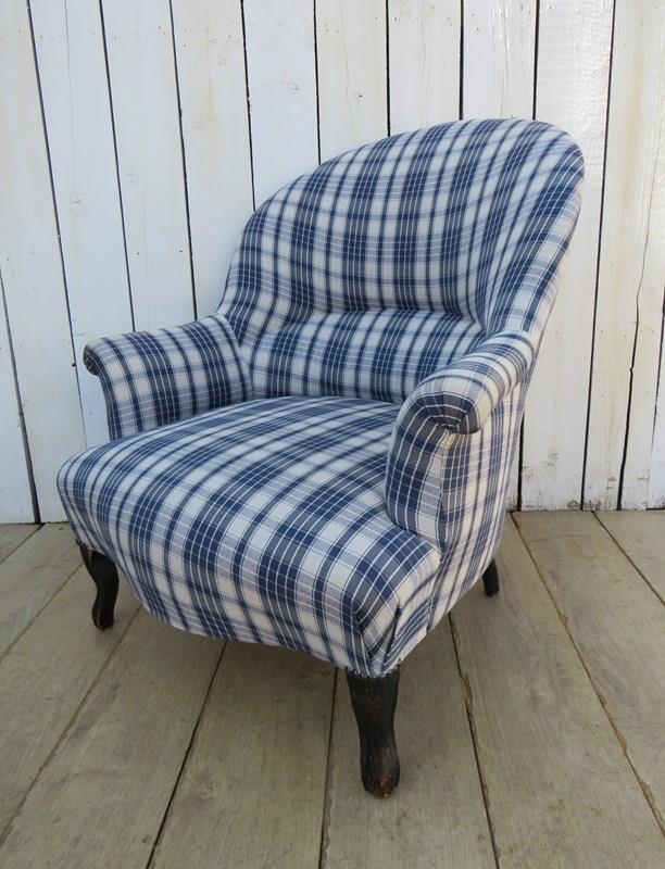 Shapely, sound, sturdy and sprung 19th century French serpentine fronted Napoleon III crapaud tub armchair on ebonized legs for either re-upholstery or used as it is. Looks like it has been upholstered recently in a linen fabric typical to the Alsace region of France. Seat height 40cm & seat depth 54cm.