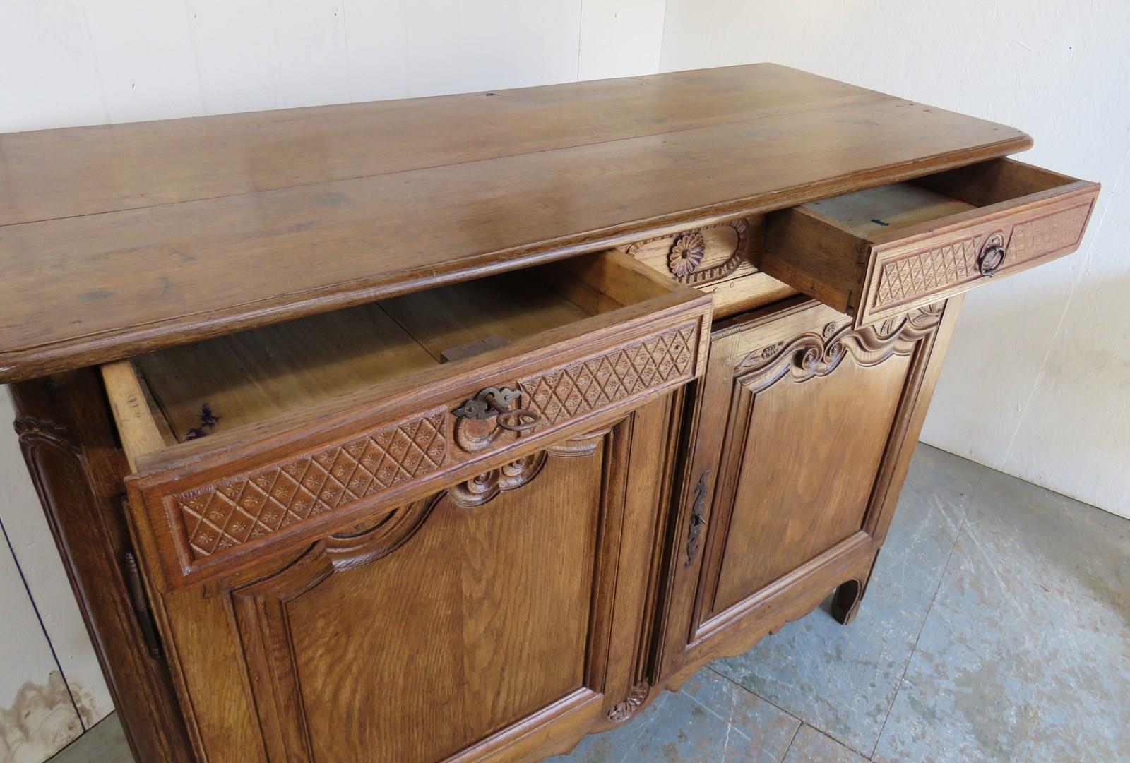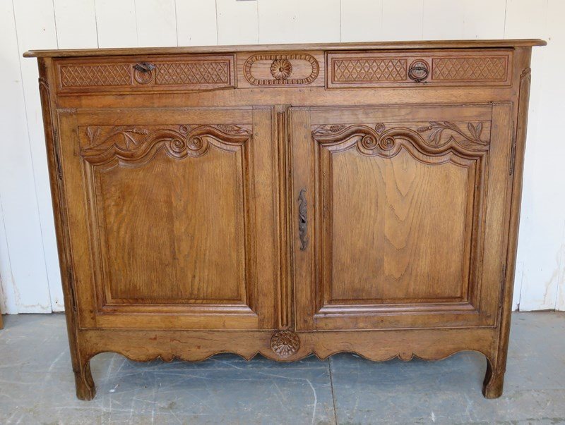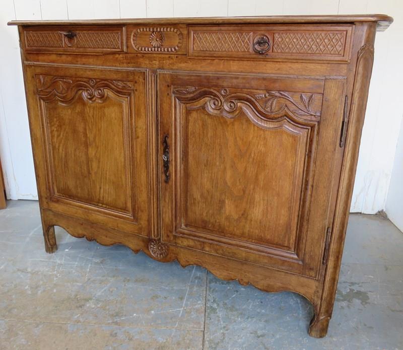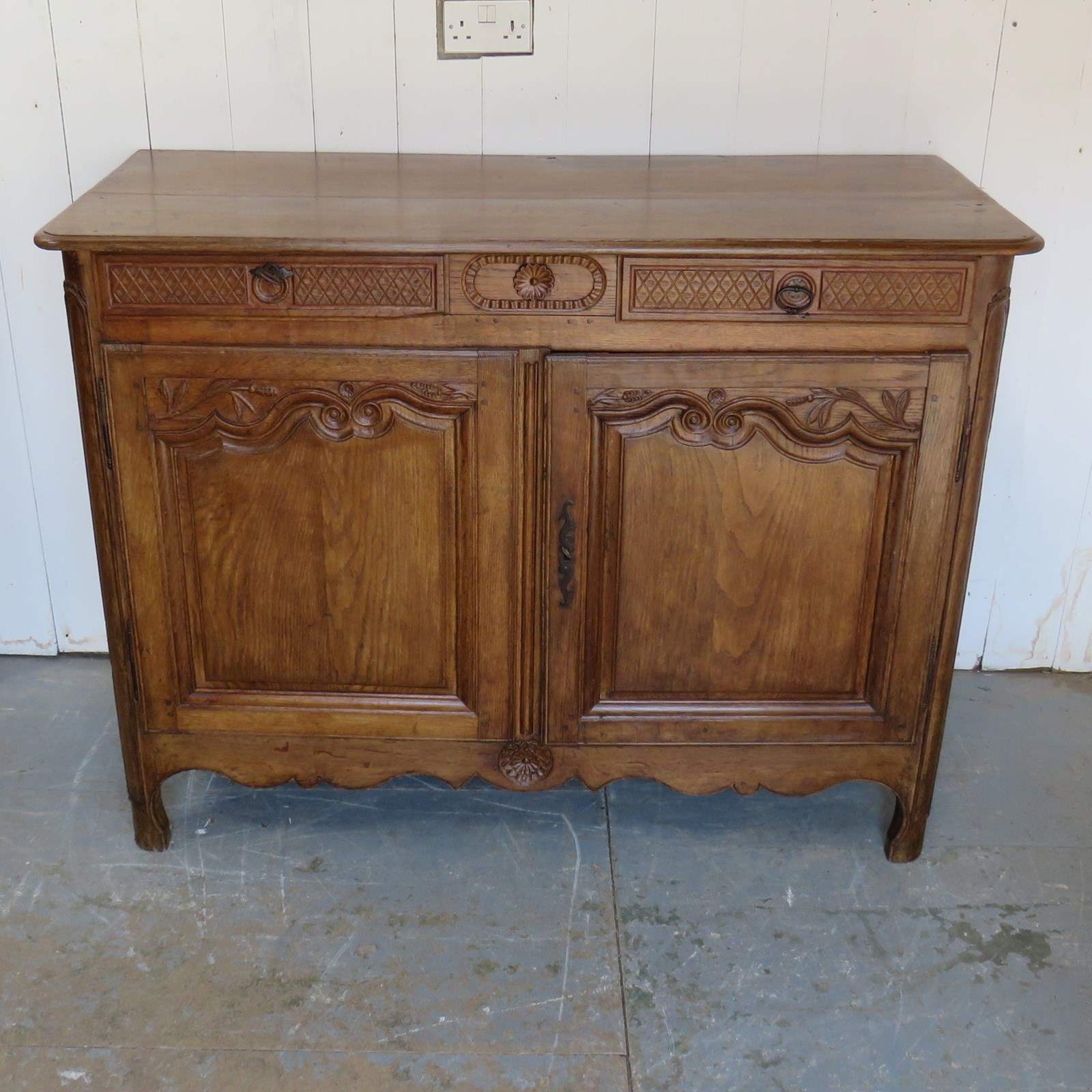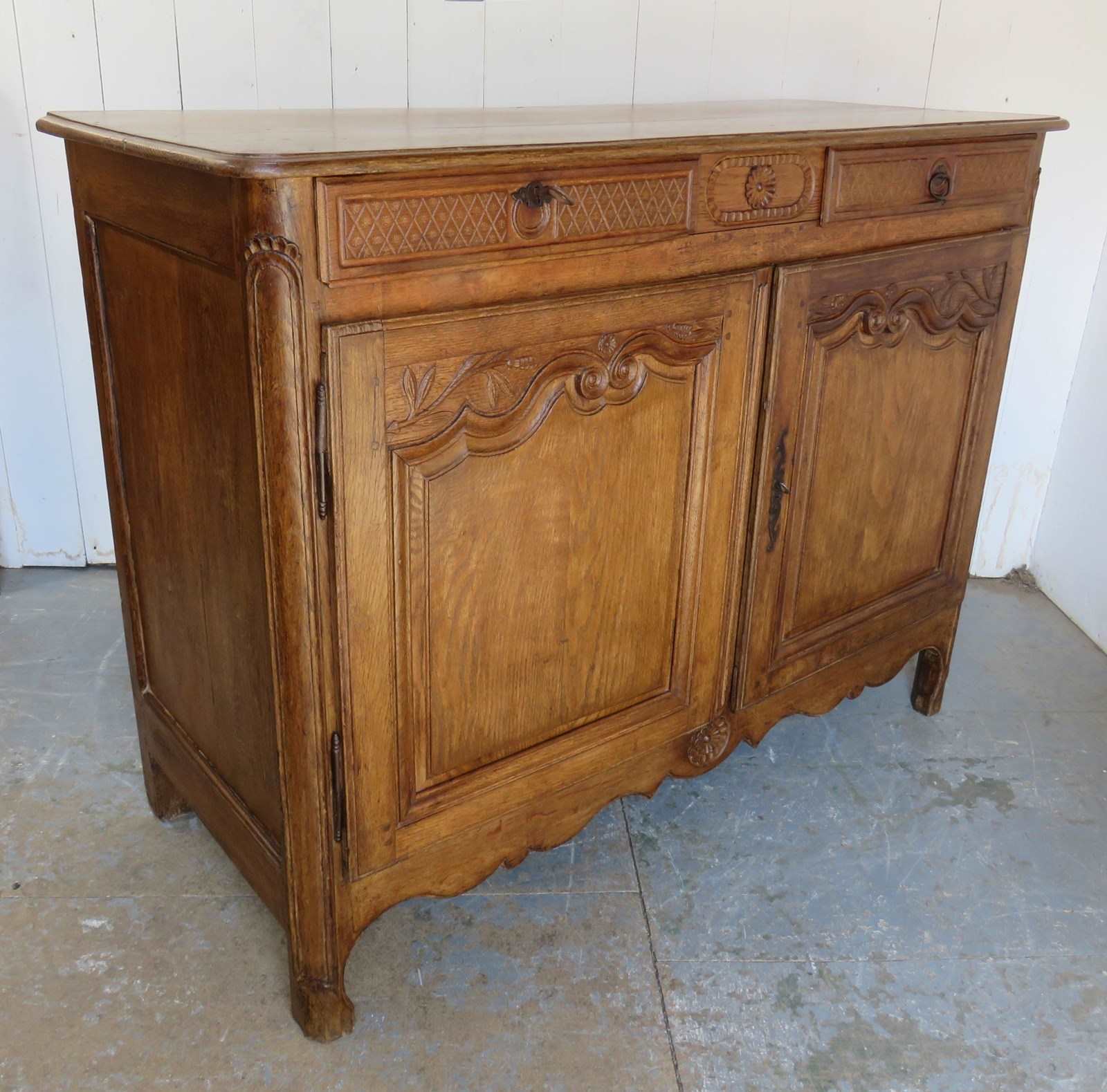 Shapely, sound and sturdy early 19th century French carved oak two door, two drawer Normandy buffet, sideboard with working locks and keys.