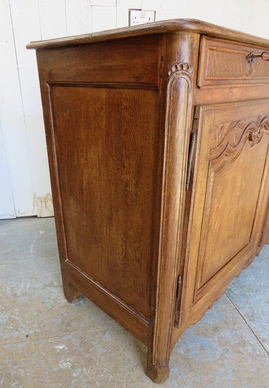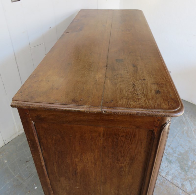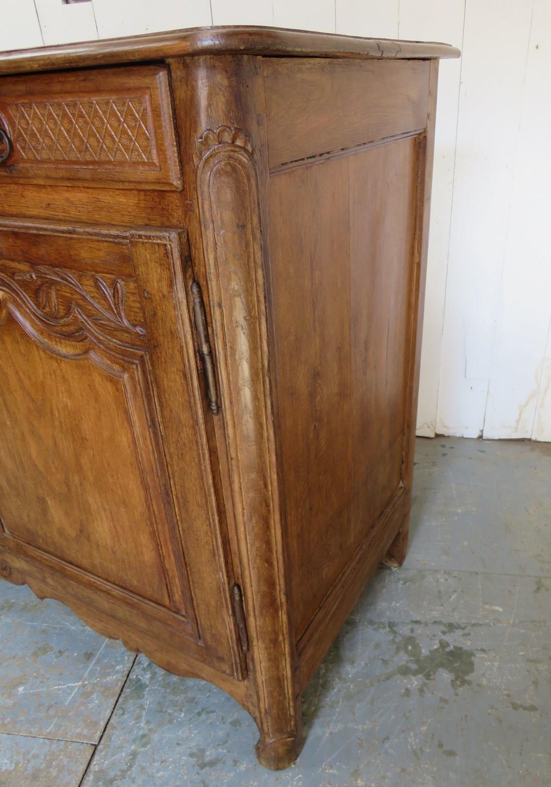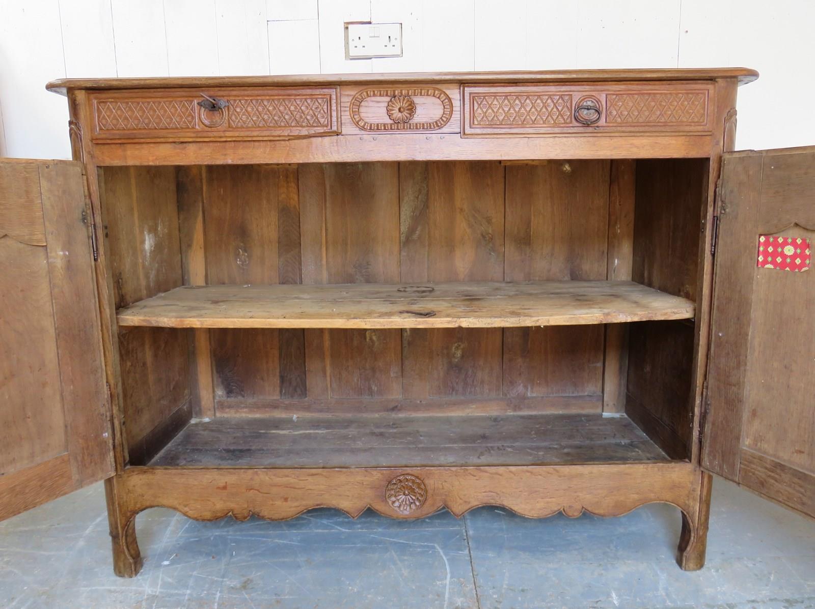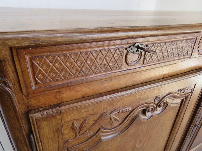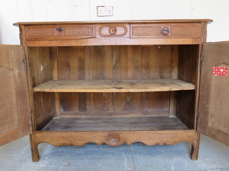 Shapely, sound and sturdy early 19th century French carved oak two door, two drawer Normandy buffet, sideboard with working locks and keys.