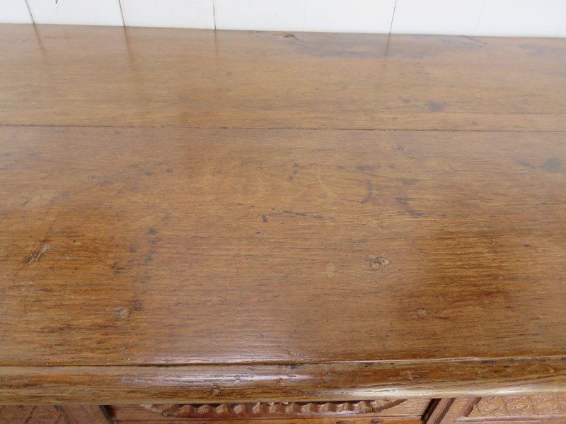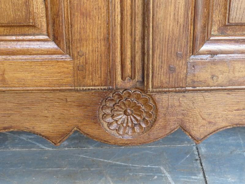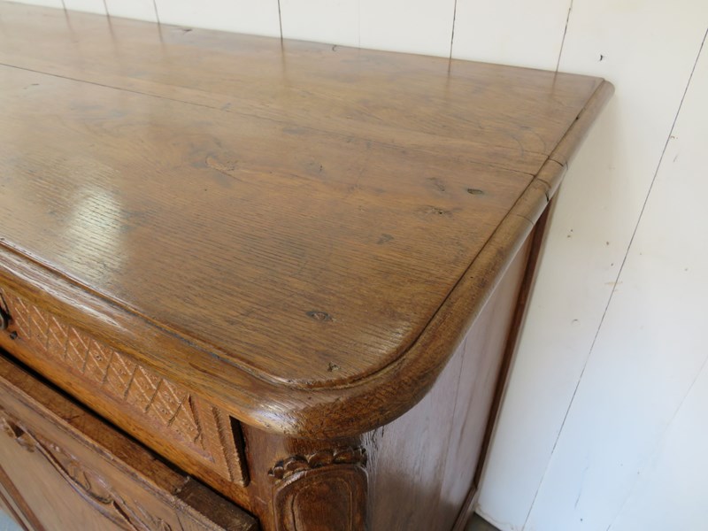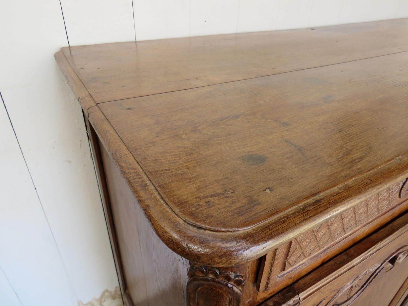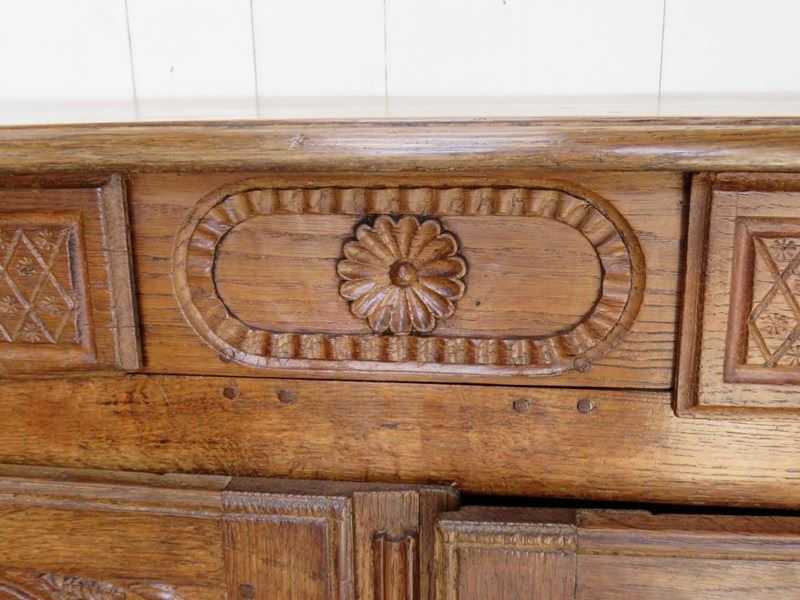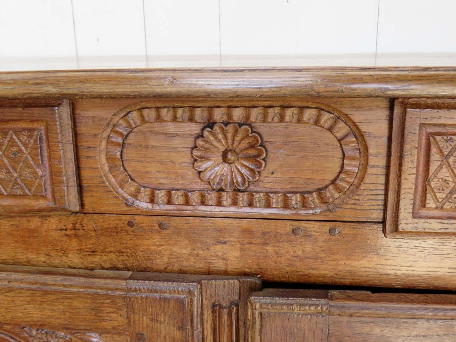 Shapely, sound and sturdy early 19th century French carved oak two door, two drawer Normandy buffet, sideboard with working locks and keys.