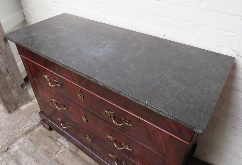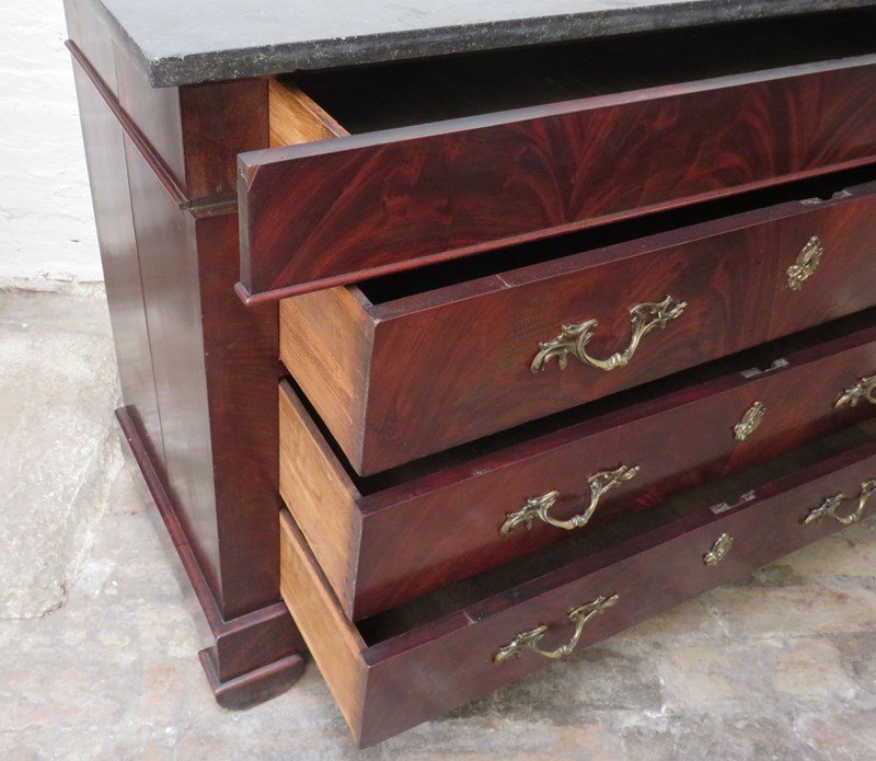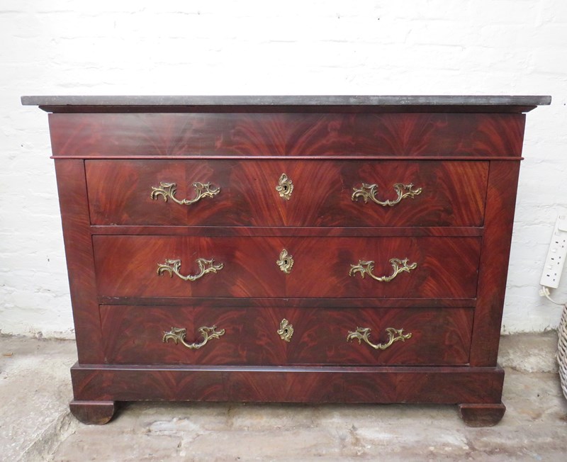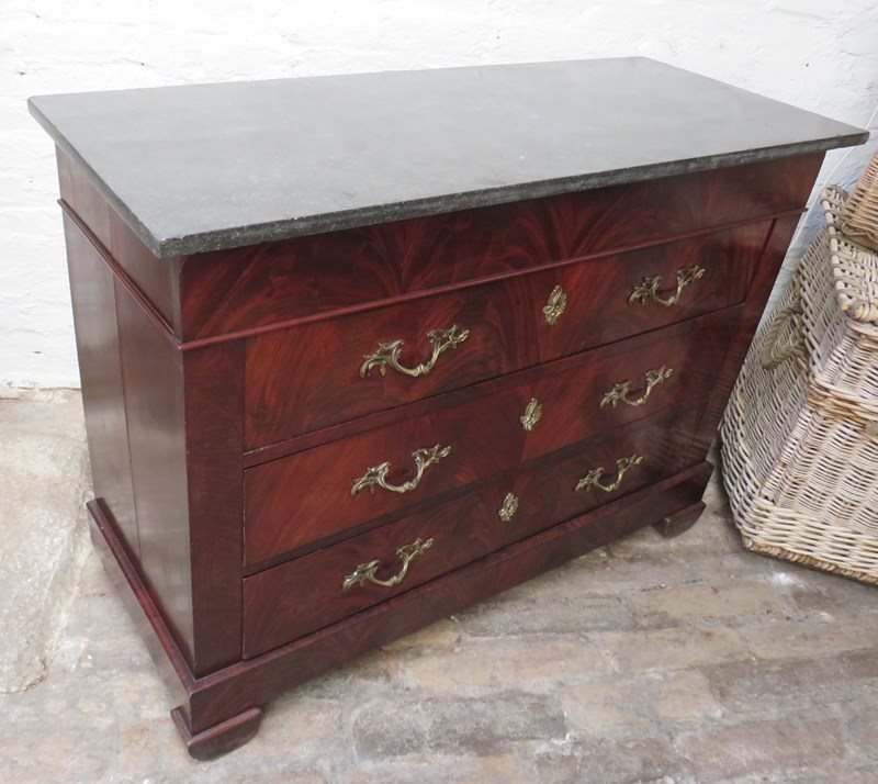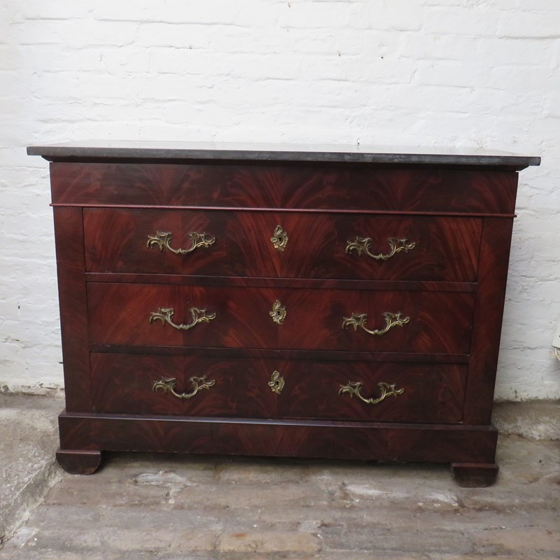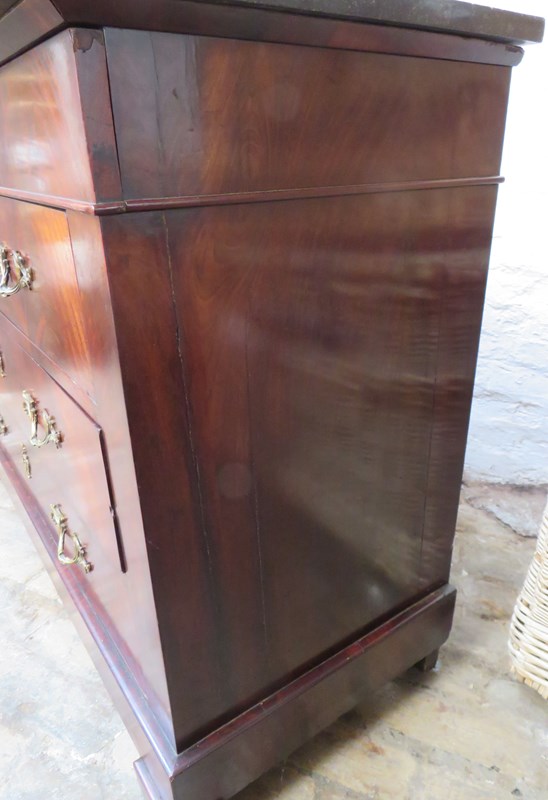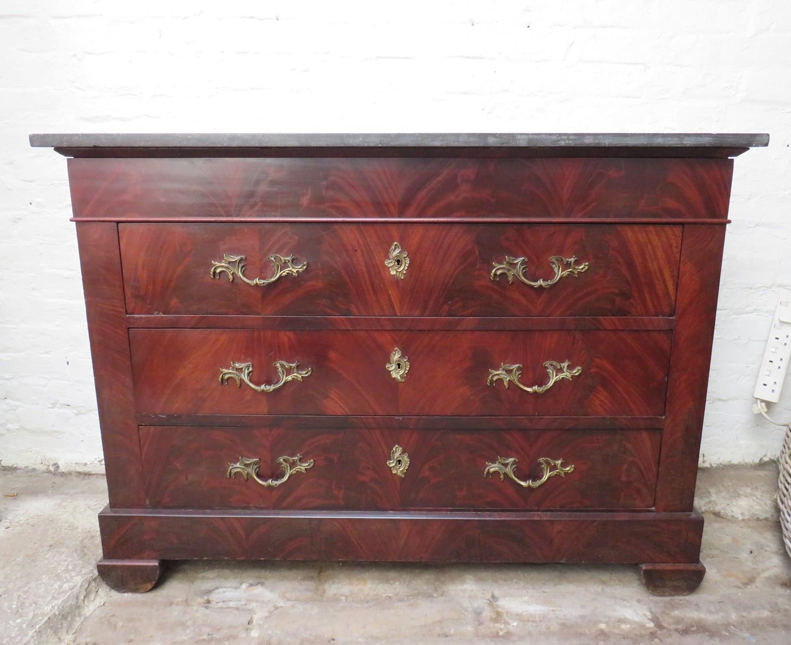 Shapely, sound and sturdy 19th century French four drawer flame mahogany and marble top commode, chest of drawers. Some age related wear and splits to the sides.