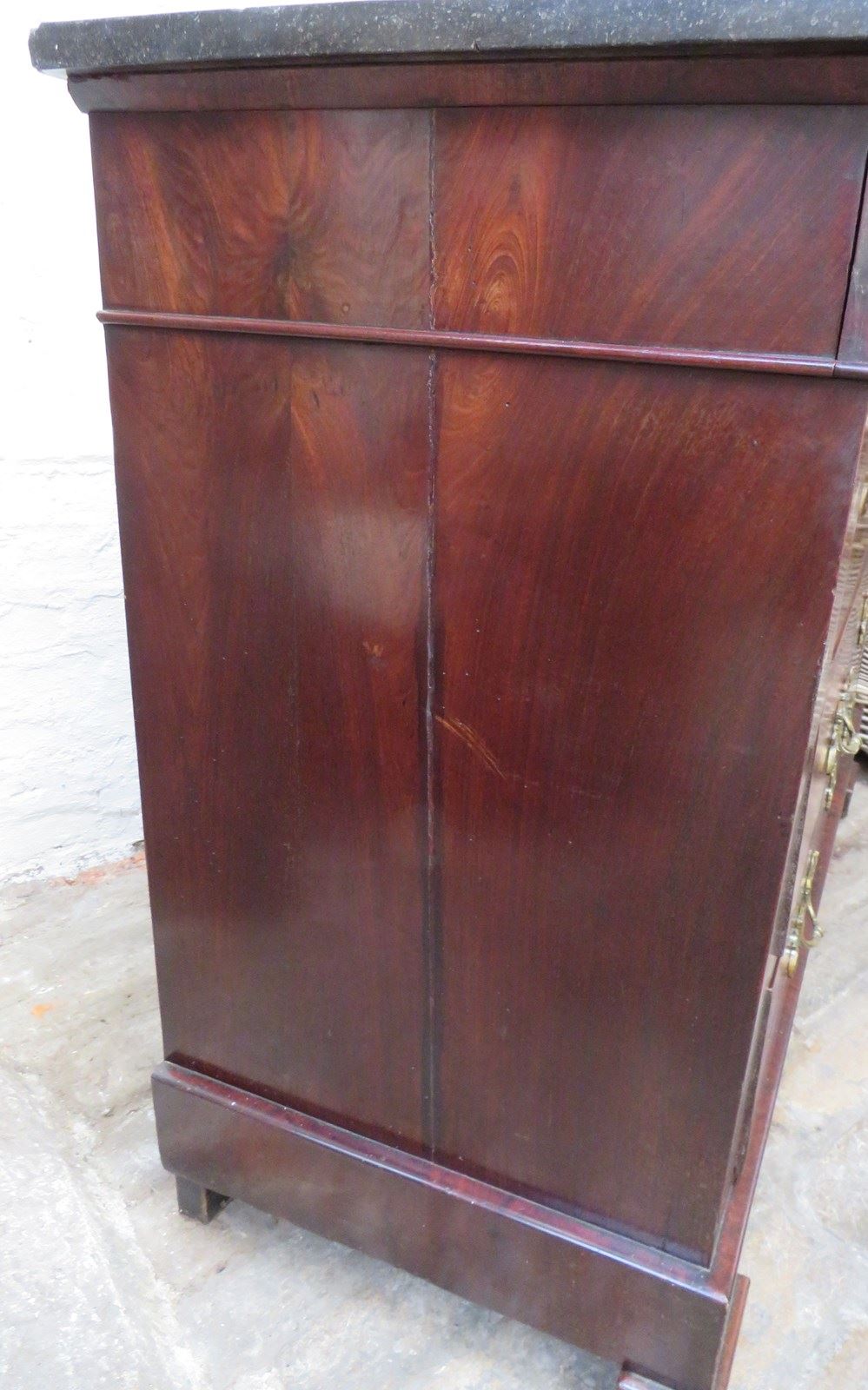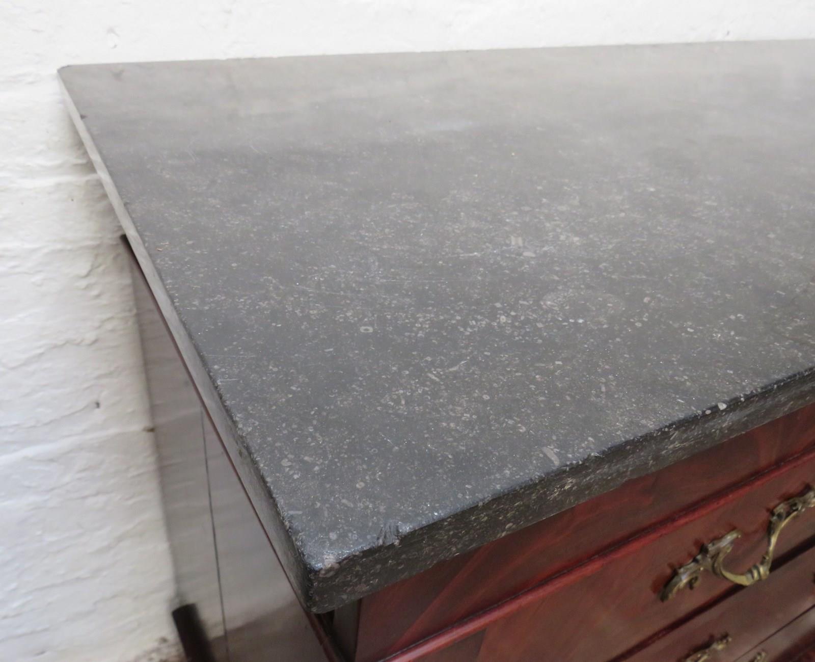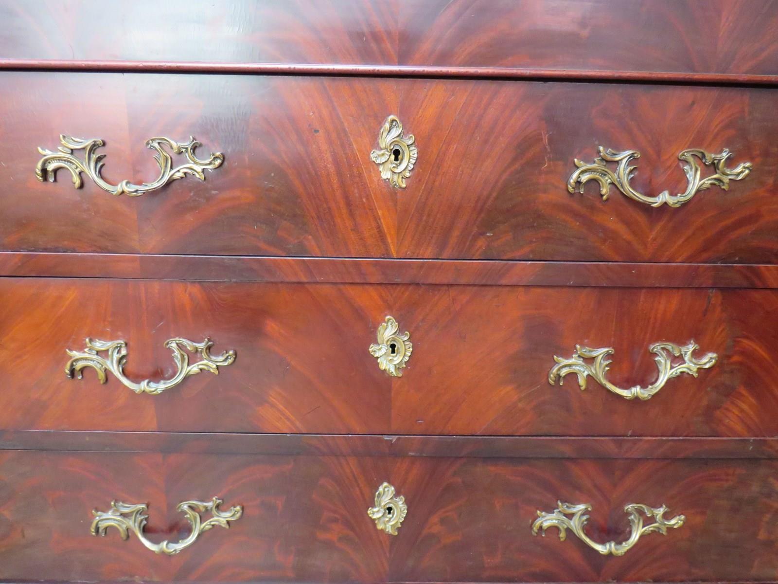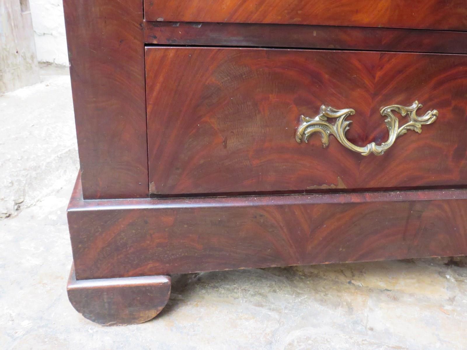 Shapely, sound and sturdy 19th century French four drawer flame mahogany and marble top commode, chest of drawers. Some age related wear and splits to the sides.