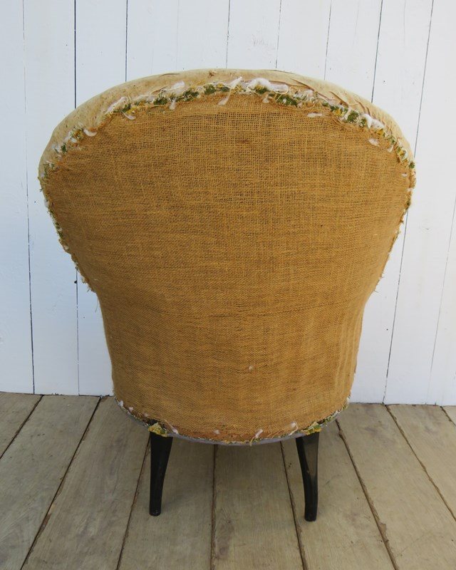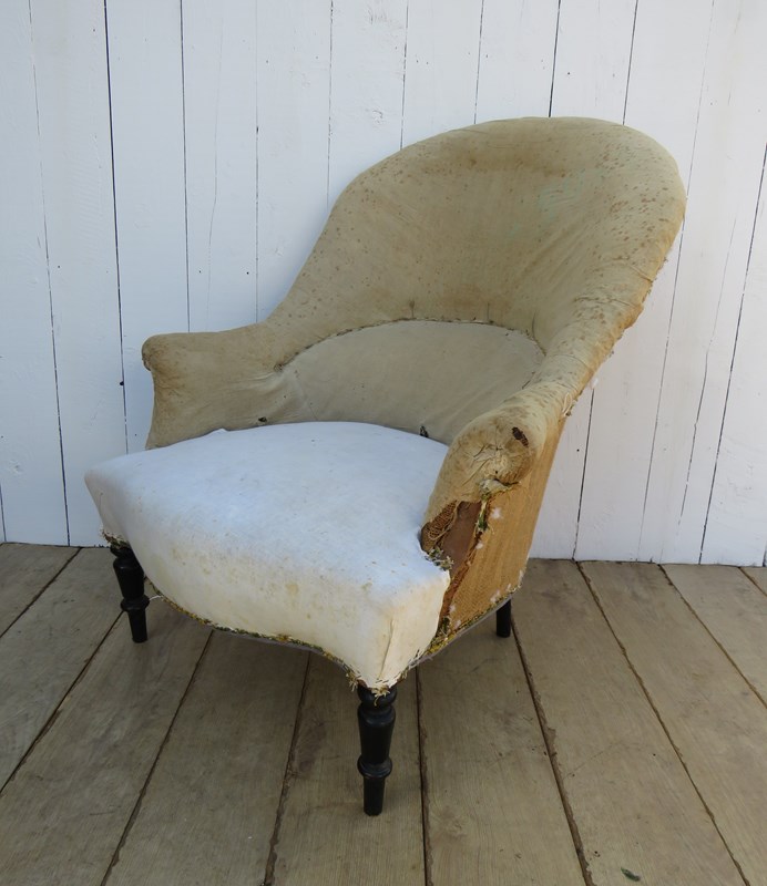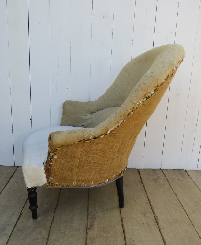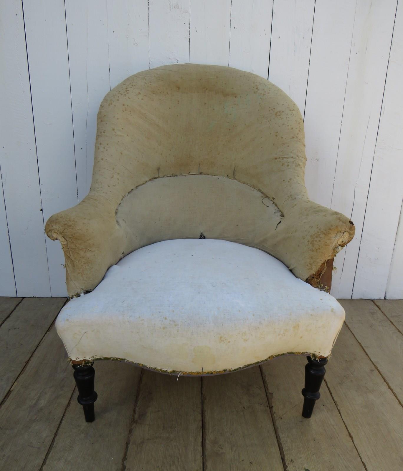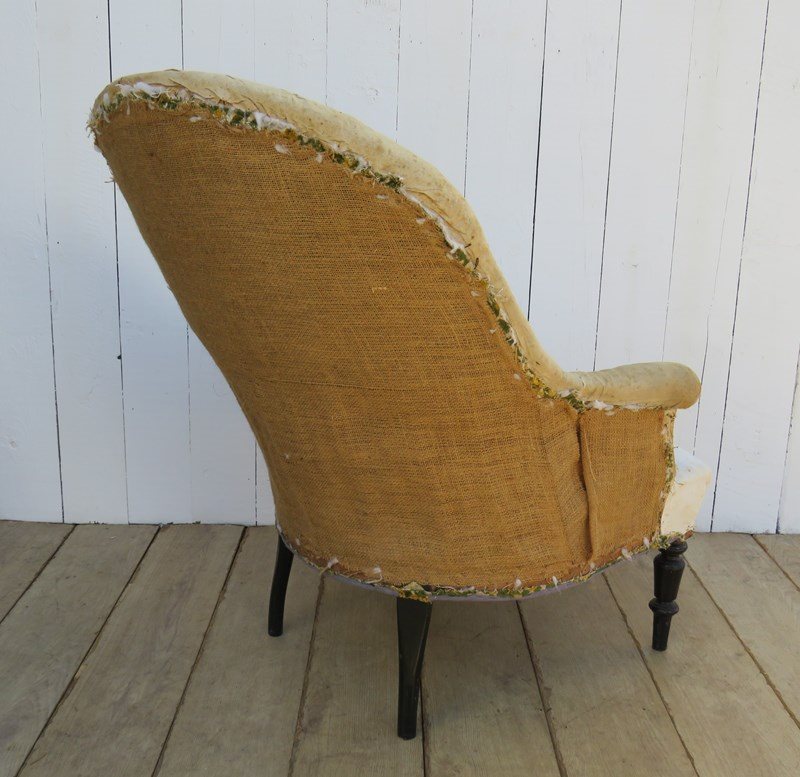 Shapely, sound, sturdy and sprung 19th century French high back serpentine fronted Napoleon III crapaud tub armchair on ebonised legs for re-upholstery. Seat height 42cm & seat depth 54cm.