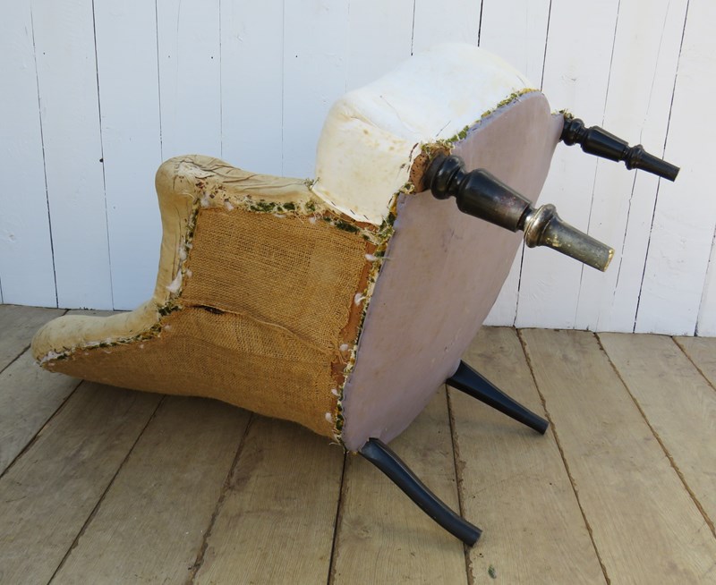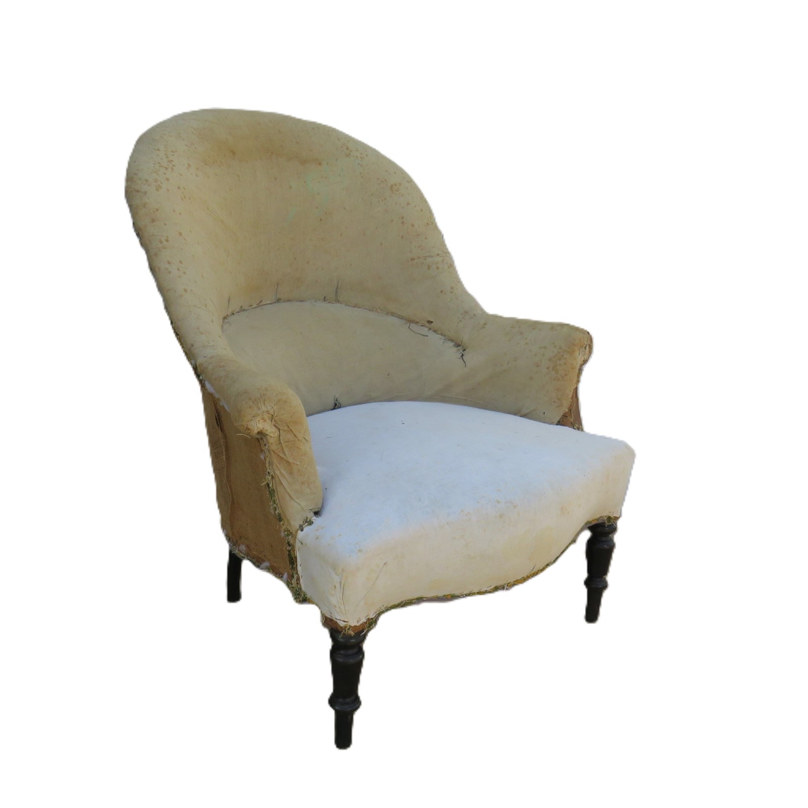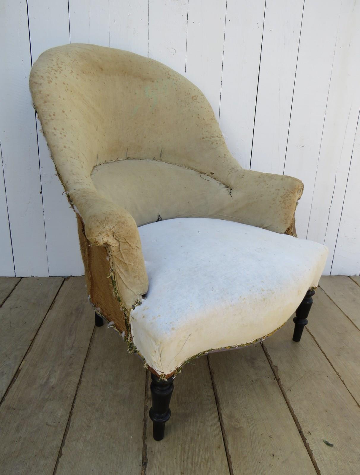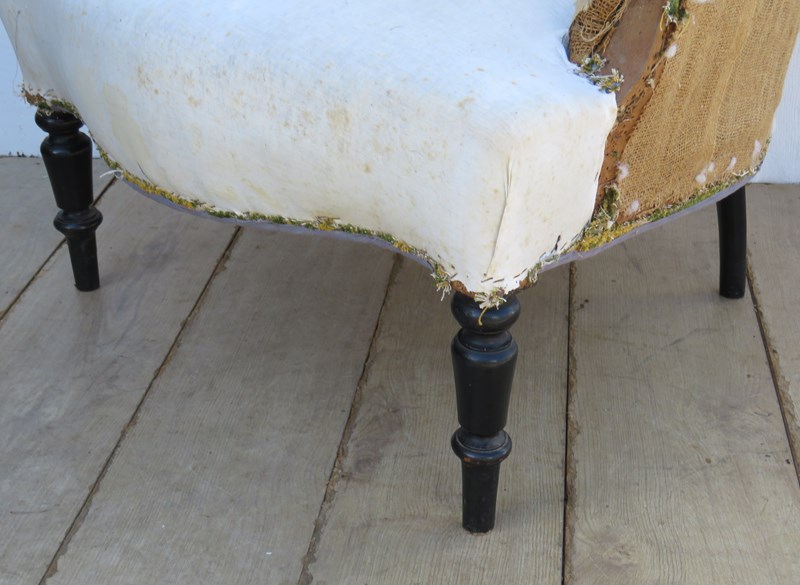 Shapely, sound, sturdy and sprung 19th century French high back serpentine fronted Napoleon III crapaud tub armchair on ebonised legs for re-upholstery. Seat height 42cm & seat depth 54cm.