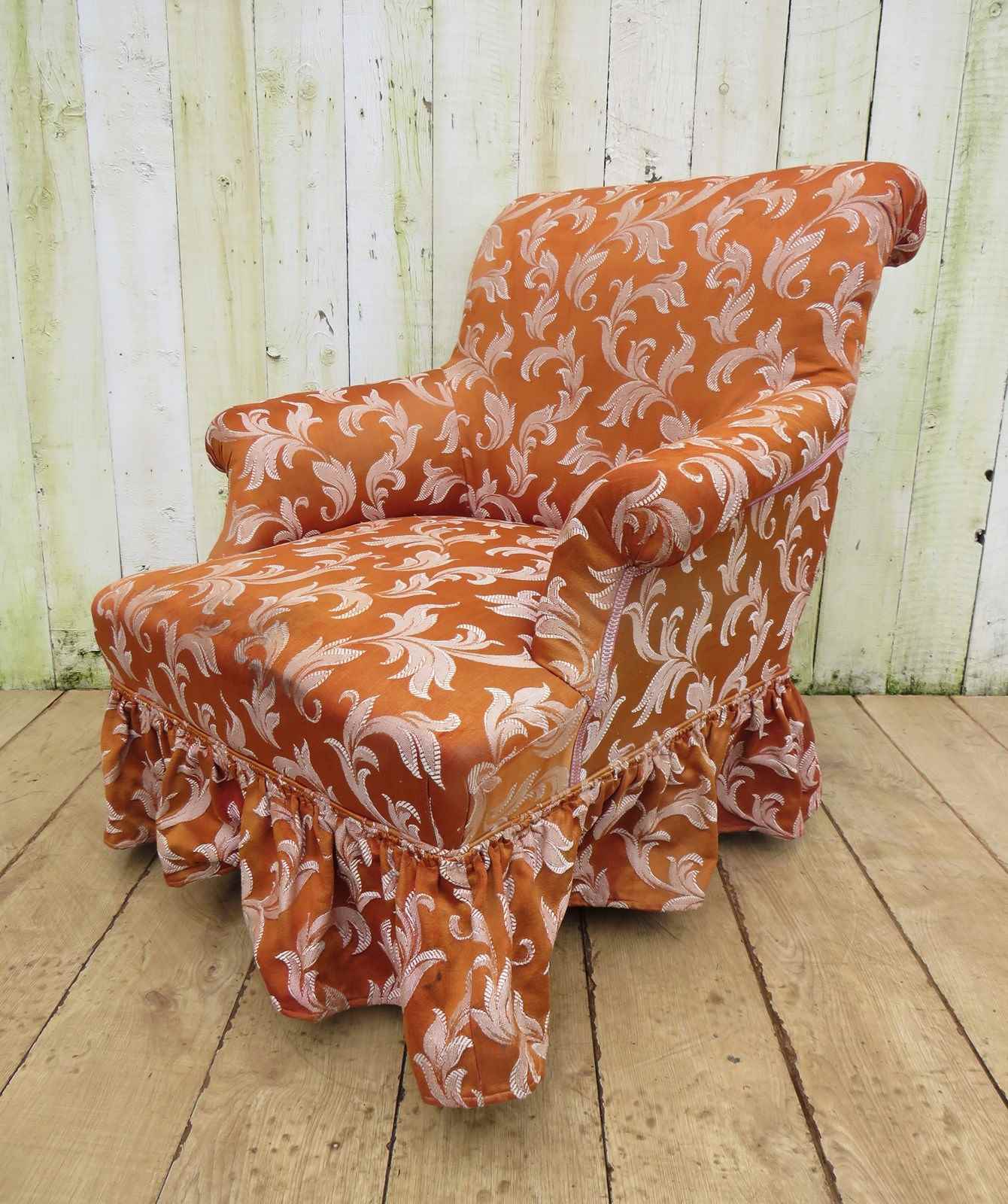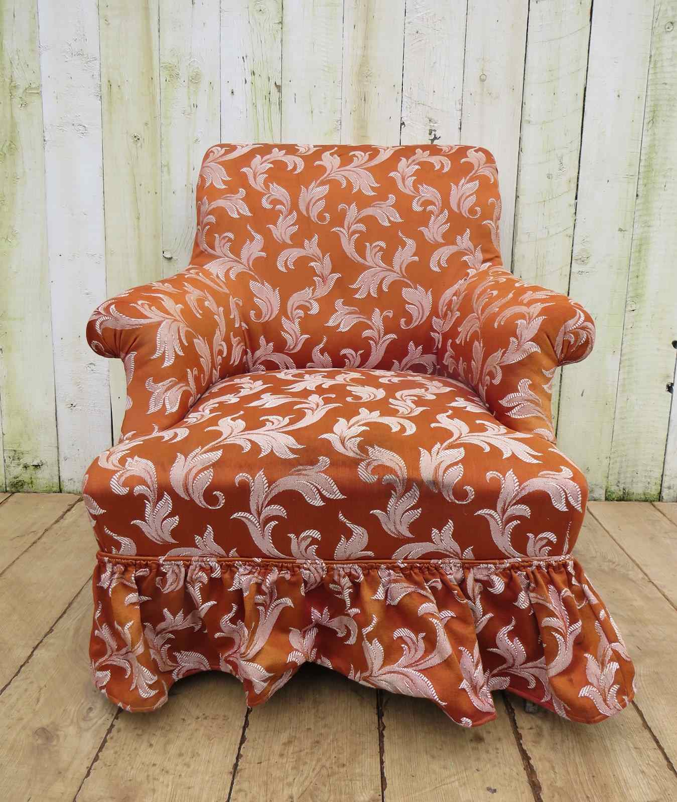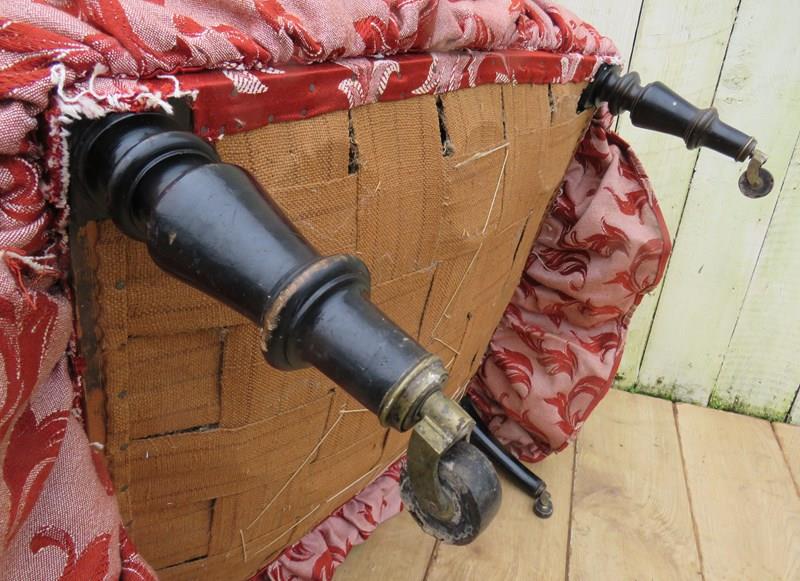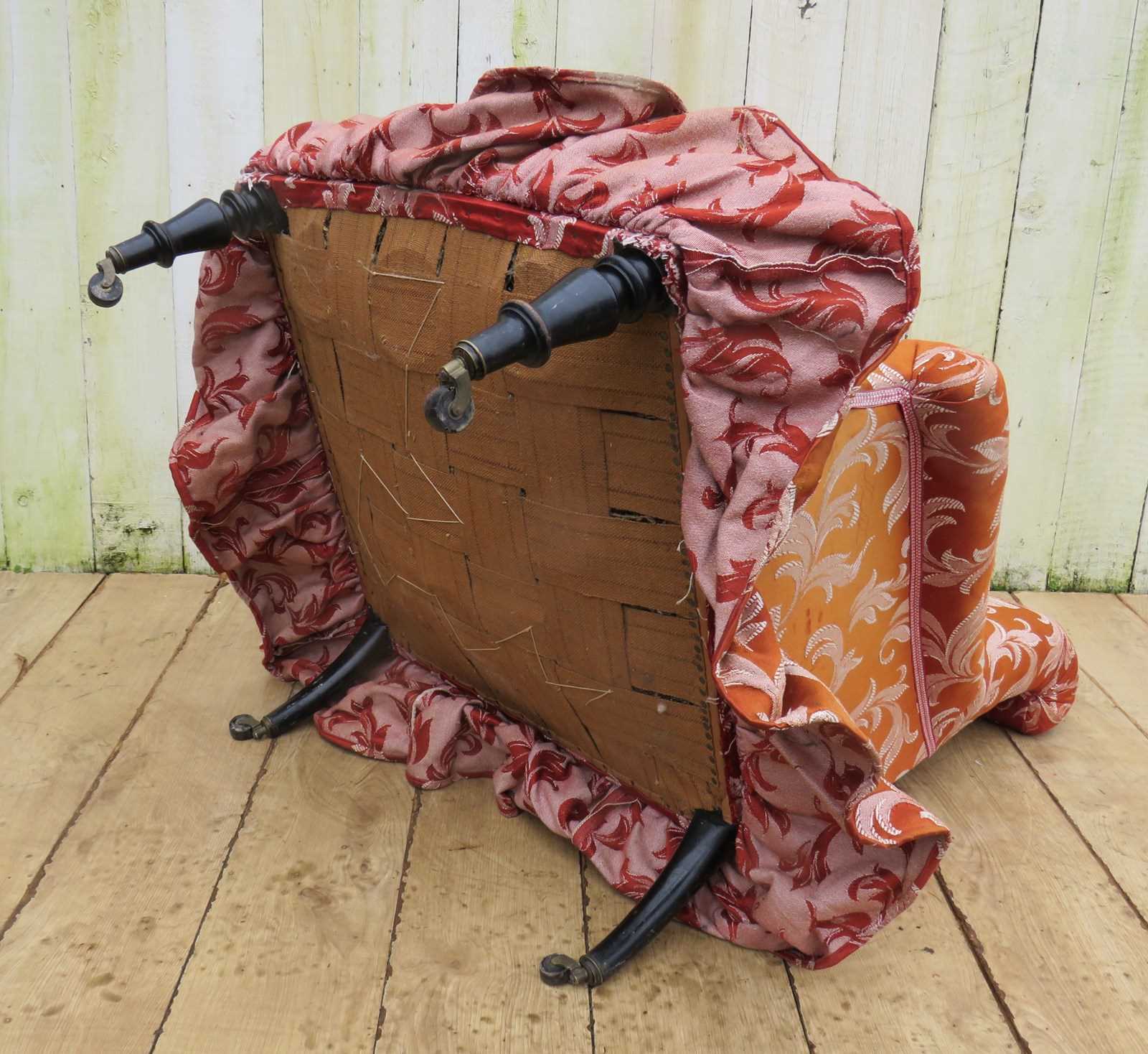 Large shapely, sound, sturdy and sprung 19th century French deep seated scroll top Napoleon III library armchair on ebonised legs and castors for re-upholstery or used as it is with a clean to the upholstery. Seat height 42cm & seat depth 60cm.