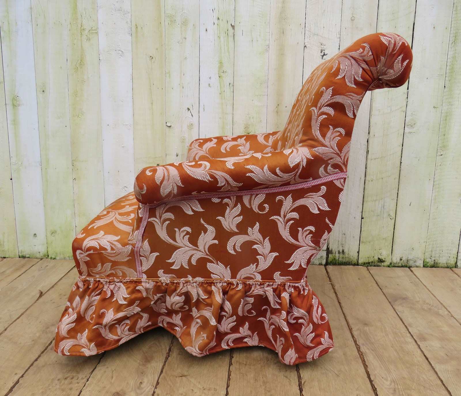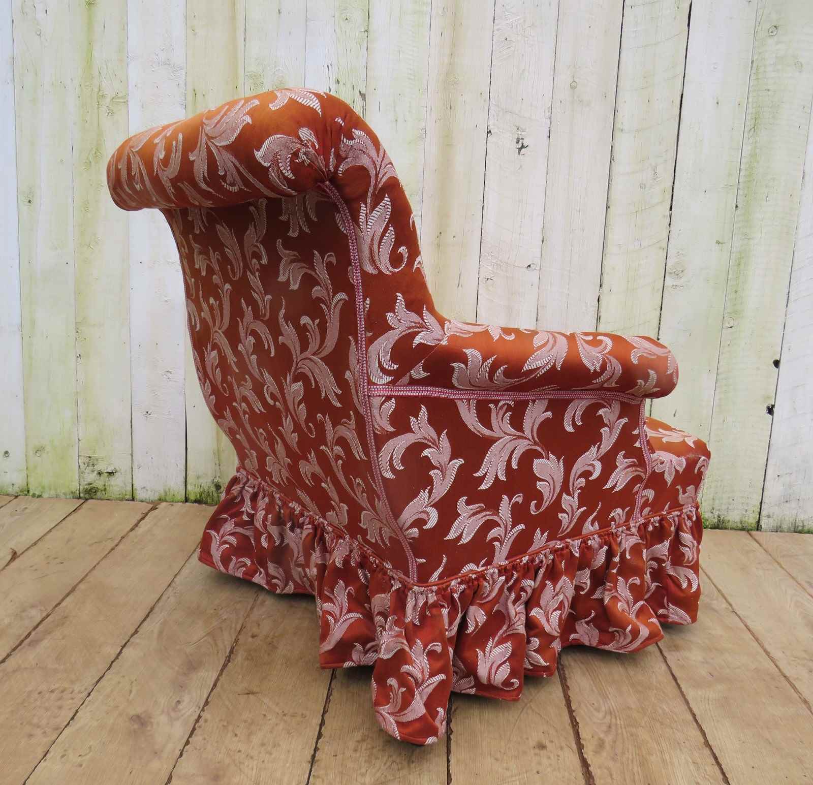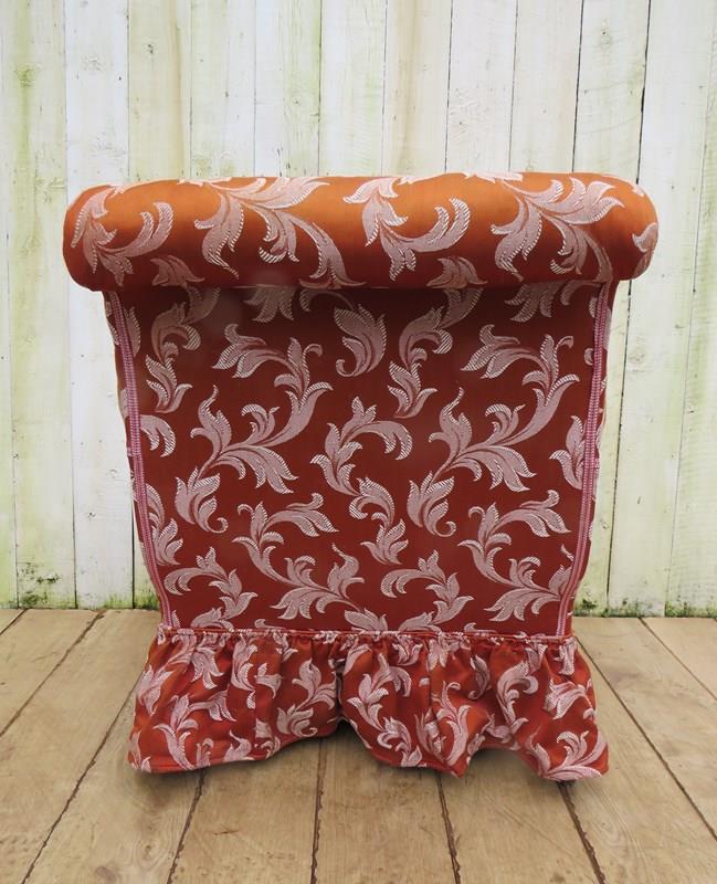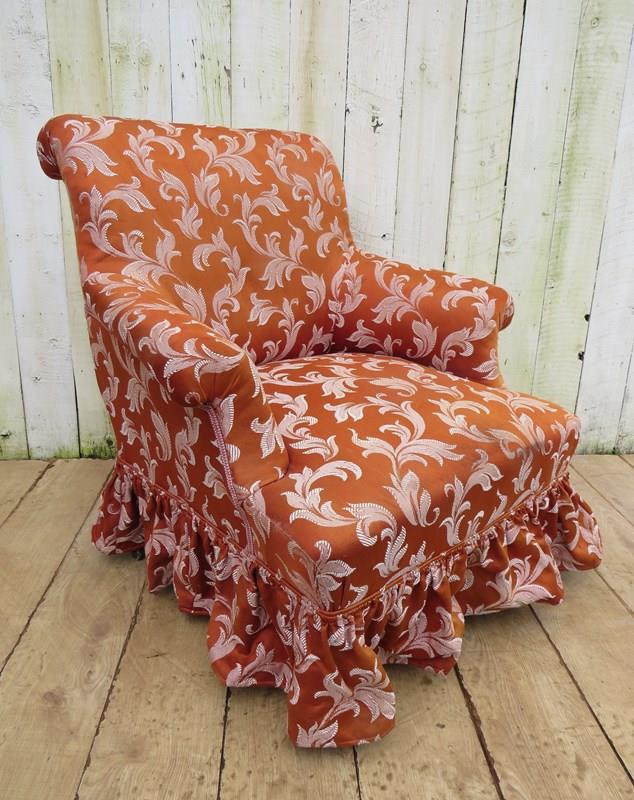 Large shapely, sound, sturdy and sprung 19th century French deep seated scroll top Napoleon III library armchair on ebonised legs and castors for re-upholstery or used as it is with a clean to the upholstery. Seat height 42cm & seat depth 60cm.