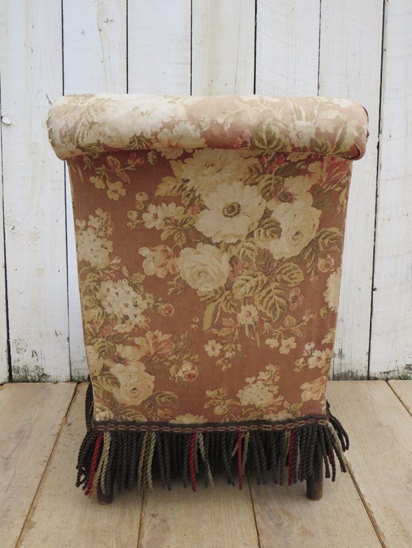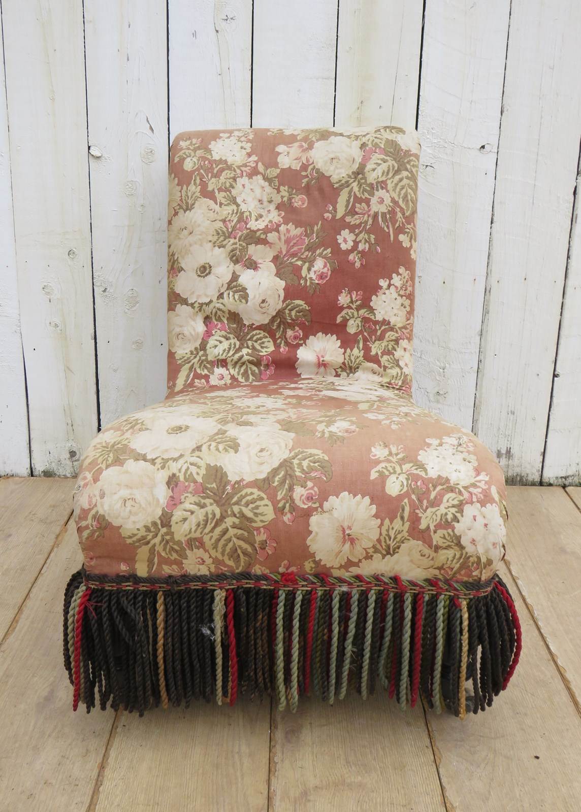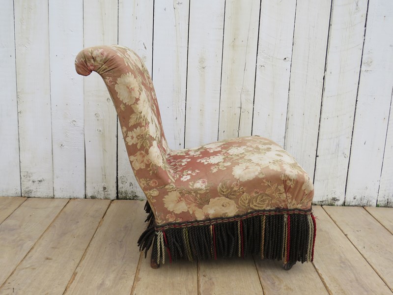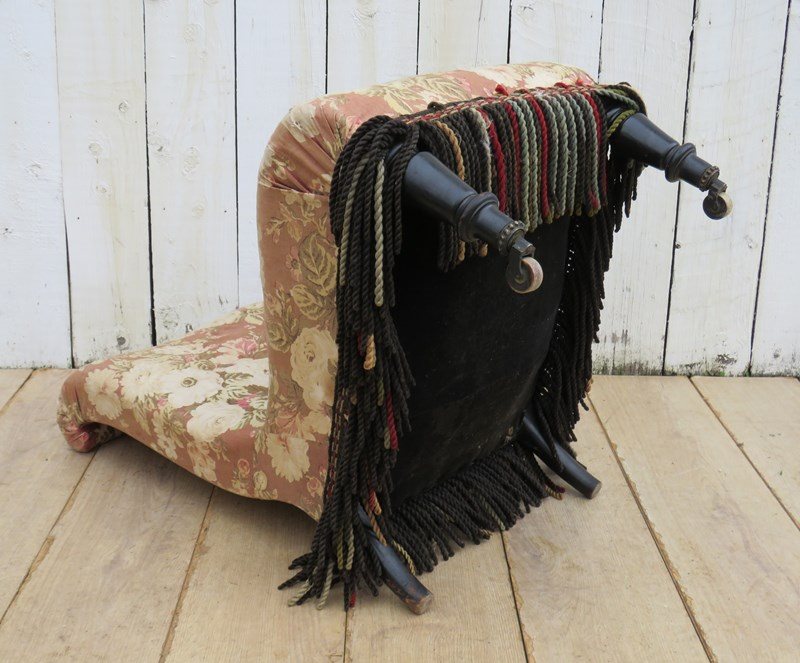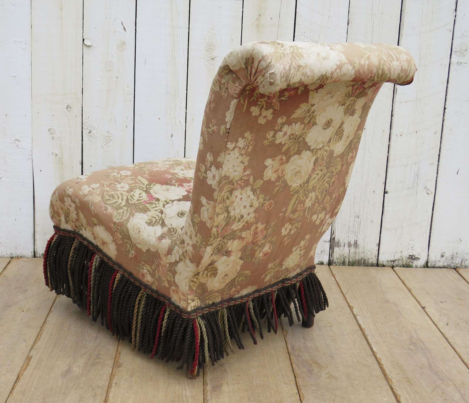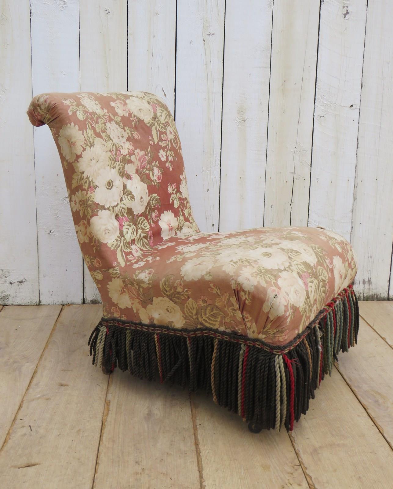 Shapely, sound and sturdy 19th century French scroll top Napoleon III chauffeuse slipper, nursing chair on ebonised legs and castors to the front for re-upholstery. Seat height 36cm & seat depth 46cm.