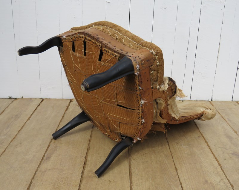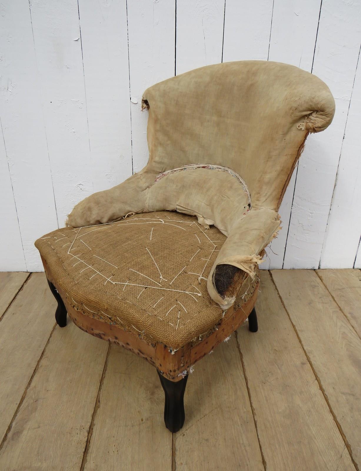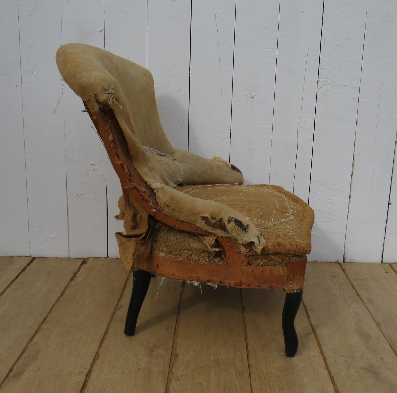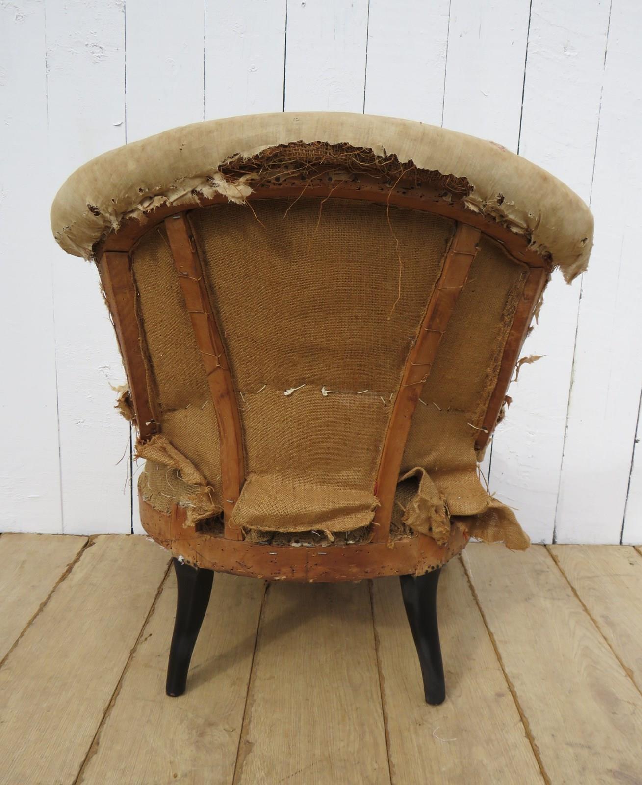 Shapely, sound, sturdy and sprung 19th century French serpentine fronted Napoleon III crapaud slipper, nursing, boudoir, tub armchair on ebonised legs for re-upholstery. Seat height 36cm & seat depth 43cm.